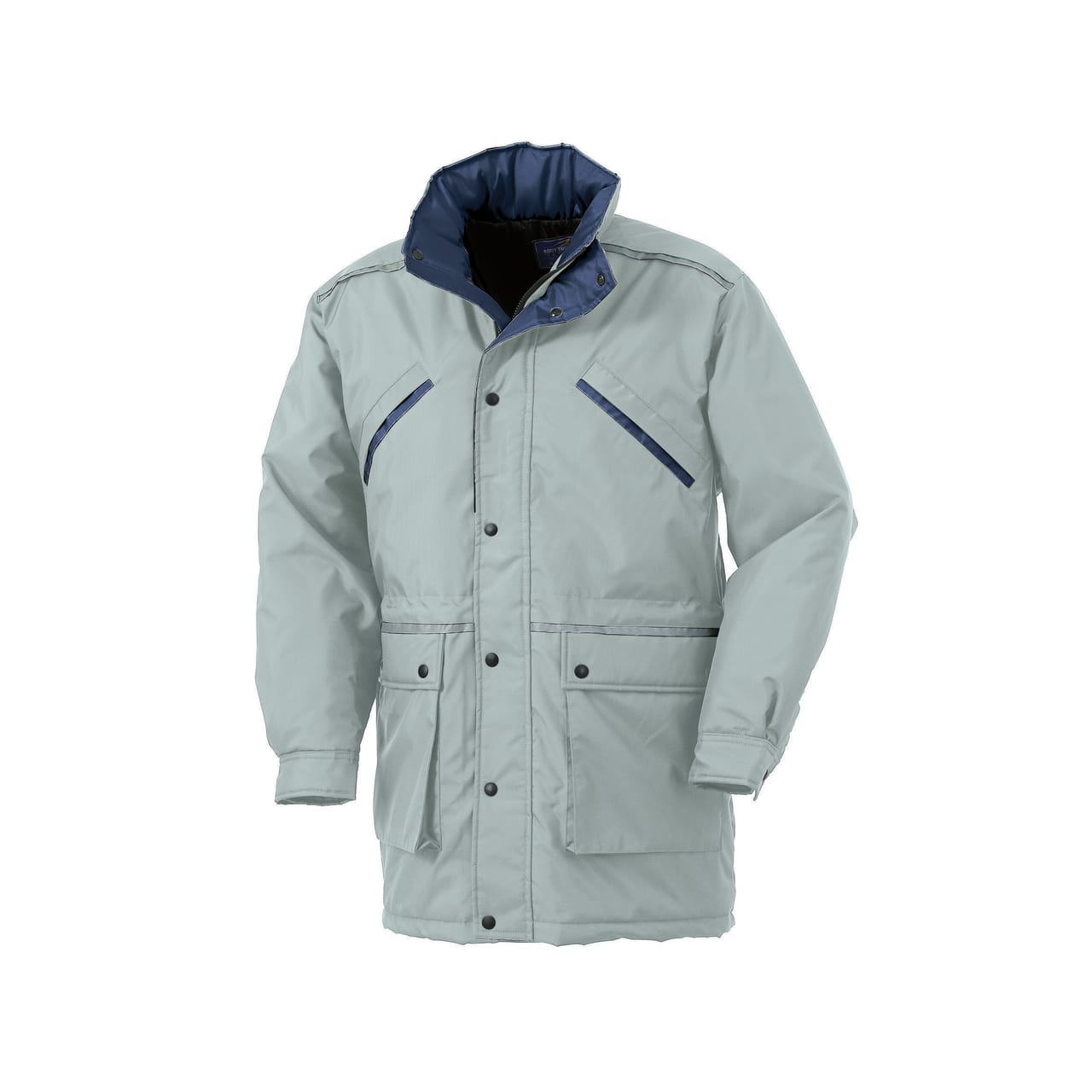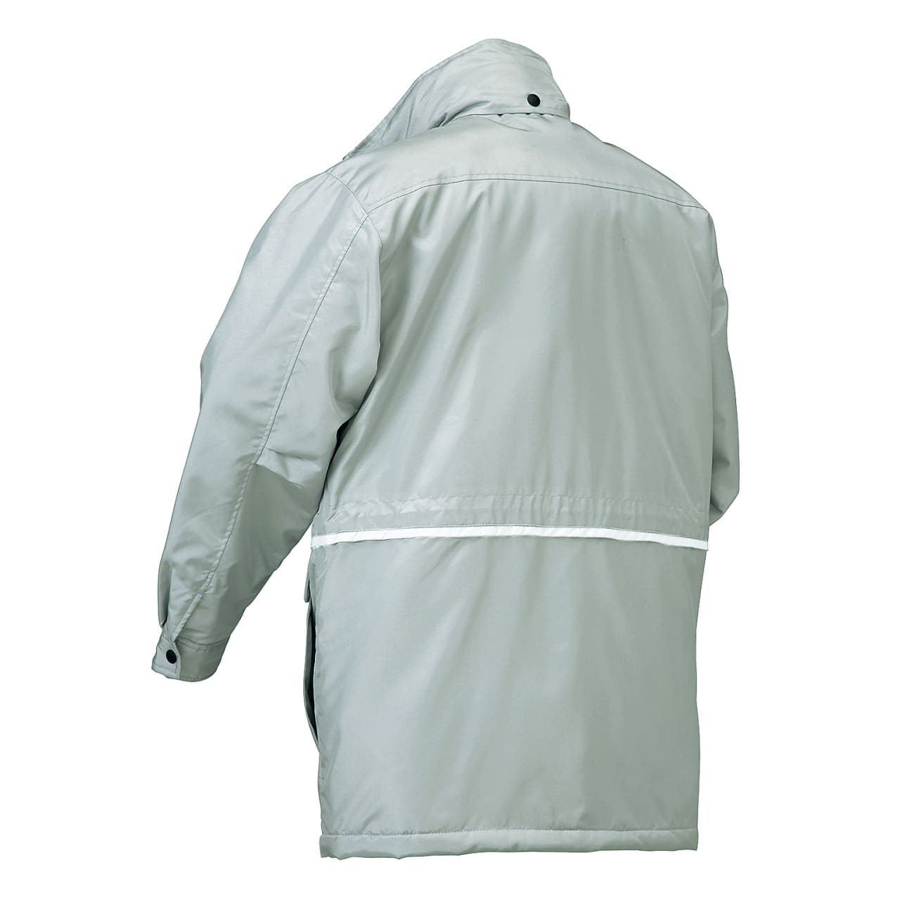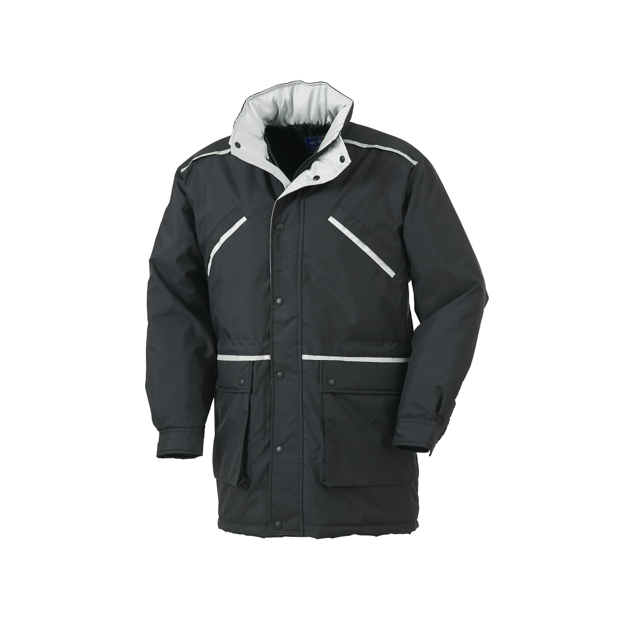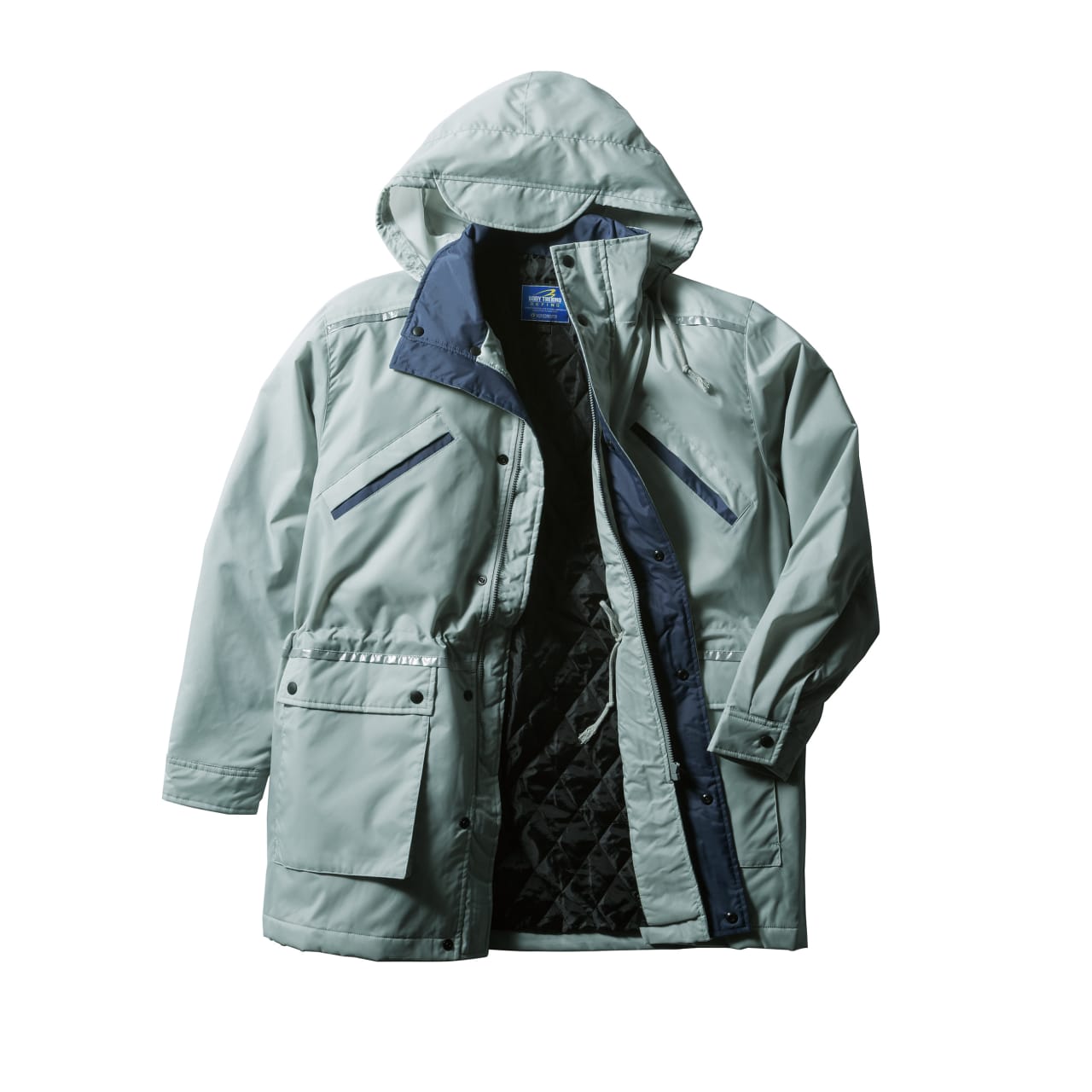ナイロン素材とキルティング加工でできた保温性の高い防寒コートです。表地のナイロン素材は軽く、裏地にキルティングを施すことで保温性を確保しています。また、前立て部分にはファスナーとボタンが設置されており、気候に応じてしっかりと閉めておくことで、防寒対策ができます。フードは収納式で気候に合わせて取り外し時の管理が便利です。夜間の作業や業務の安全性を確保する反射テープも設置。再帰反射生地「ミラール」を使用して視認性を高めています。カラーバリエーションはネイビー、ダークグレー、ブラックの3色、サイズはM〜5Lが用意されています。