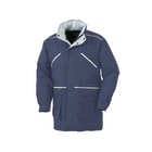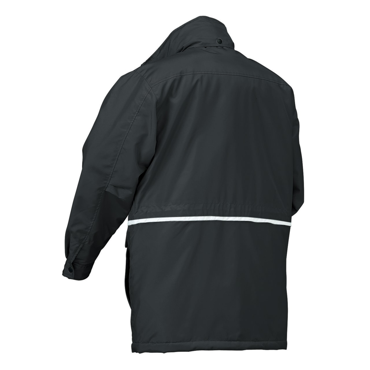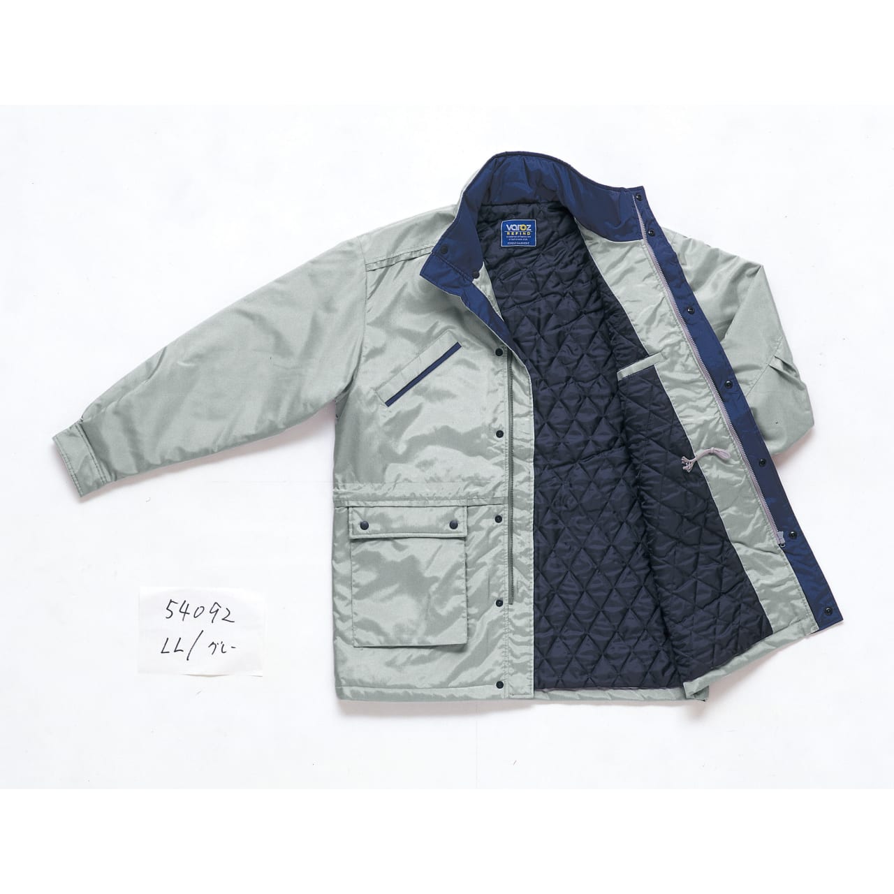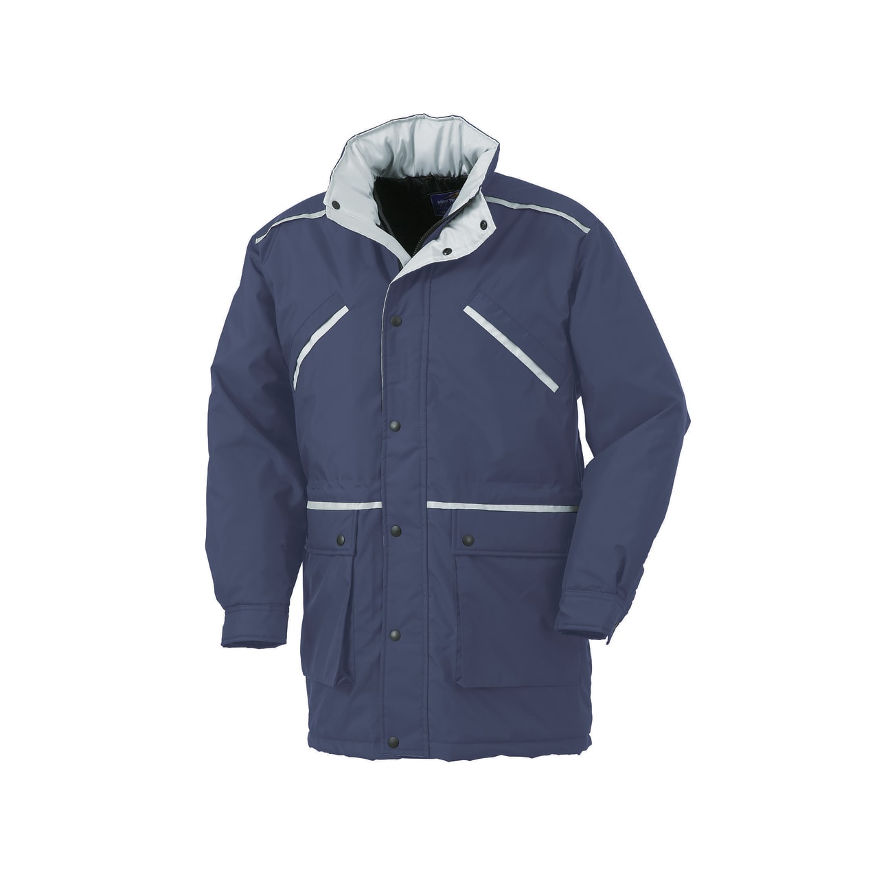 ナイロン素材とキルティング加工でできた保温性の高い防寒コートです。表地のナイロン素材は軽く、裏地にキルティングを施すことで保温性を確保しています。また、前立て部分にはファスナーとボタンが設置されており、気候に応じてしっかりと閉めておくことで、防寒対策ができます。フードは収納式で気候に合わせて取り外し時の管理が便利です。夜間の作業や業務の安全性を確保する反射テープも設置。再帰反射生地「ミラール」を使用して視認性を高めています。カラーバリエーションはネイビー、ダークグレー、ブラックの3色、サイズはM〜5Lが用意されています。
