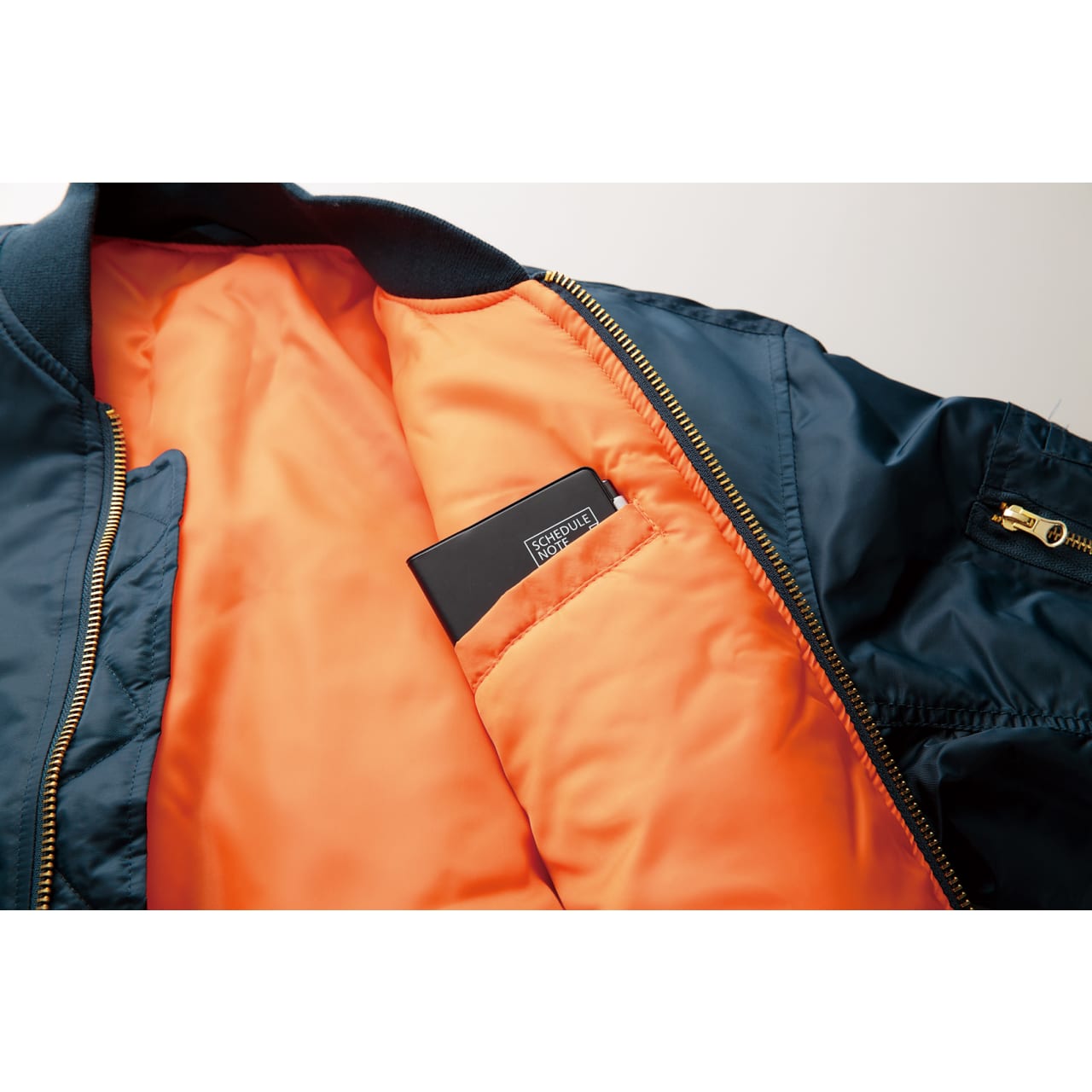 オレンジの裏地が特徴の撥水性高い軽量のMA-1型ジャンパー