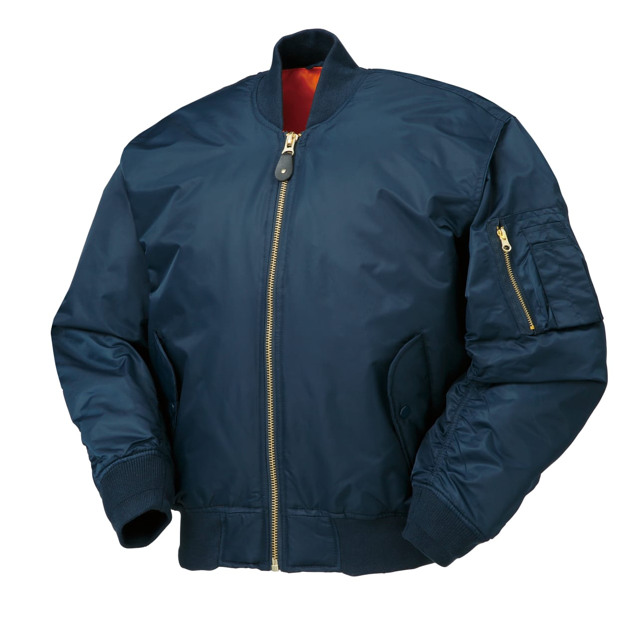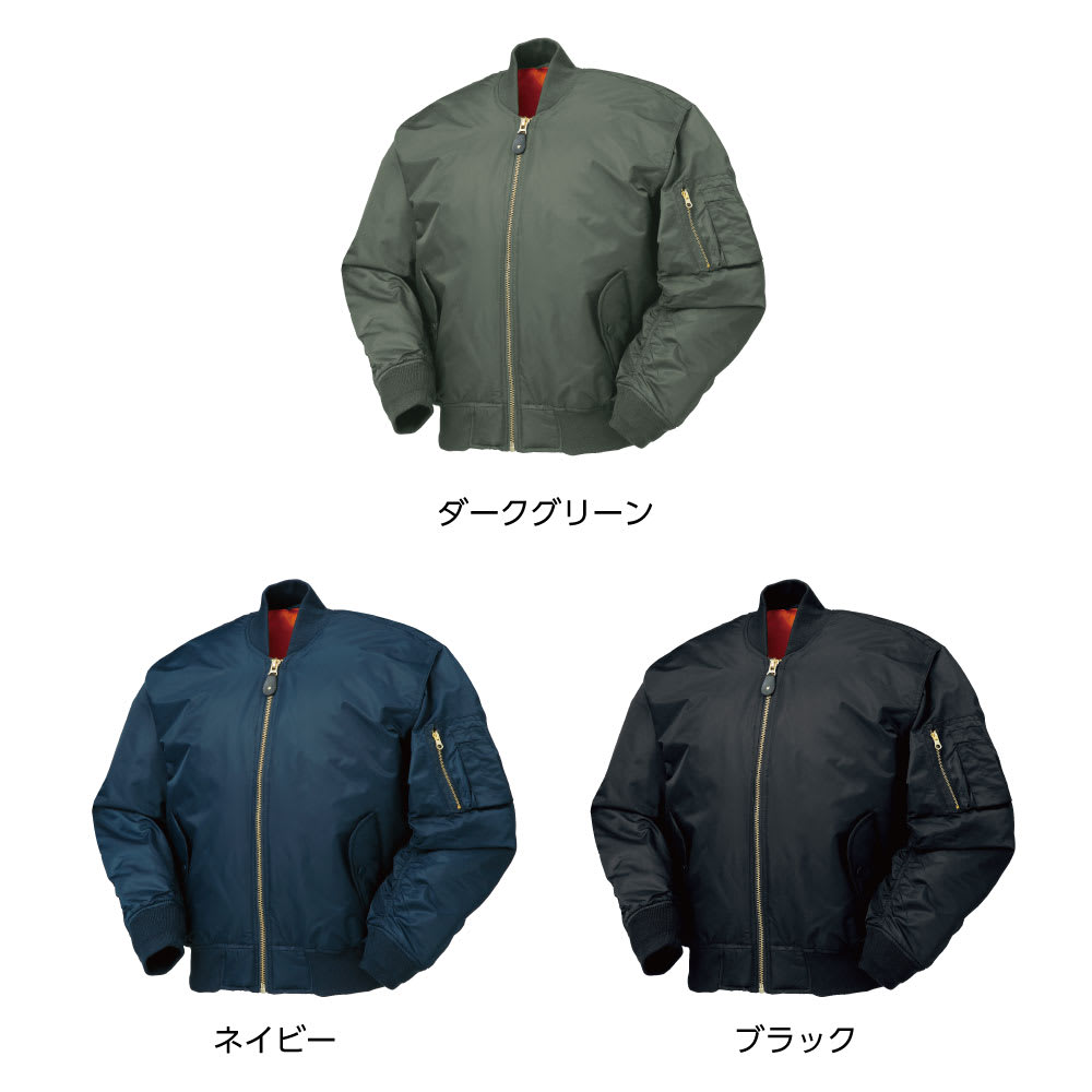 オレンジの裏地が目を惹く、クロダルマのMA-1型ジャンパー。表地はナイロン素材で撥水性が高く、雨の日でも快適に着こなせます。素材はナイロンとポリエステルのみのため、軽量で負担が少なく動きやすい設計。中綿入りで肌寒い日の防寒着としても活躍してくれます。左胸には内ポケット、左袖には多機能ポケットがついており、ボールペンやスマートフォンなどの小物類を収納しておくのに便利です。カラーはブラック・ネイビー・ダークグリーンの3色、サイズはM〜5Lの幅広く6サイズを展開中。シンプルなデザインでコーディネートしやすく、作業着から普段着まであらゆるシーンに映える一着です。