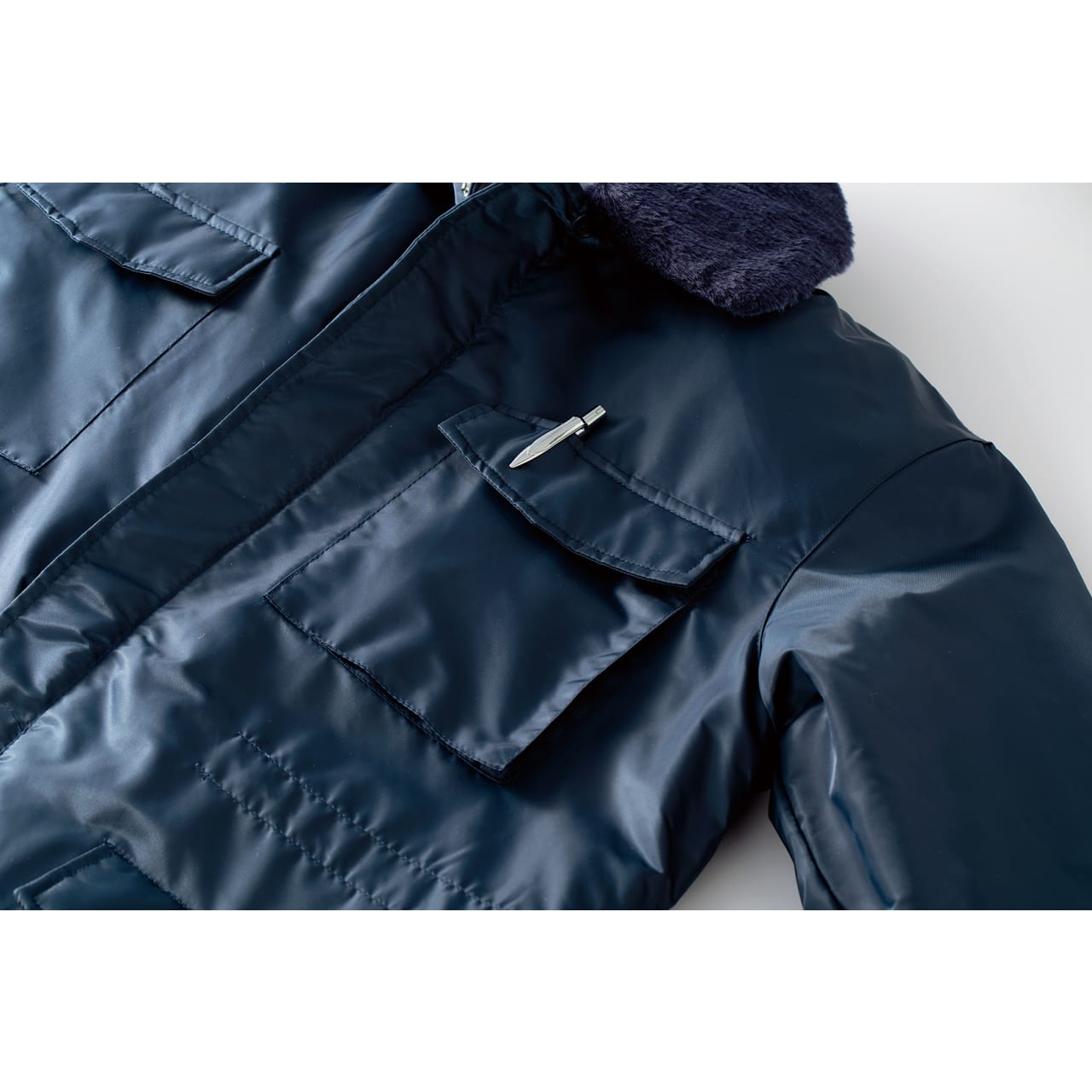 | □収納式フード □着脱式衿ボア □左胸ペン差し □左袖ペン差し |
