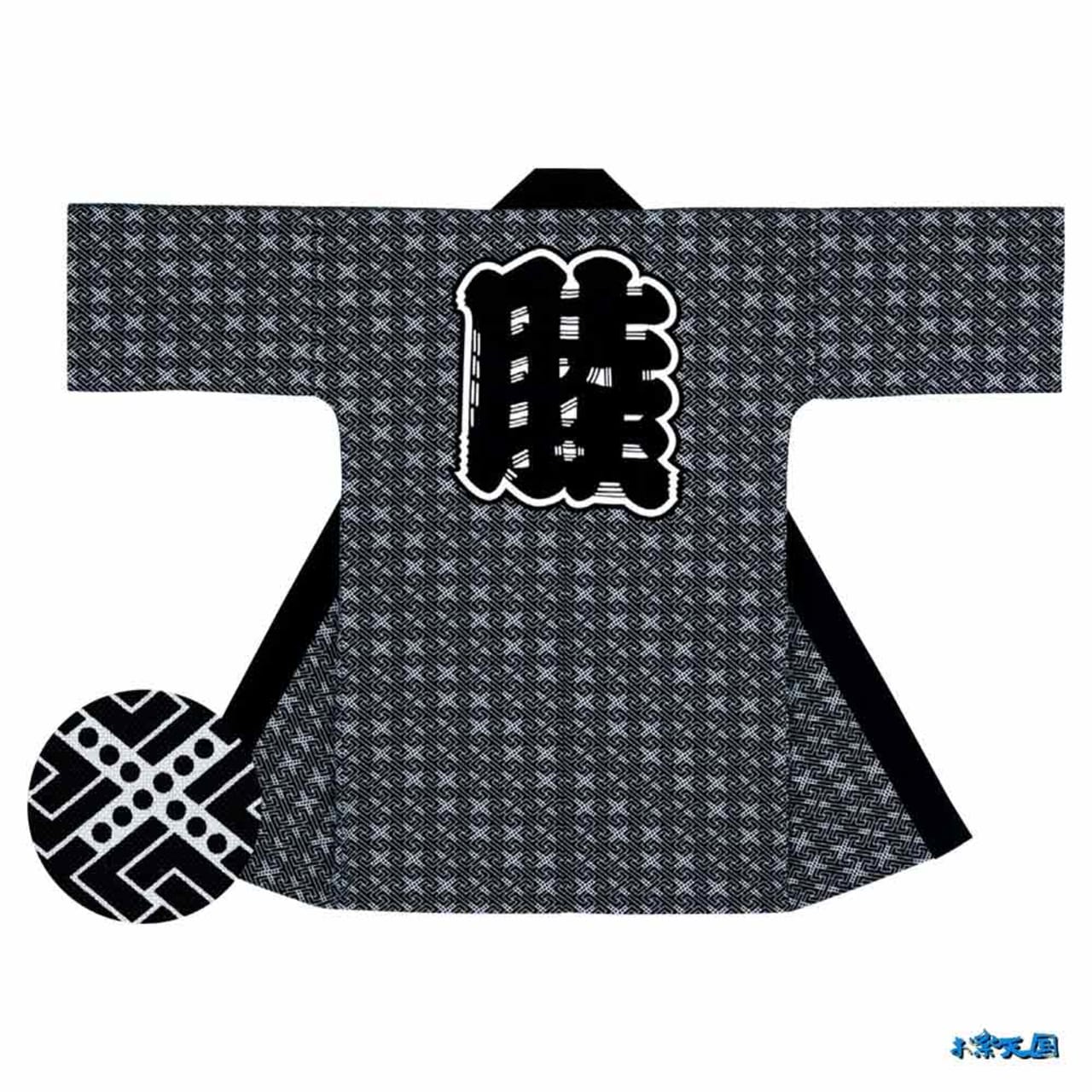 はっぴ全体に細かく柄が入っております。ホワイト色とブラック色で細かく入っているので遠目からみるとグレー色にも見えます。背紋には絶妙な大きさと位置で睦文字が入っております。両衿に団体名様などを印刷すると簡単にオリジナルのはっぴが完成します。プリント色はホワイト色又はブラック文字にホワイトフチがお勧めです。