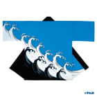 裾からソデにかけて斜めに波柄がはいったはっぴです。珍しい波柄でブラック色とホワイト色を使用しております。ソデと本体の縫い合わせ部分も波柄がきれいにつながっております。本体色は薄めのブルー色で波柄と相性のよい色になっております。