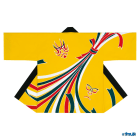 濃いイエロー色がベースとなったはっぴです。背中には斜めに簡単なのし柄が入っておりまた、歌舞伎役者の顔のようなイラストも入っております。染色方法は顔料染めです。価格は安いのですが色落ちに心配がありますので取り扱いには注意が必要です。