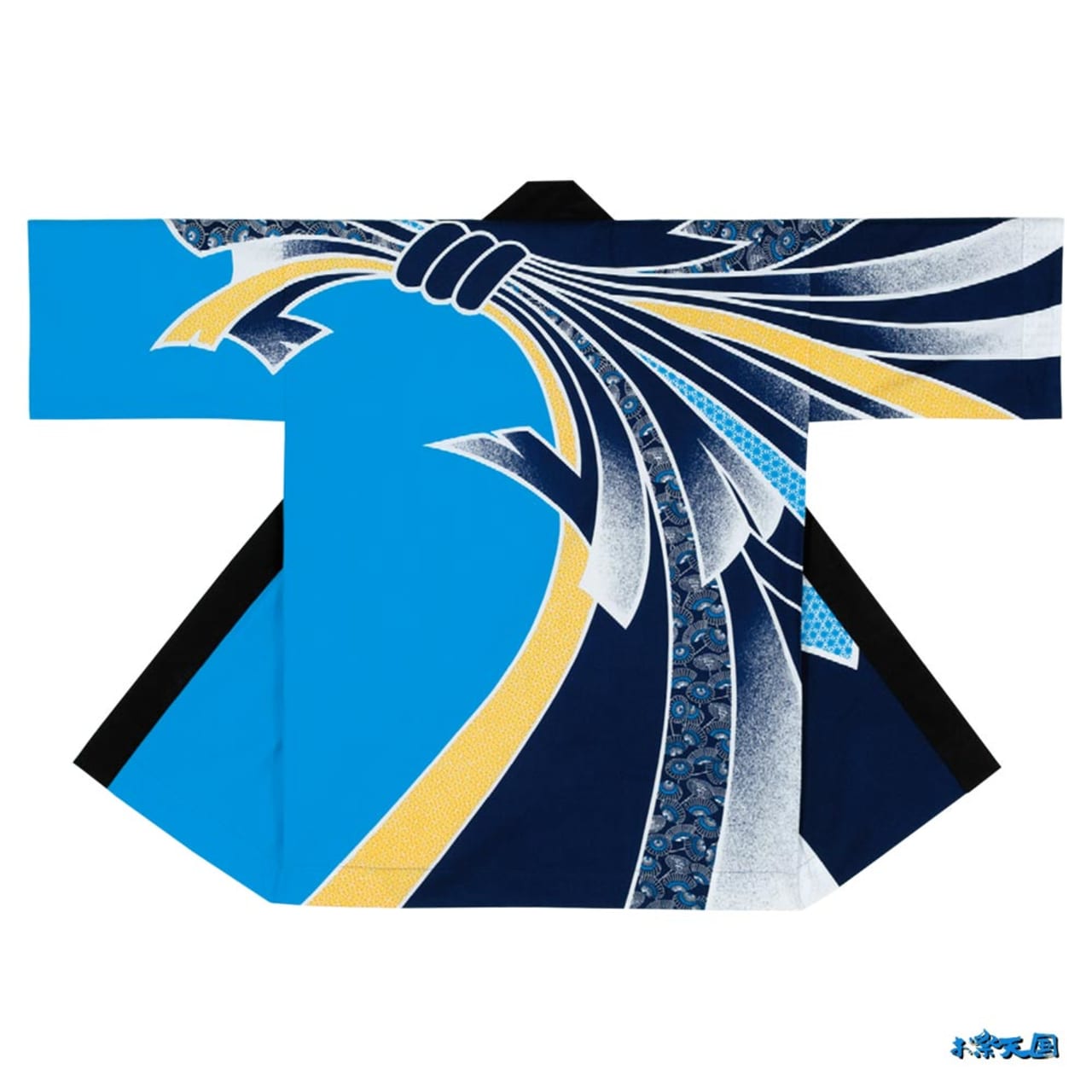 身巾が大きめに設定されている大きな体の方向けのはっぴです。身丈も100cmと長く、相当大きな体形の方でも着用可能なサイズとなっております。ブルー色とネイビー色がベースとなっており肩の所から裾にかけてのし柄が描かれております。ネイビー色がベースとなったのし柄で、男性的で落ちづいた雰囲気のデザインとなっております。