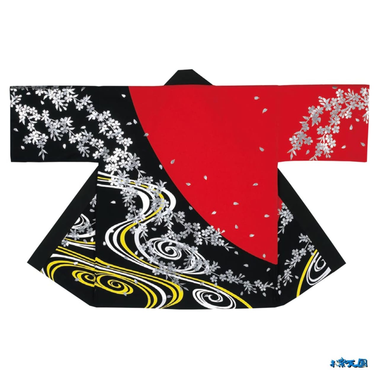 ブラックとレッド基調のはっぴです。裾にはデフォルメした波が描かれており、ソデから裾にかけては桜が描かれております。銀部分は箔プリントとなっており、まるで折り紙の銀のような光沢があります。箔プリントが全体に入ったはっぴは珍しく、豪華な仕上がりとなっております。