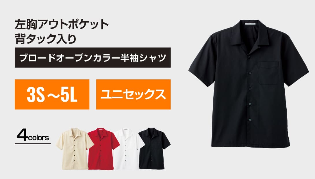 小柄な女性から体格のいい男性まで、幅広くカバーする3S〜5Lの9サイズ展開!オープンカラー(開襟)やサイドスリットでカジュアルな印象でありながら、上品さもある一着。かしこまりすぎたくないシーンにおすすめ。シンプルでありながらブラックのボタンが印象を引き締め、ハリ感のある生地が清潔感ときちんと感を演出します。後ろのヨークにはサイドタックが入っているのでしっかりと動きやすく、肌あたりが良くしなやかなブロード生地で着心地も◎。吸水性、速乾性も高く、汗ばむ季節にもおすすめ。さらに「エコテックス®メイドイングリーン」を取得しており、安心して着用いただけます。