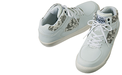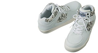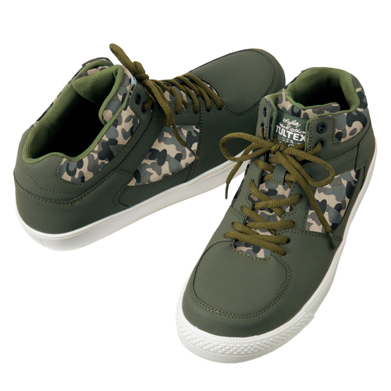 カモフラメッシュがアクセント、人気のミドルカットセーフティシューズ。