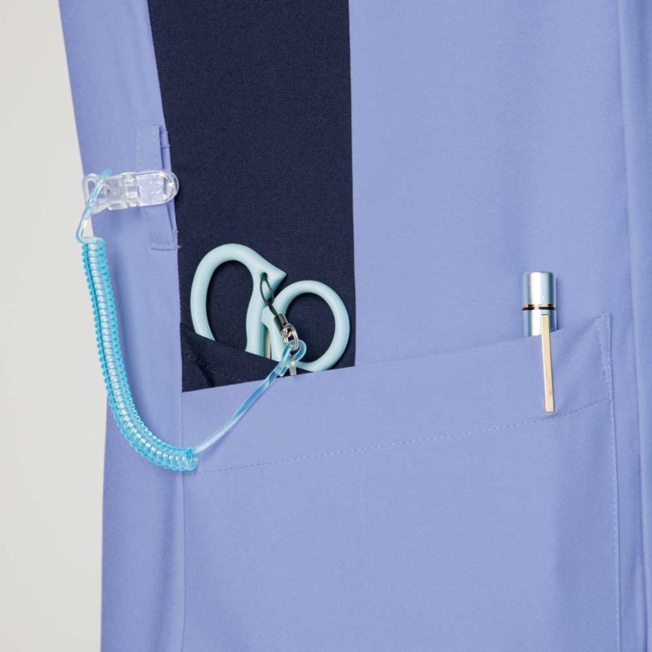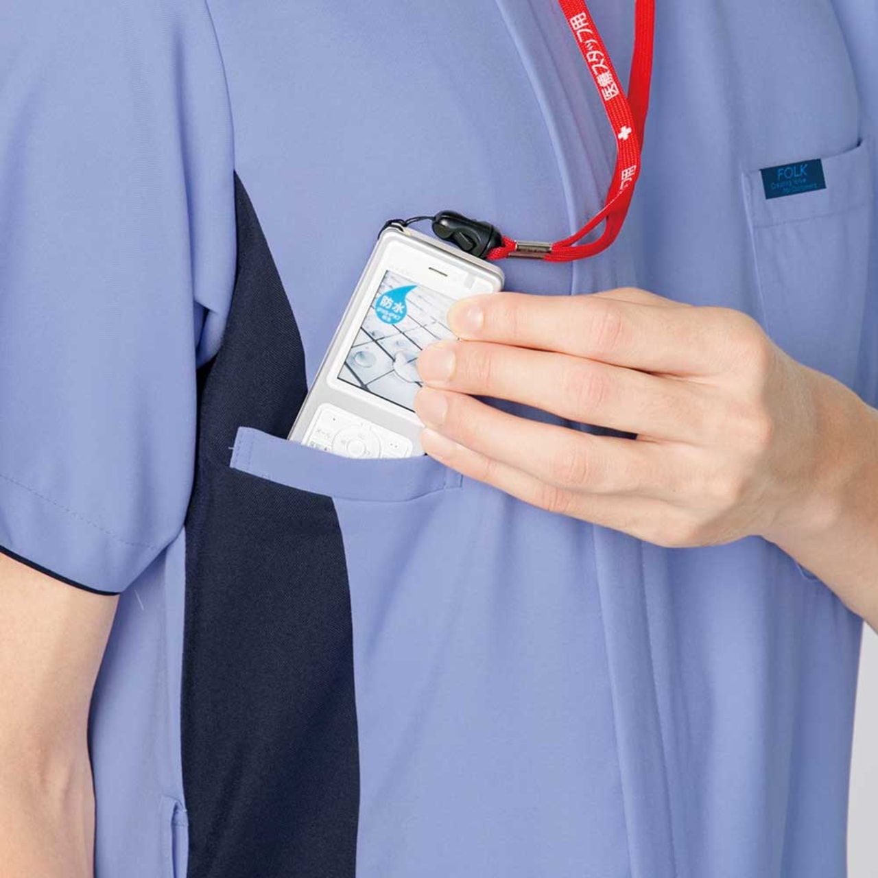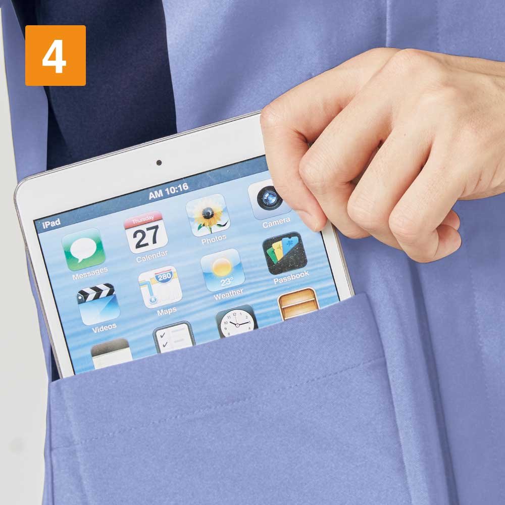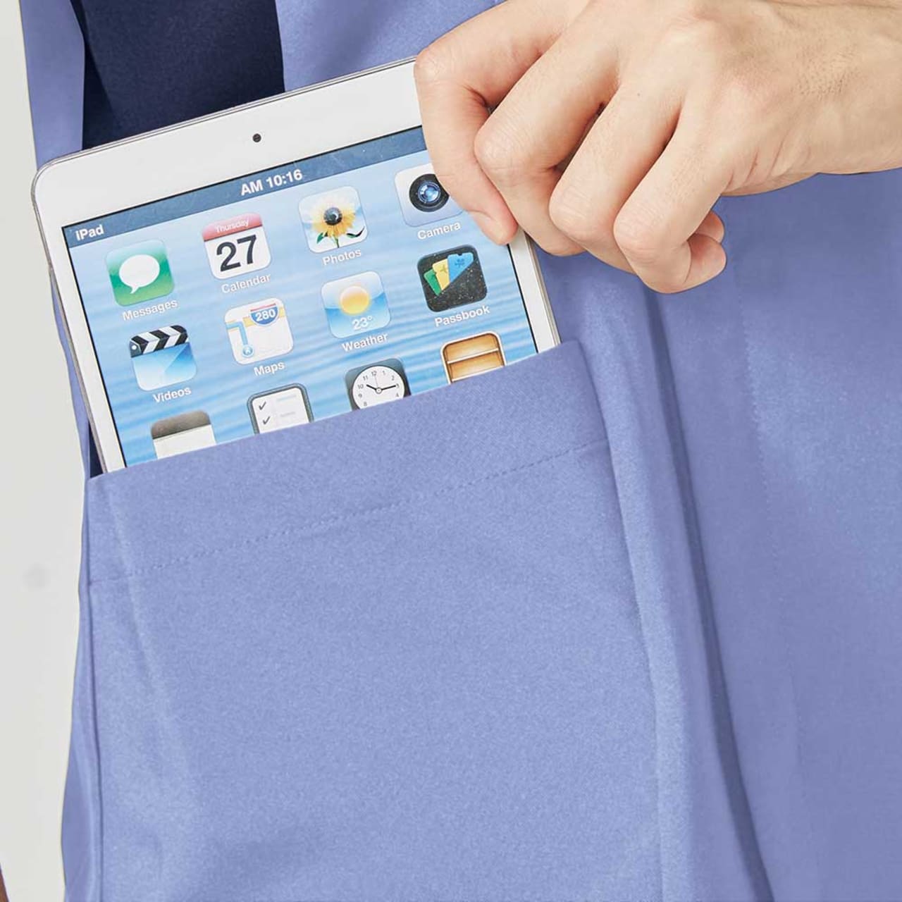 脇に効かせたラインがシャープなシルエットを演出し、スタイル良く見せてくれます。スクラブのジップ部分は男前立(右前)の組み合わせ。ヘアスタイルの乱れも気にならず、シャツやジャケット感覚で着用できます。二重の胸ポケットは内側はペン差し用に加工されているなど細やかなディティールにもこだわっています。 タブレットも入るようになった大型の脇ポケット、便利な小分けポケットもテープやハサミなどの収納に便利です。