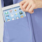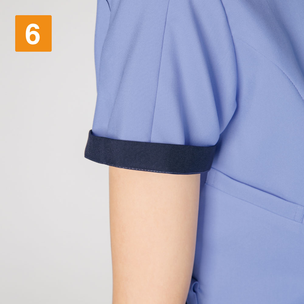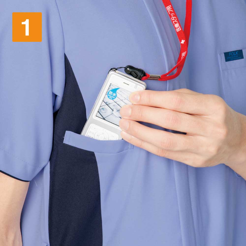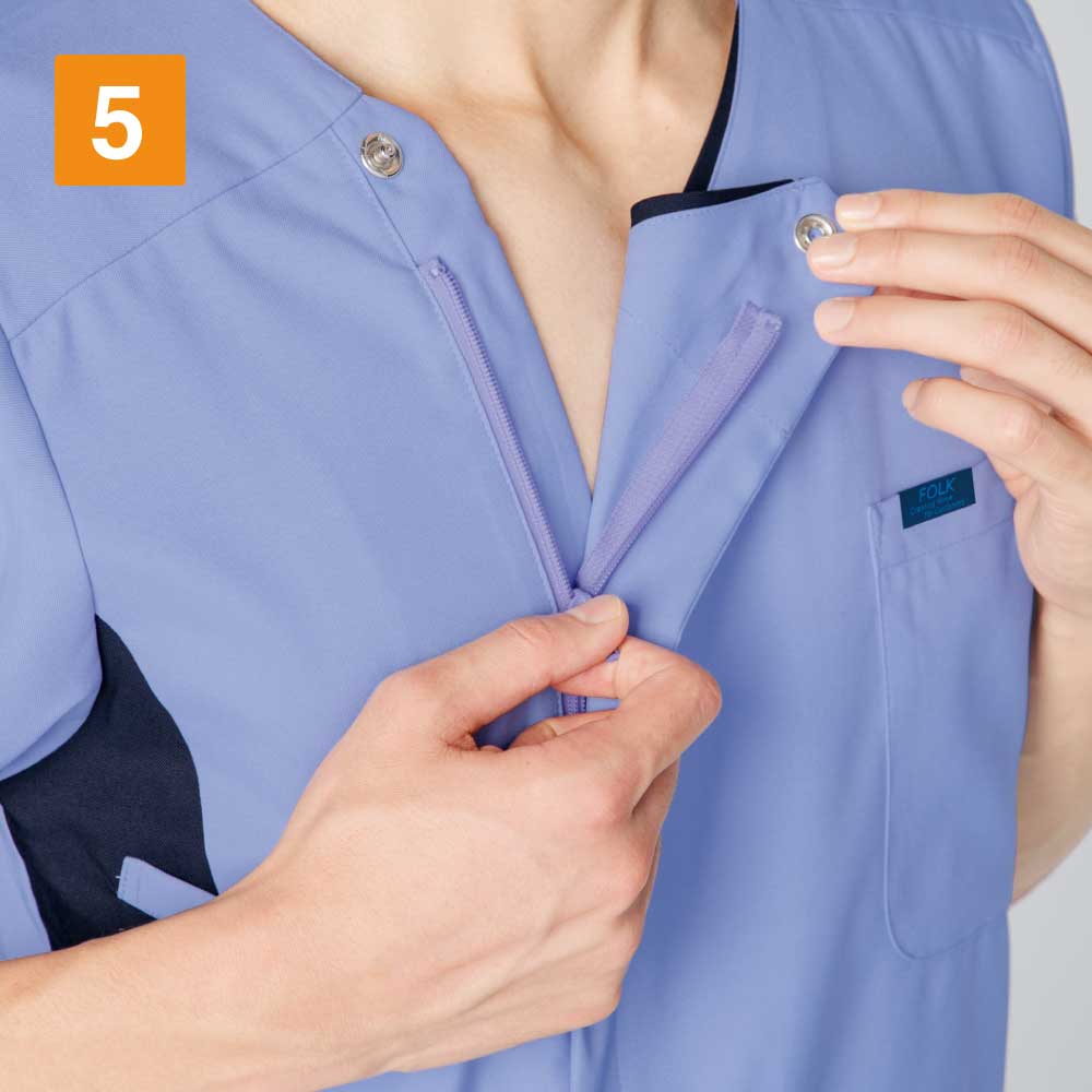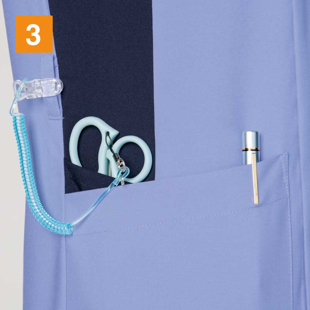 脇に効かせたラインがシャープなシルエットを演出し、スタイル良く見せてくれます。スクラブのジップ部分は男前立(右前)の組み合わせ。ヘアスタイルの乱れも気にならず、シャツやジャケット感覚で着用できます。二重の胸ポケットは内側はペン差し用に加工されているなど細やかなディティールにもこだわっています。 タブレットも入るようになった大型の脇ポケット、便利な小分けポケットもテープやハサミなどの収納に便利です。