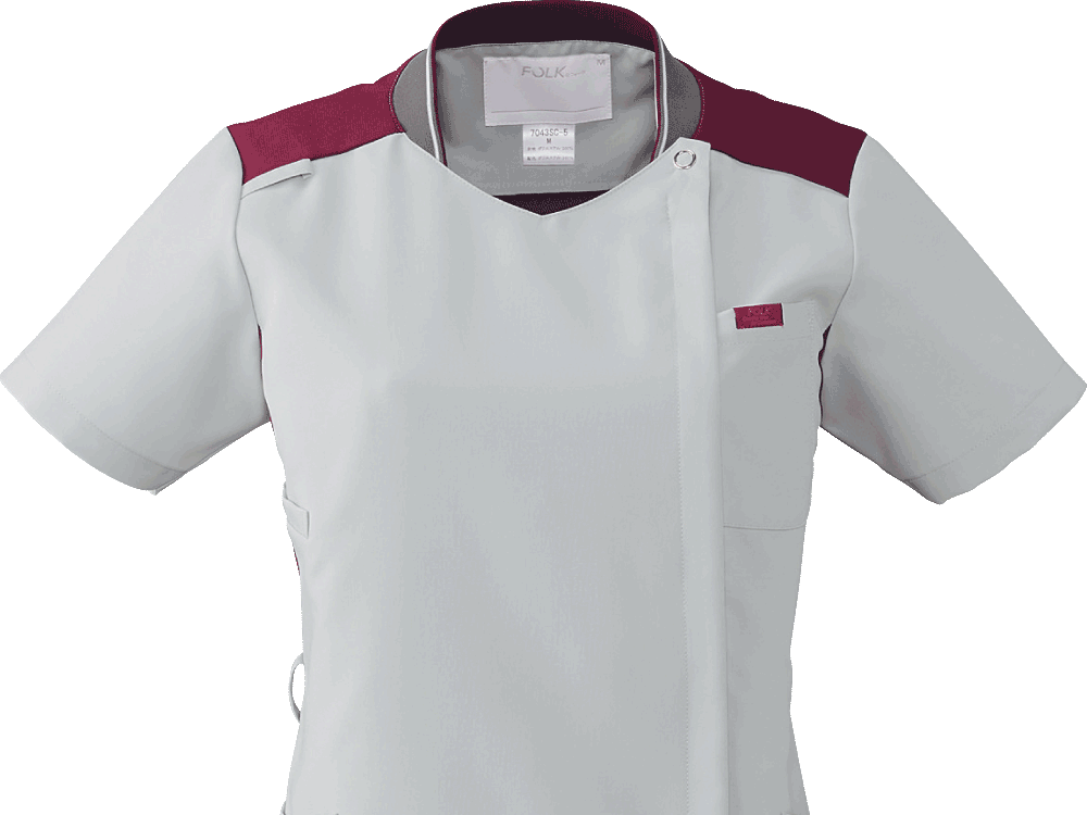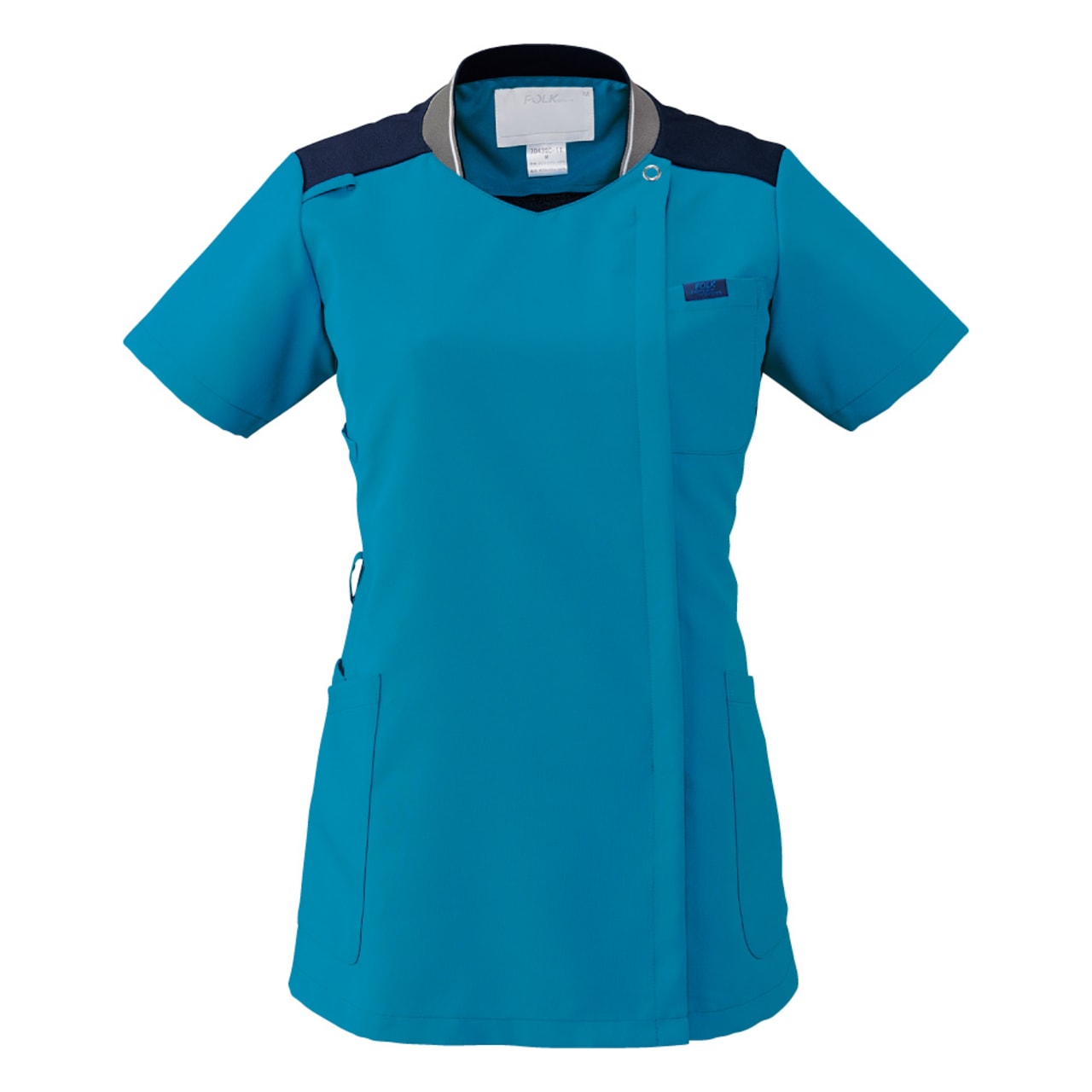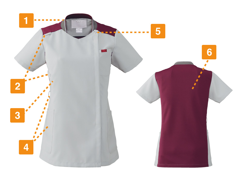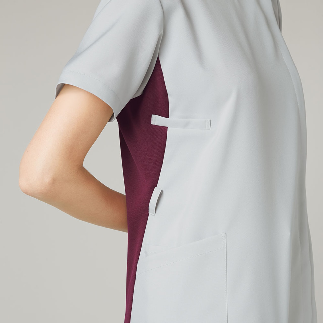 背面全面に通気性・吸汗・速乾性の高いニット素材を採用したレディーススクラブ 。ストレッチ性の高いニット素材を使った事で柔軟な動きに対応します。 スポーティな配色のリブ襟もオシャレなワンポイント!右肩に携帯電話ストラップを取り付けられるループを配置、ストラップを首に回さないので衛生的かつ安全です。 スクラブの丈がお尻の下まで隠れるのも女性には嬉しいポイントです。