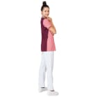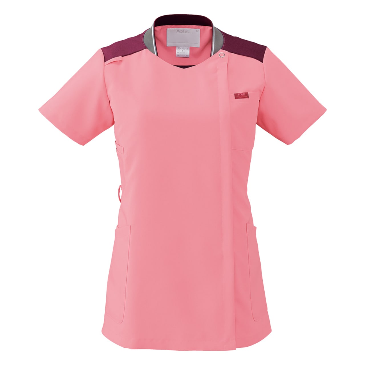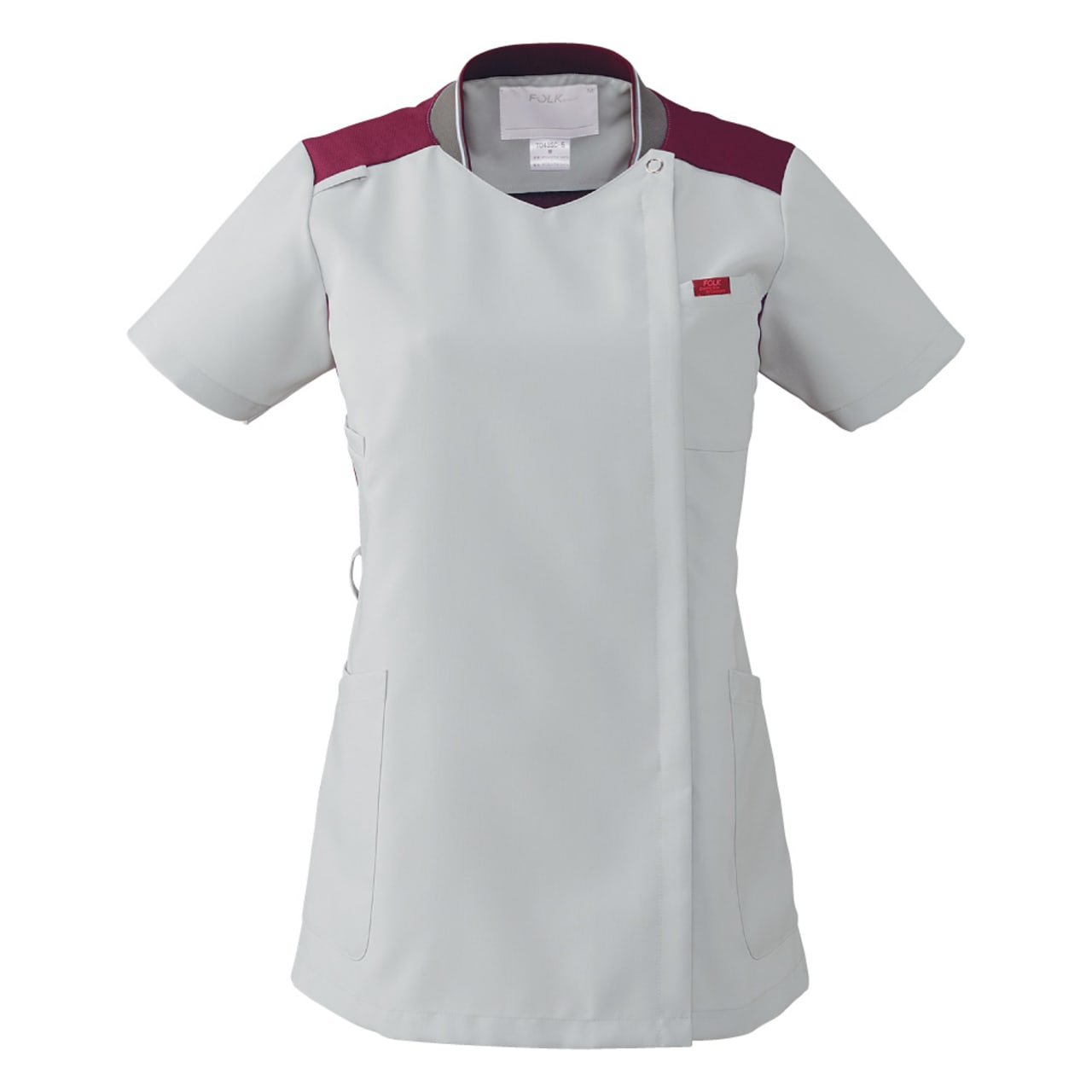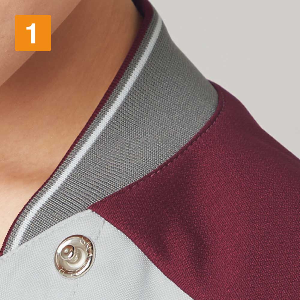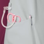 背面全面に通気性・吸汗・速乾性の高いニット素材を採用したレディーススクラブ 。ストレッチ性の高いニット素材を使った事で柔軟な動きに対応します。 スポーティな配色のリブ襟もオシャレなワンポイント!右肩に携帯電話ストラップを取り付けられるループを配置、ストラップを首に回さないので衛生的かつ安全です。 スクラブの丈がお尻の下まで隠れるのも女性には嬉しいポイントです。