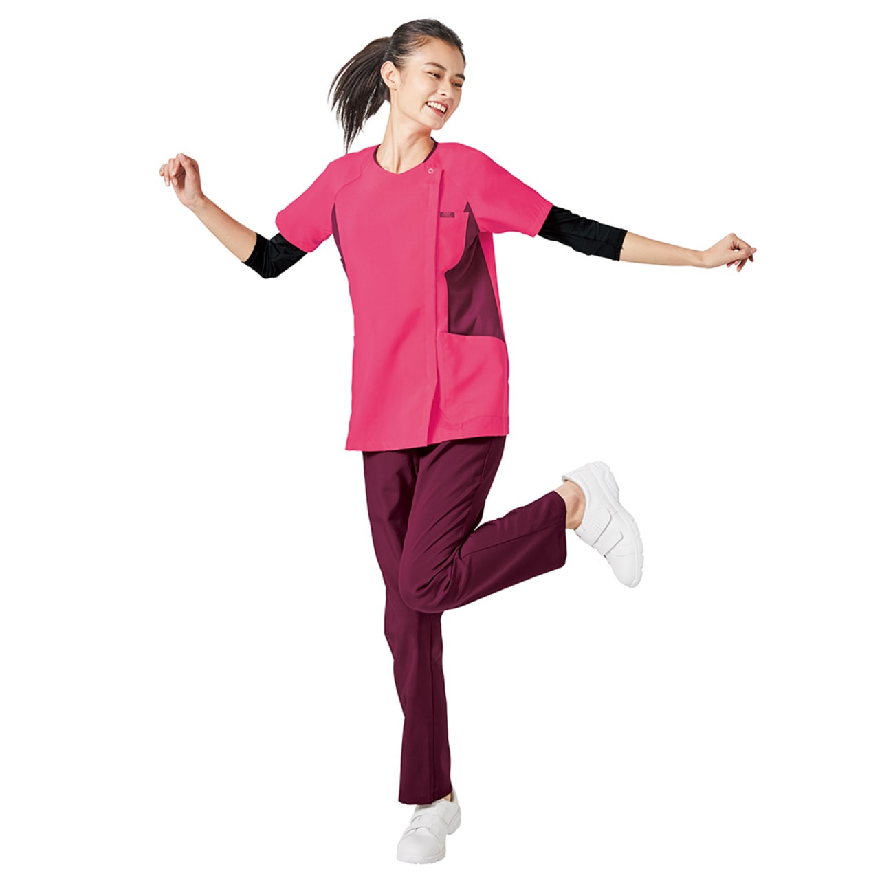 細身に魅せる脇下の切り替えは、濃い色の配色なので汗の後なども目立だせない効果もあります。 強固なマスト(帆)をイメージして開発した新素材イリアスマストを使用。機能糸クールエスパーは速やかに体の汗を吸い取ります。 お尻後ろまで隠れる少し長めの丈も嬉しい女性用スクラブ。 全体的に明るいカラーバリエーションも印象的なスクラブです。