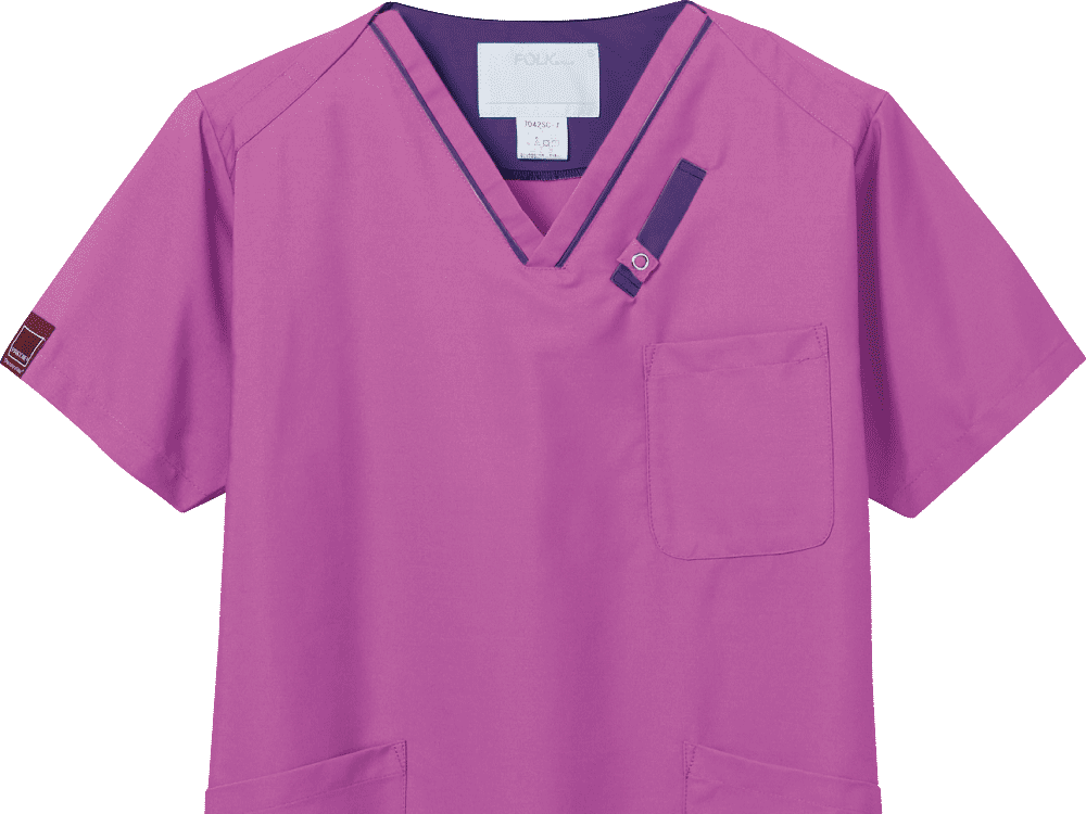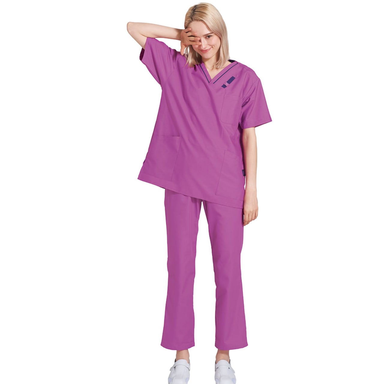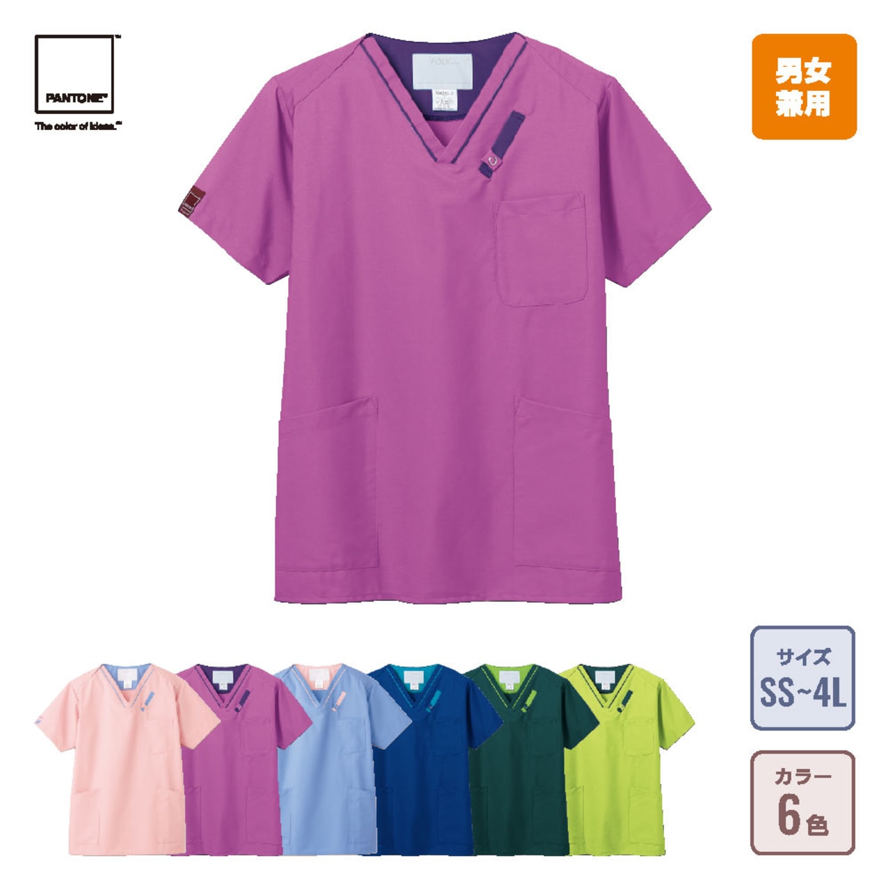 豊富なカラー展開のPANTONEのスクラブ。Vネックの襟元にはボディカラーとは異なる配色のパイピングを施しアクセントに。PHS.PDA 重量拡散ポケットやPHS.PDA 落下防止タブ付きで医療現場でアクティブに働く人たちのことを考えたスクラブとなっています。使用している「スクラブポプリン」はポリエステル65%、綿35%のダンガリーシャツのような肌触りと、使い込むほど風合いの出る素材感が特徴です。