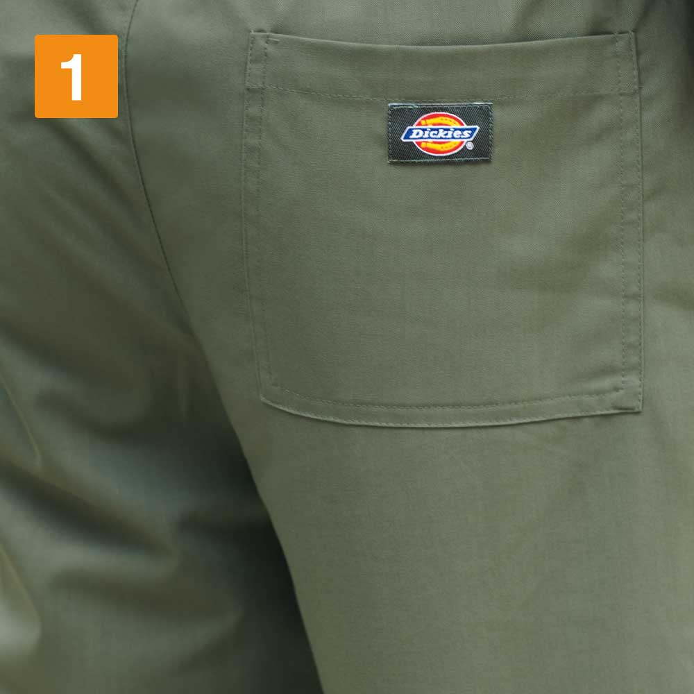 動きやすいストレッチ素材を採用し、汗の吸い取りも良く、乾きやすいドライな着心地も魅力のスクラブパンツです。?ウエストひもの色が差し色となって、おしゃれなパンツに仕上がっています。 シワにもなりずらくイージーケア性も抜群。後ろポケットのディッキーズのロゴがブランド力を主張しています。