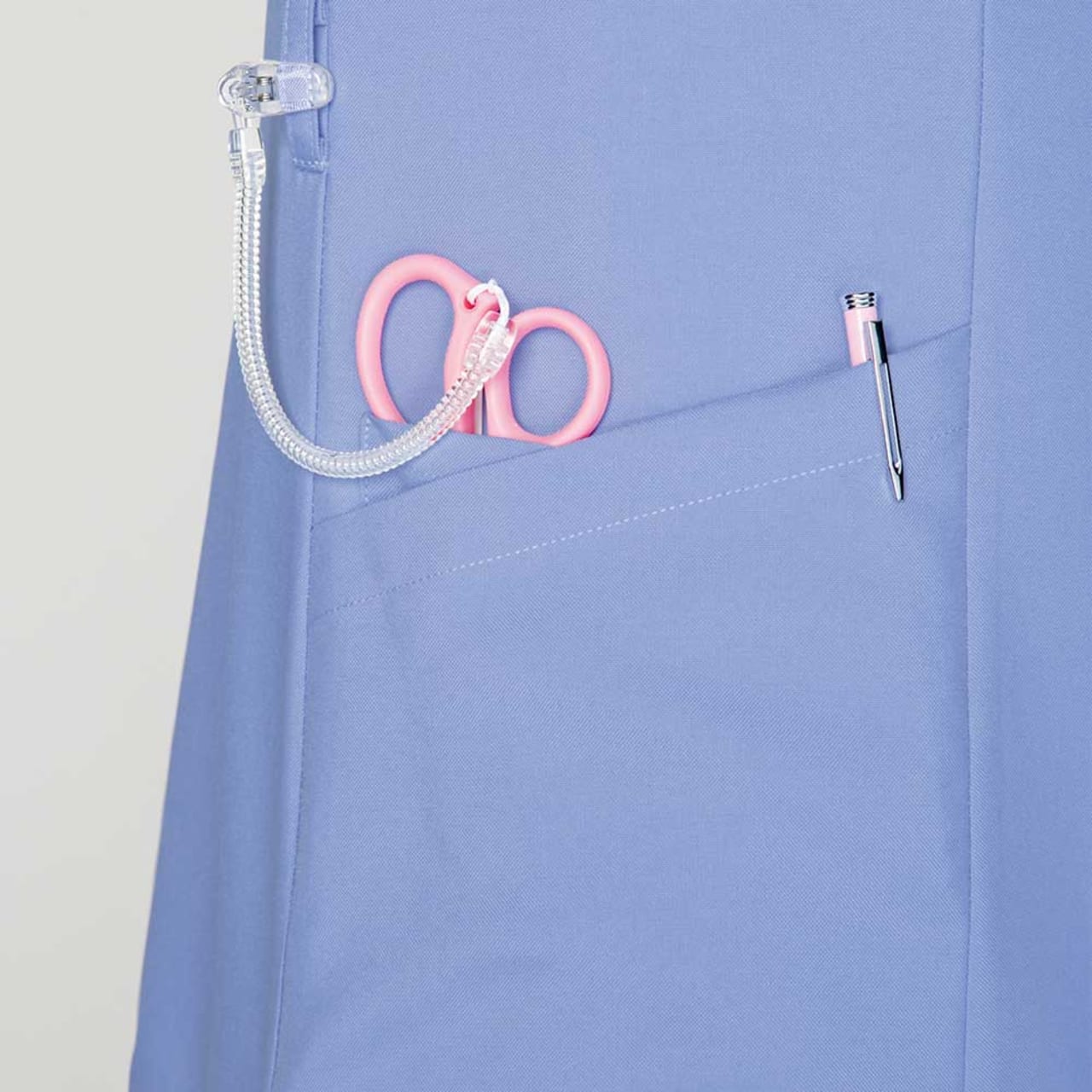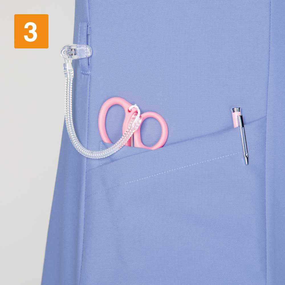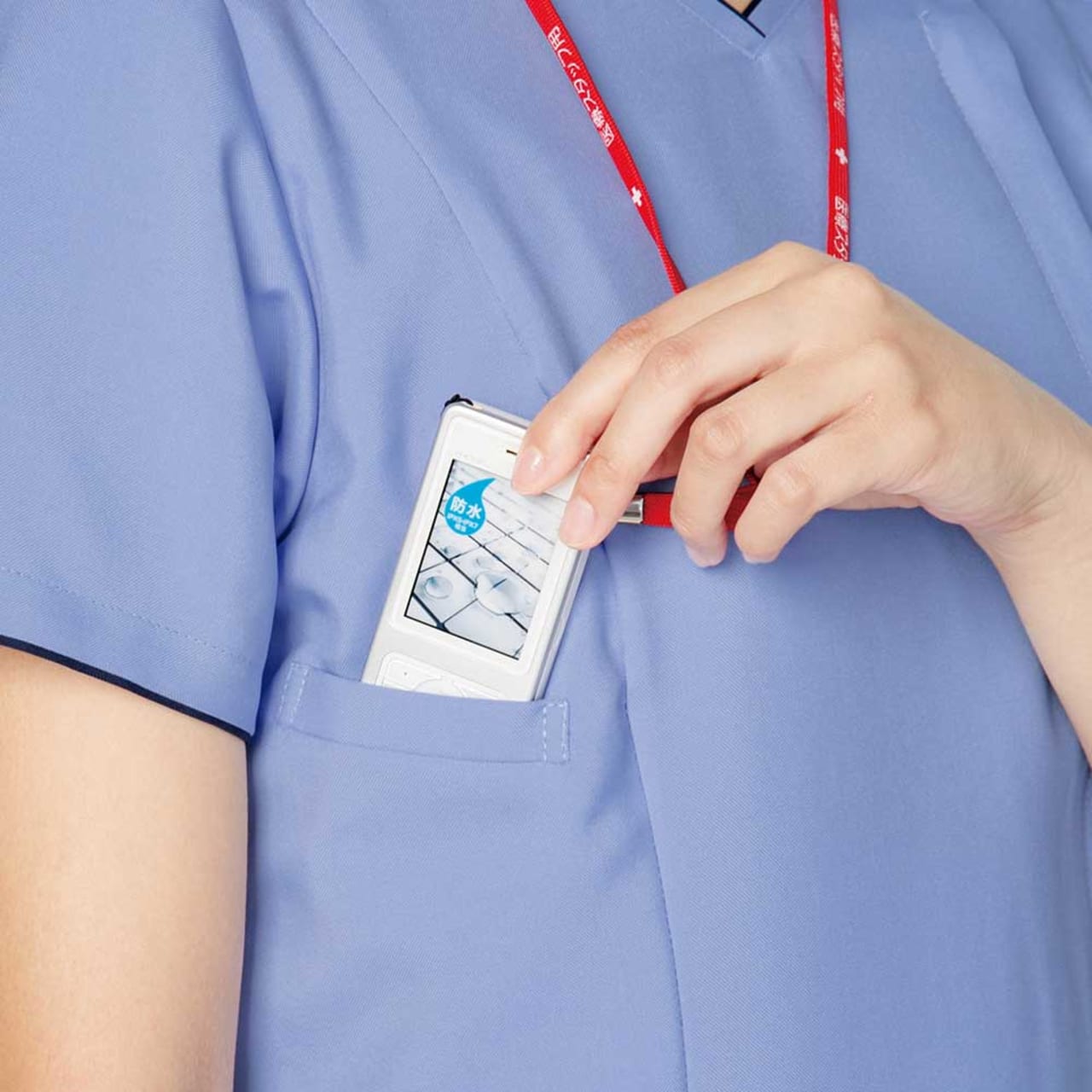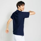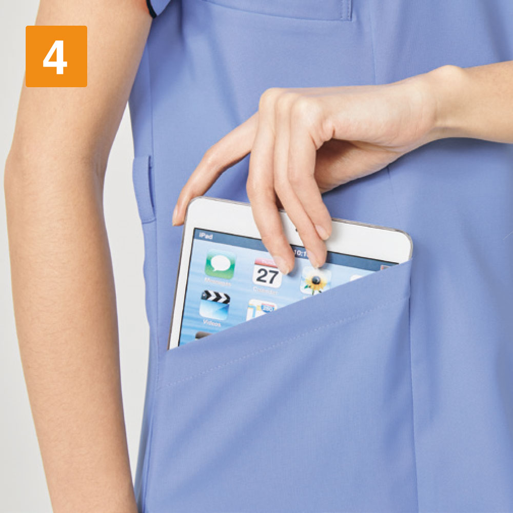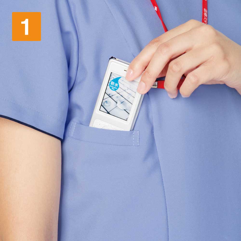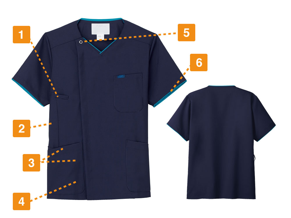 背面全面と脇に通気性・吸汗・速乾性の高いニット素材を採用したメンズスクラブ 。ストレッチ性の高いニット素材を使った事で柔軟な動きに対応します。 スポーティな配色のリブ襟もオシャレなワンポイント!右肩に携帯電話ストラップを取り付けられるループを配置、ストラップを首に回さないので衛生的かつ安全です。