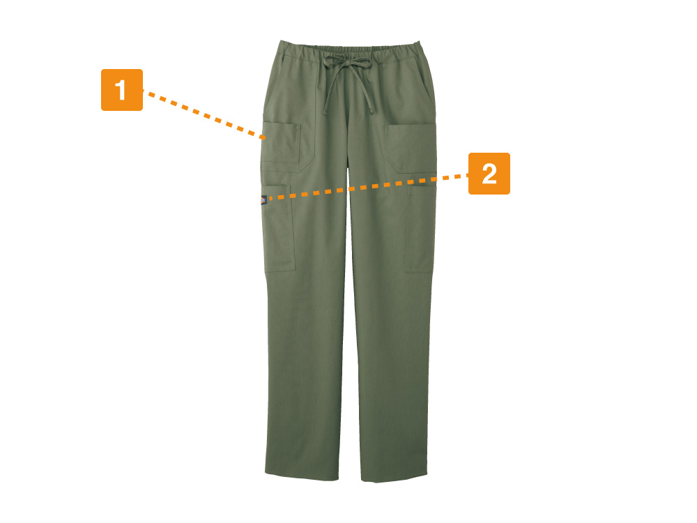 7033SCディッキーズスクラブ上着と同素材、同企画のスクラブカーゴパンツです。ポケットが多いのが特徴です。上着とセットで揃えると、カッコよく決まります!