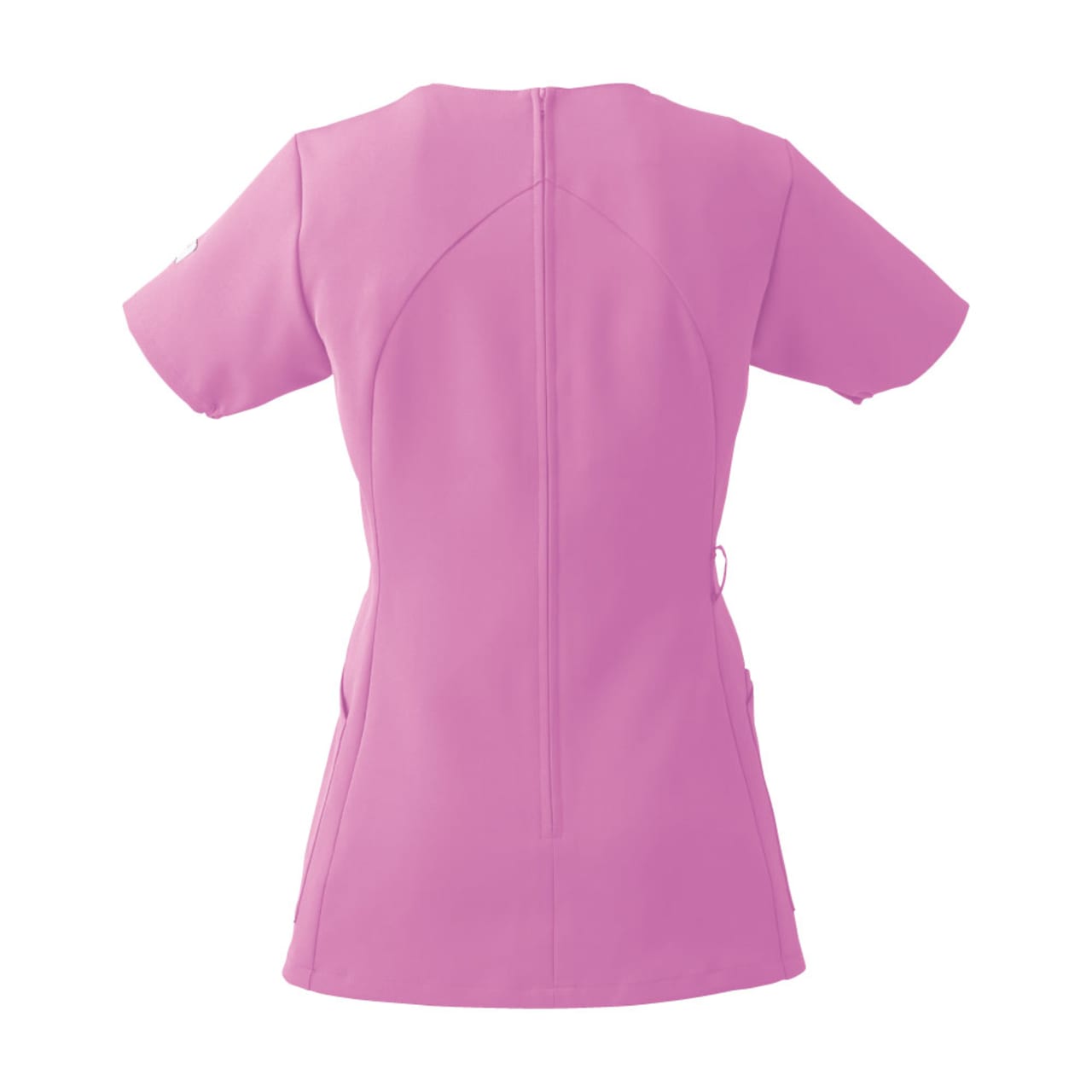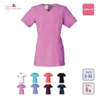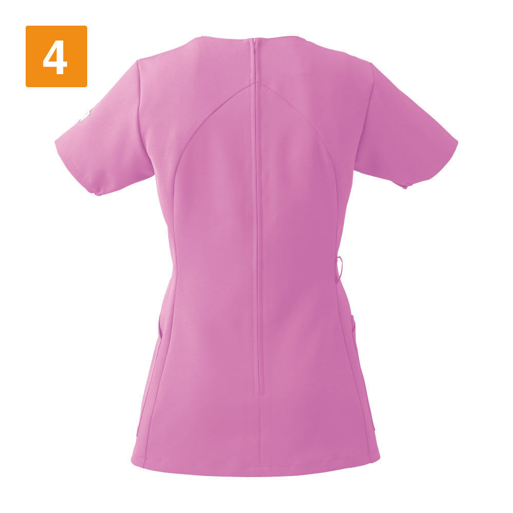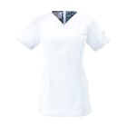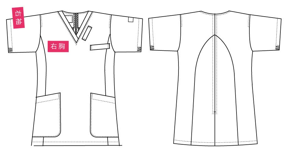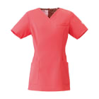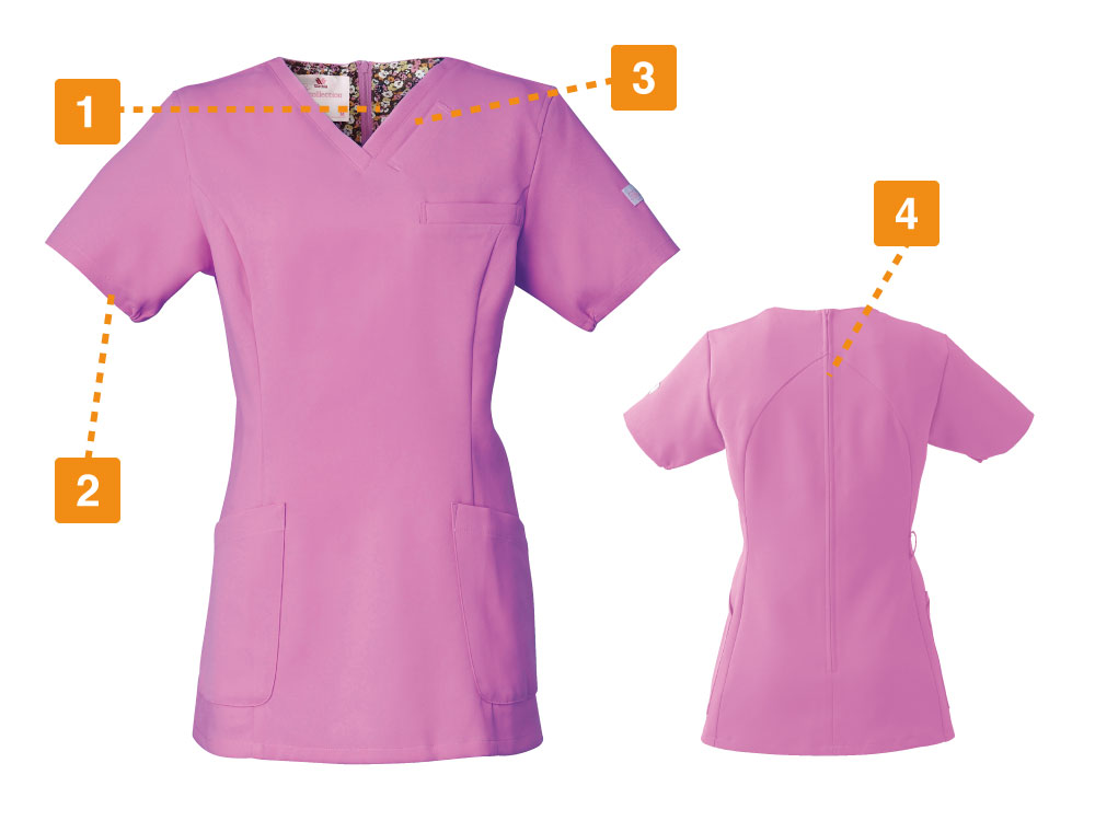 シンプルなスクラブですが、女性に優しい脇下ゴムを採用するなど細やかなデザイン配慮が魅力のスクラブです。ワンピースのように「履いて着る」ことで、髪が乱れたりメイクが落ちたりしないことも女性に支持される理由です。 採用されている素材は、優れた吸収性と拡散性・ドライ感を実現したポリエステル素材「ネオα」。やわらかな風合いで、やさしい肌触りです。背面の裏地には花柄の生地を採用しておりかわいらしいデザインとなっています。