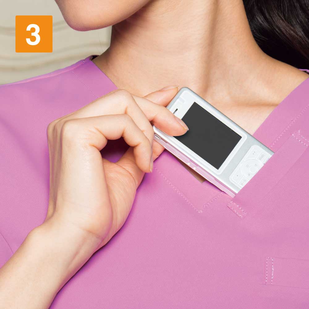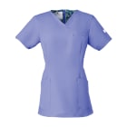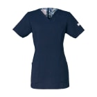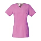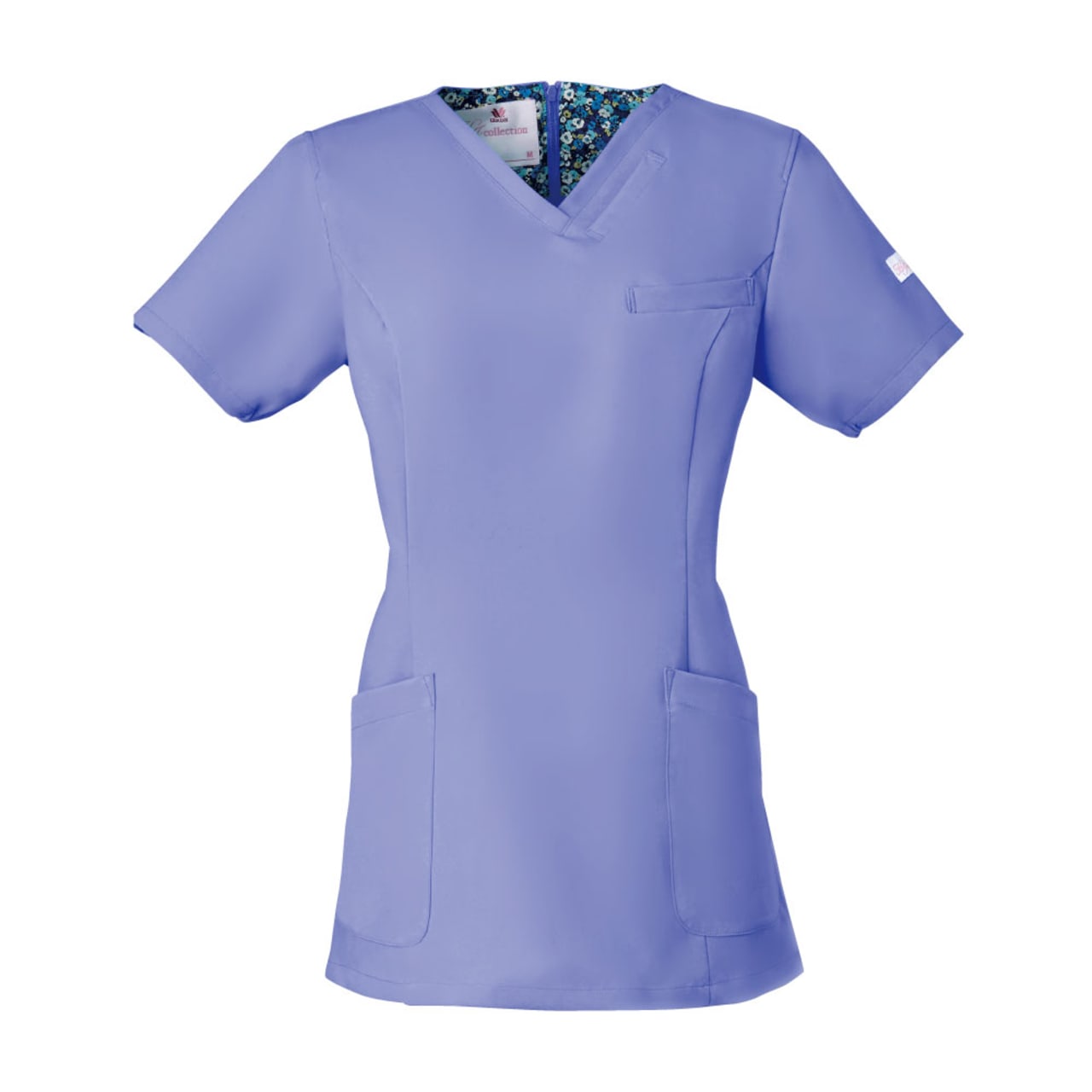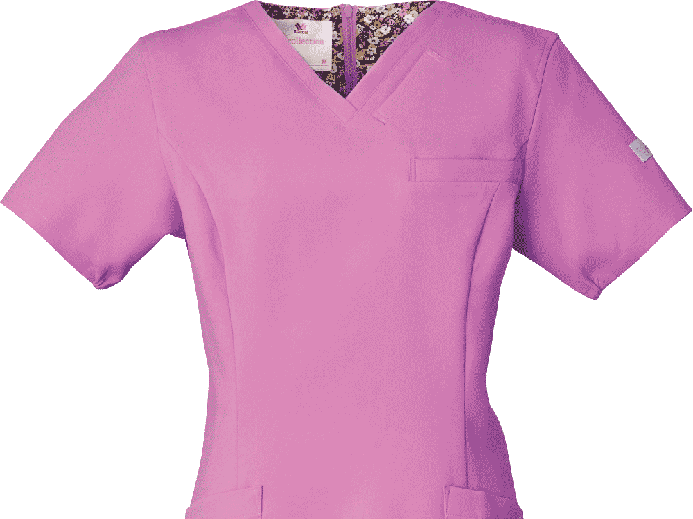 シンプルなスクラブですが、女性に優しい脇下ゴムを採用するなど細やかなデザイン配慮が魅力のスクラブです。ワンピースのように「履いて着る」ことで、髪が乱れたりメイクが落ちたりしないことも女性に支持される理由です。 採用されている素材は、優れた吸収性と拡散性・ドライ感を実現したポリエステル素材「ネオα」。やわらかな風合いで、やさしい肌触りです。背面の裏地には花柄の生地を採用しておりかわいらしいデザインとなっています。