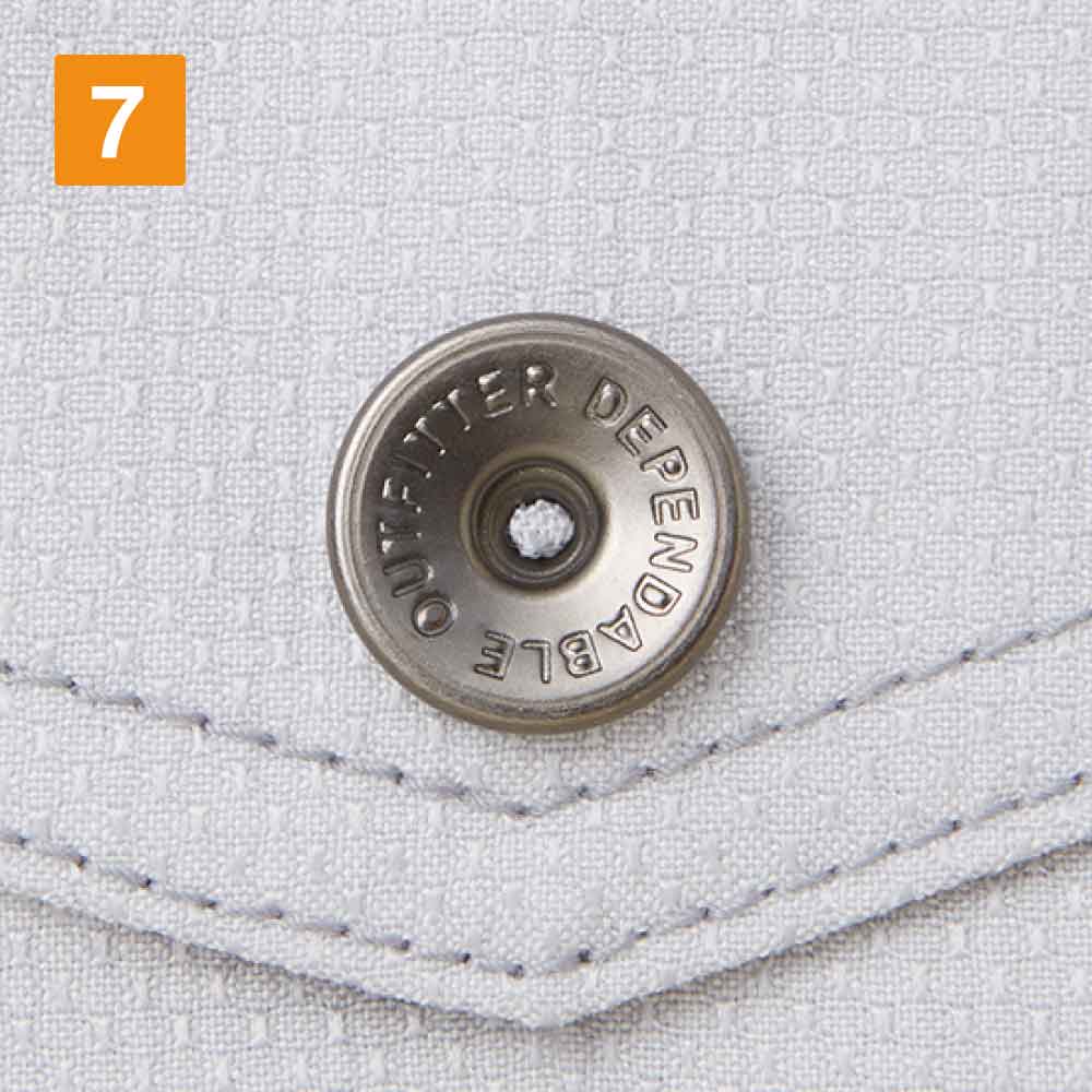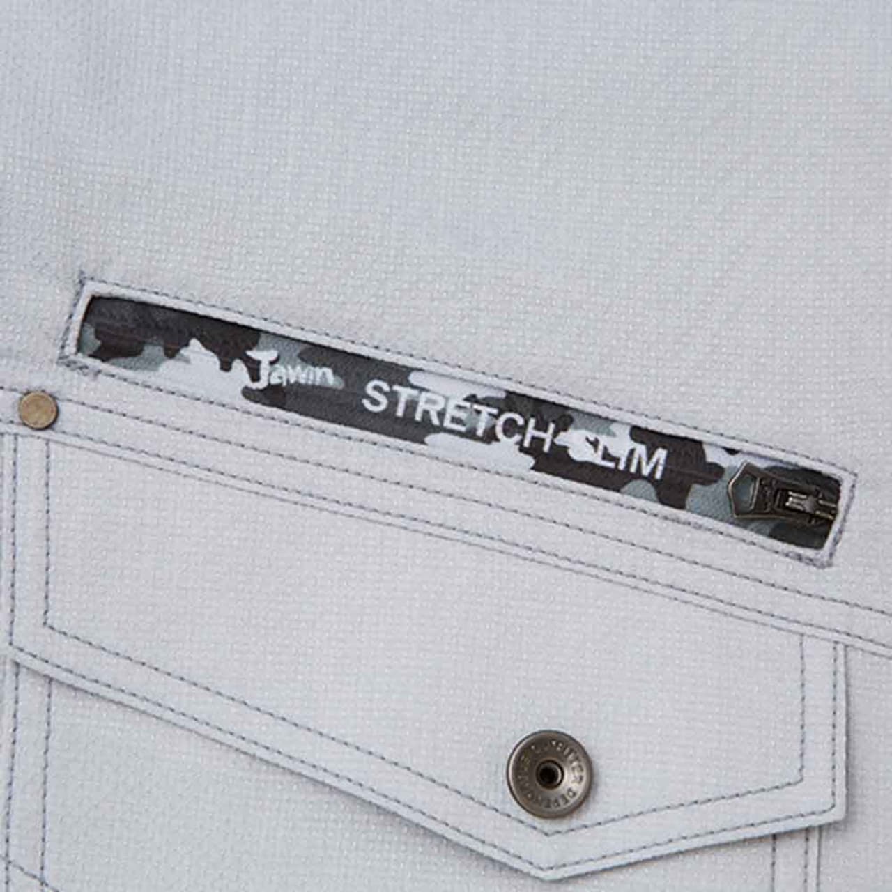 右胸元のポケット上部にあるカモフラファスナーがインパクトのあるストレッチ長袖ジャンパー。3タイプのカラーごとに合った色のカモフラファスナーが付いています。ボディフィールオックス素材のアイテムで、春夏の暑い時期の作業でも素早く汗を乾燥させます。左袖部分には「Jawin」らしいロゴワッペンとレッドパイピングが施され、オリジナリティの高いアイテムに。裾部分の飾りステッチもアクセントになります。胸元フラップ付きポケットは携帯電話サイズのため、連絡を待ちたい時にも便利。腰部分の斜めポケットはフラップなしですばやく出し入れができます。