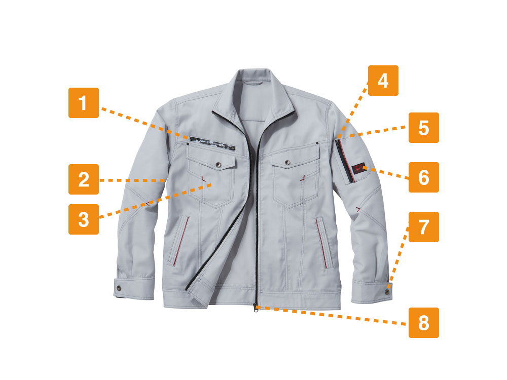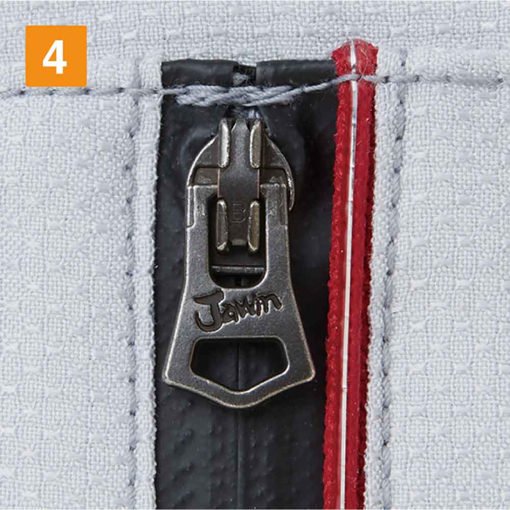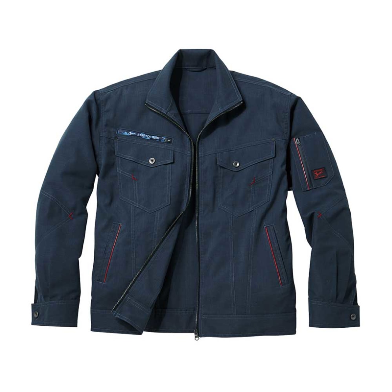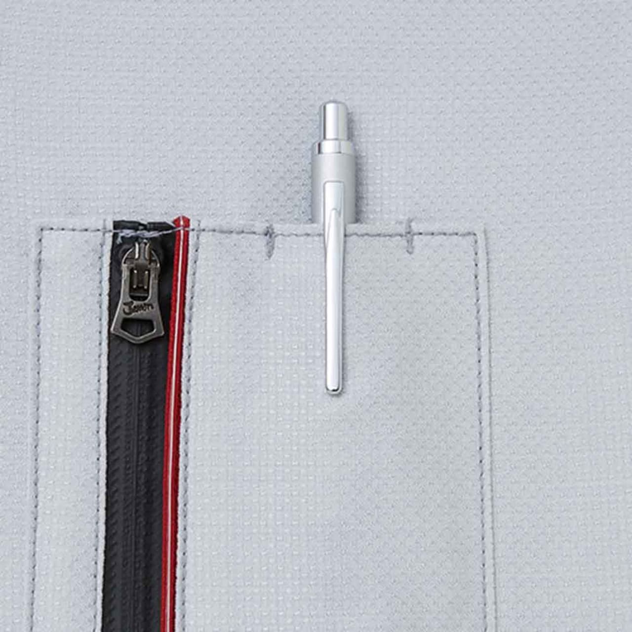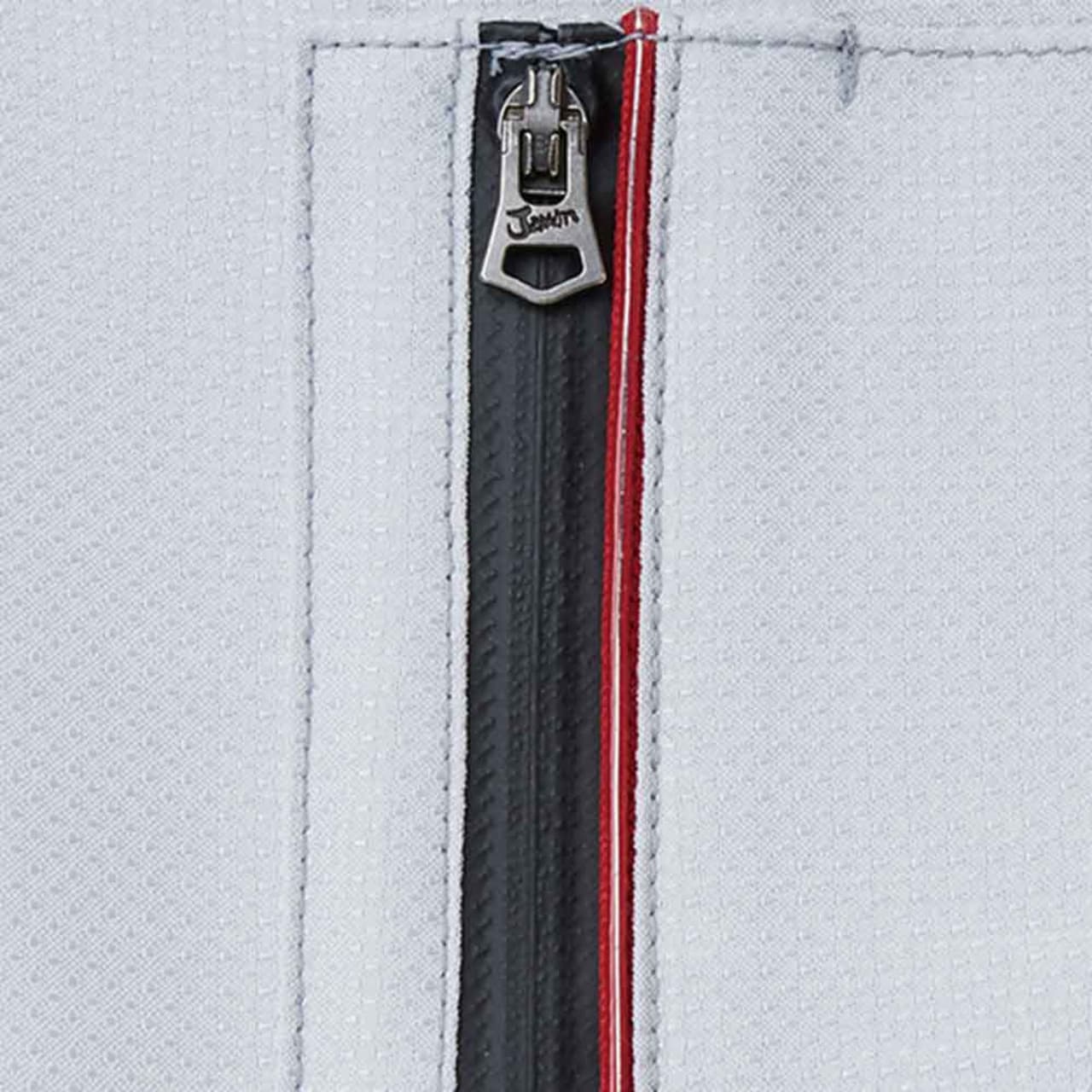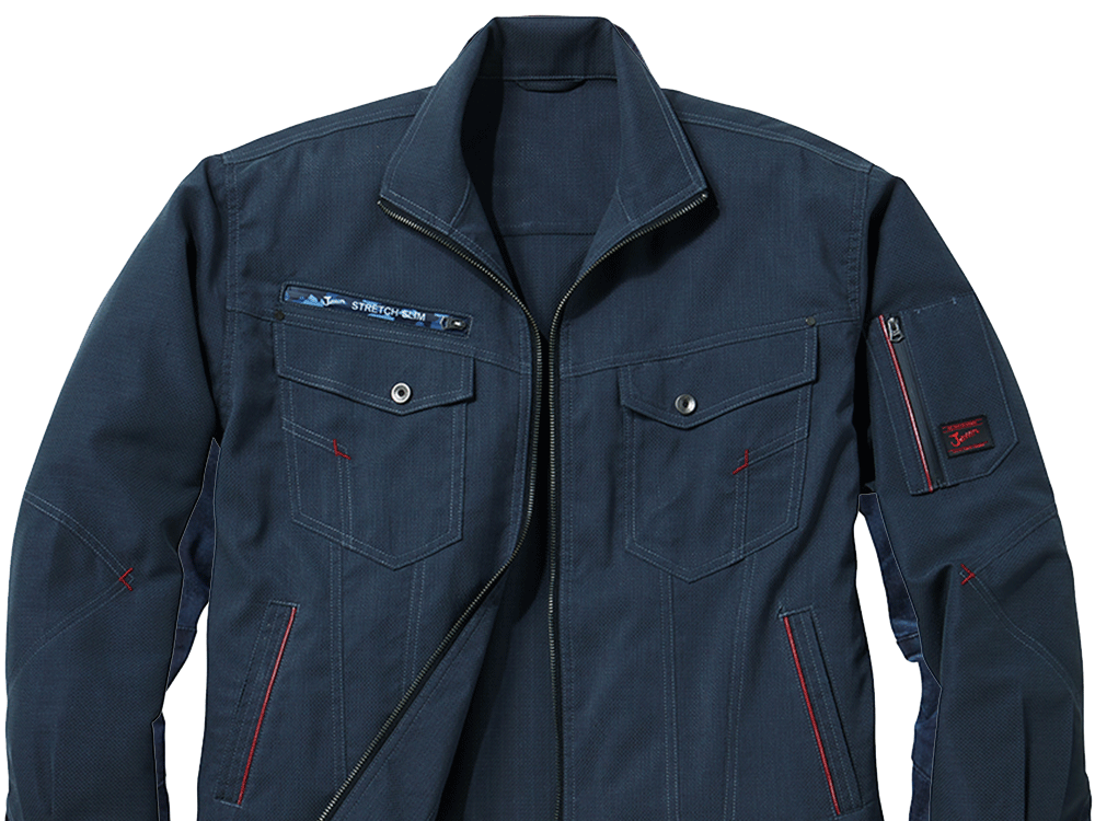 カジュアルテイストで、「Jawin」らしいオリジナルワッペンとレッドパイピングがポイントのストレッチ長袖ジャンパー。光沢感のある変わり織り素材を使っているためストレッチ性があり、体の動きに合わせてくれます。生地はボディフィールオックスでポリエステル率が高く、暑い場所での作業で汗をかいてもすぐに乾くのが嬉しいところ。カラーはシルバー、ネイビー、チャコールグレーの3色を展開。右胸元にはカモフラファスナーがついています。胸元のフラップ付きポケットは携帯電話対応サイズで、作業中の落下や紛失を防ぎます。
