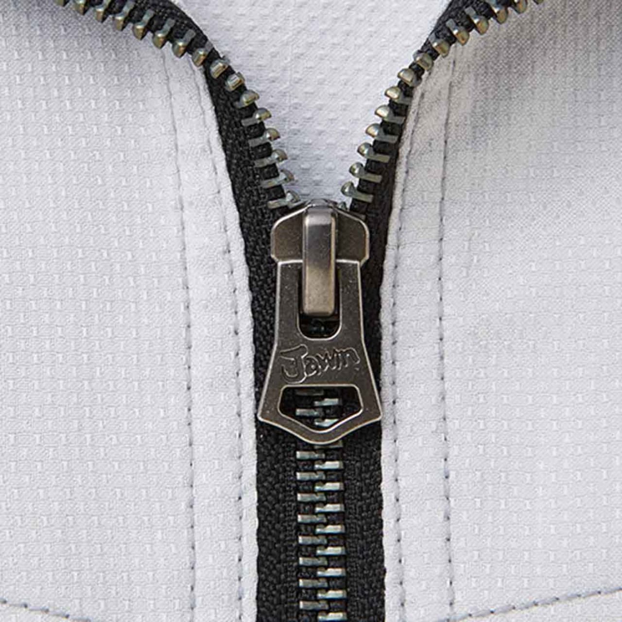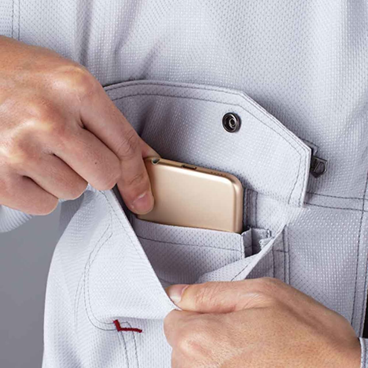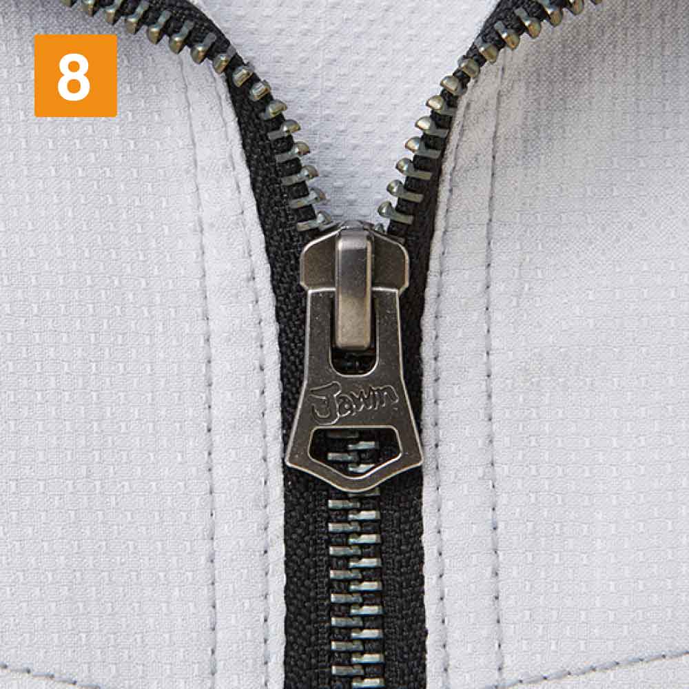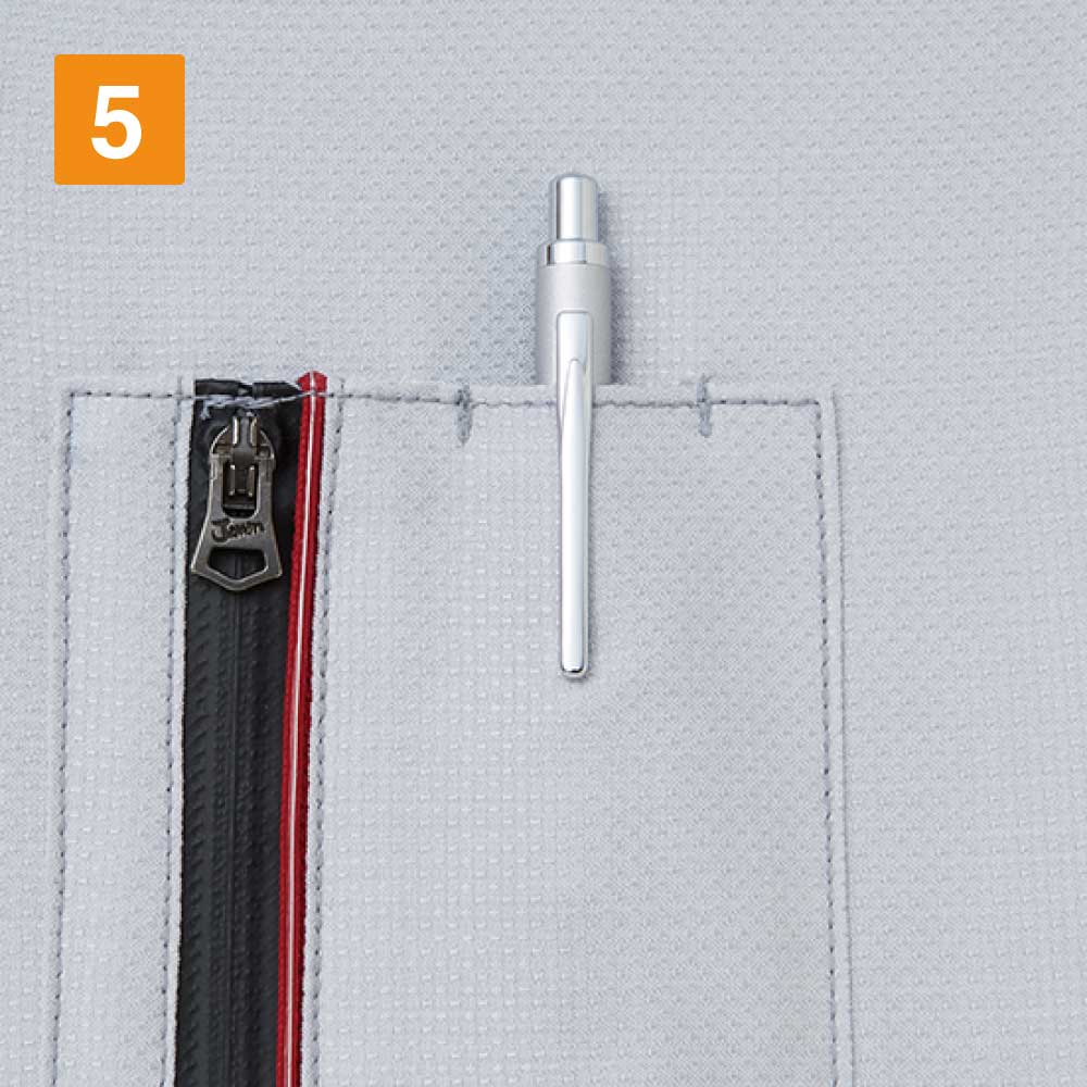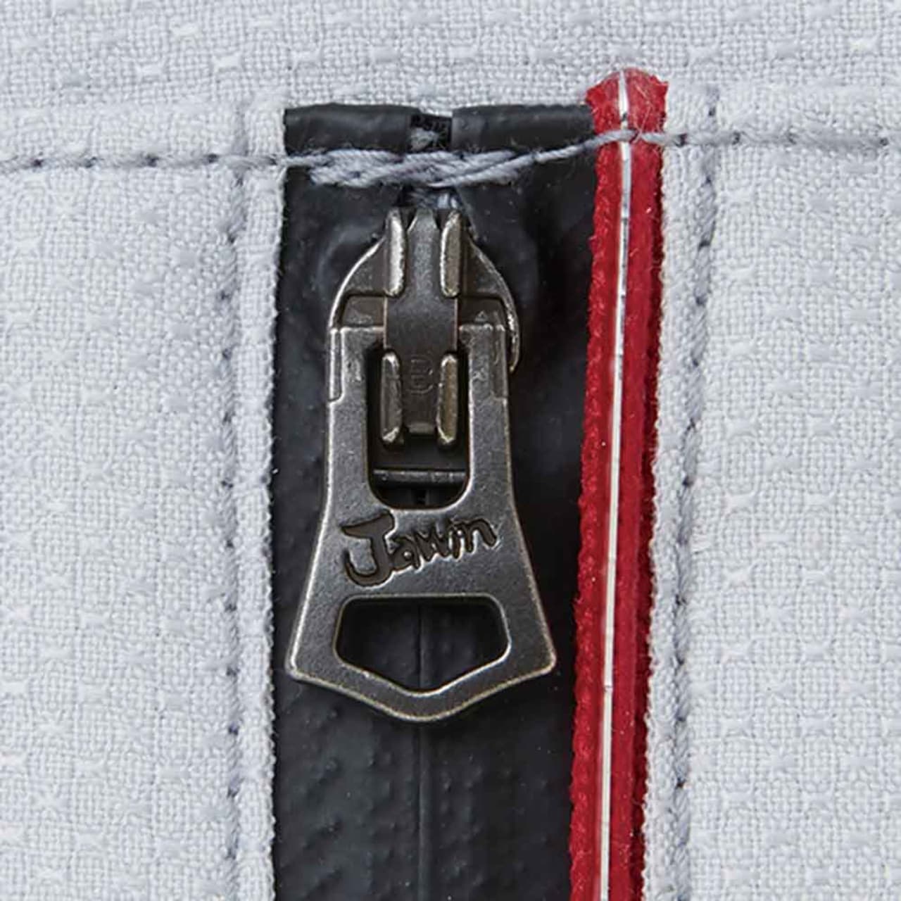 カジュアルテイストで、「Jawin」らしいオリジナルワッペンとレッドパイピングがポイントのストレッチ長袖ジャンパー。光沢感のある変わり織り素材を使っているためストレッチ性があり、体の動きに合わせてくれます。生地はボディフィールオックスでポリエステル率が高く、暑い場所での作業で汗をかいてもすぐに乾くのが嬉しいところ。カラーはシルバー、ネイビー、チャコールグレーの3色を展開。右胸元にはカモフラファスナーがついています。胸元のフラップ付きポケットは携帯電話対応サイズで、作業中の落下や紛失を防ぎます。