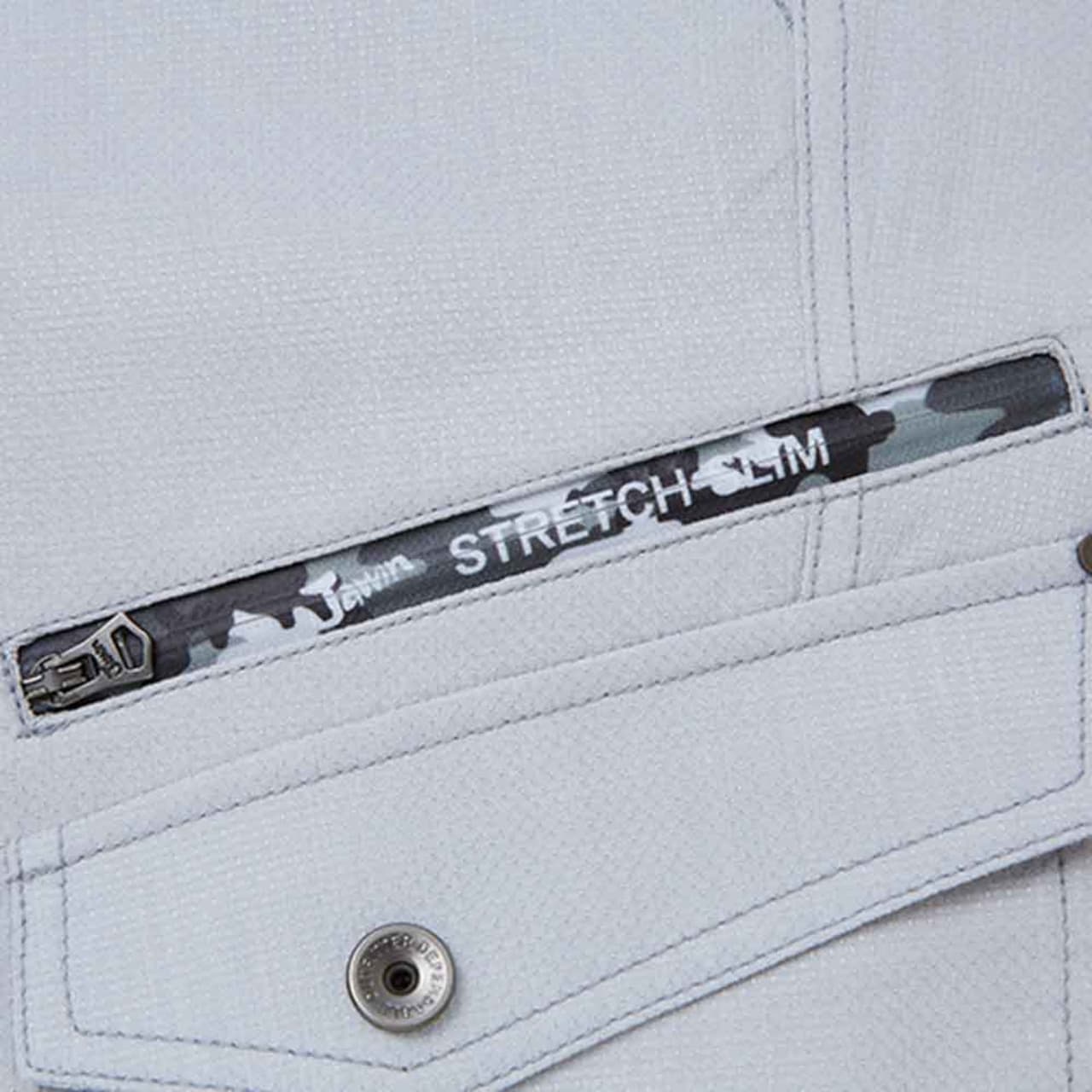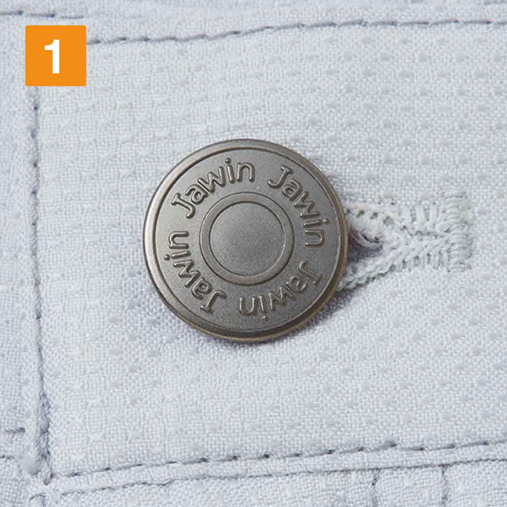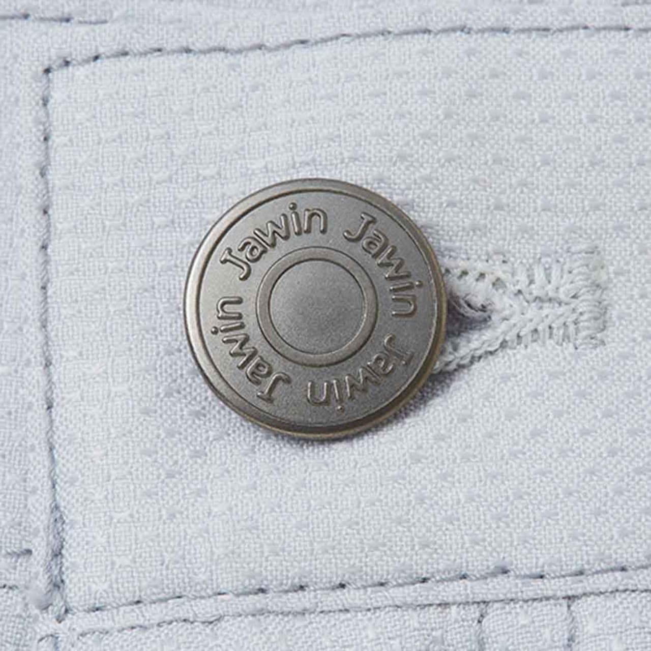 腿ポケットの上に施されたカモフラプリントのファスナーは、「Jawin」のロゴ入りでワイルドなテイストを高めています。ポケット部分のオリジナルロゴもアクセントになり、金属製のシルバーデザインボタンもクールなテイストに。カラータイプはネービー、シルバー、チャコールグレーと3色展開しており、シンプルな無地の生地でワンポイントのロゴやカモフラ柄ファスナーがアクセントになります。裾部分に紐を通して使ってもすっきりしたシルエットに。