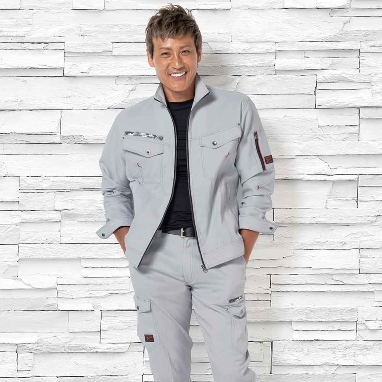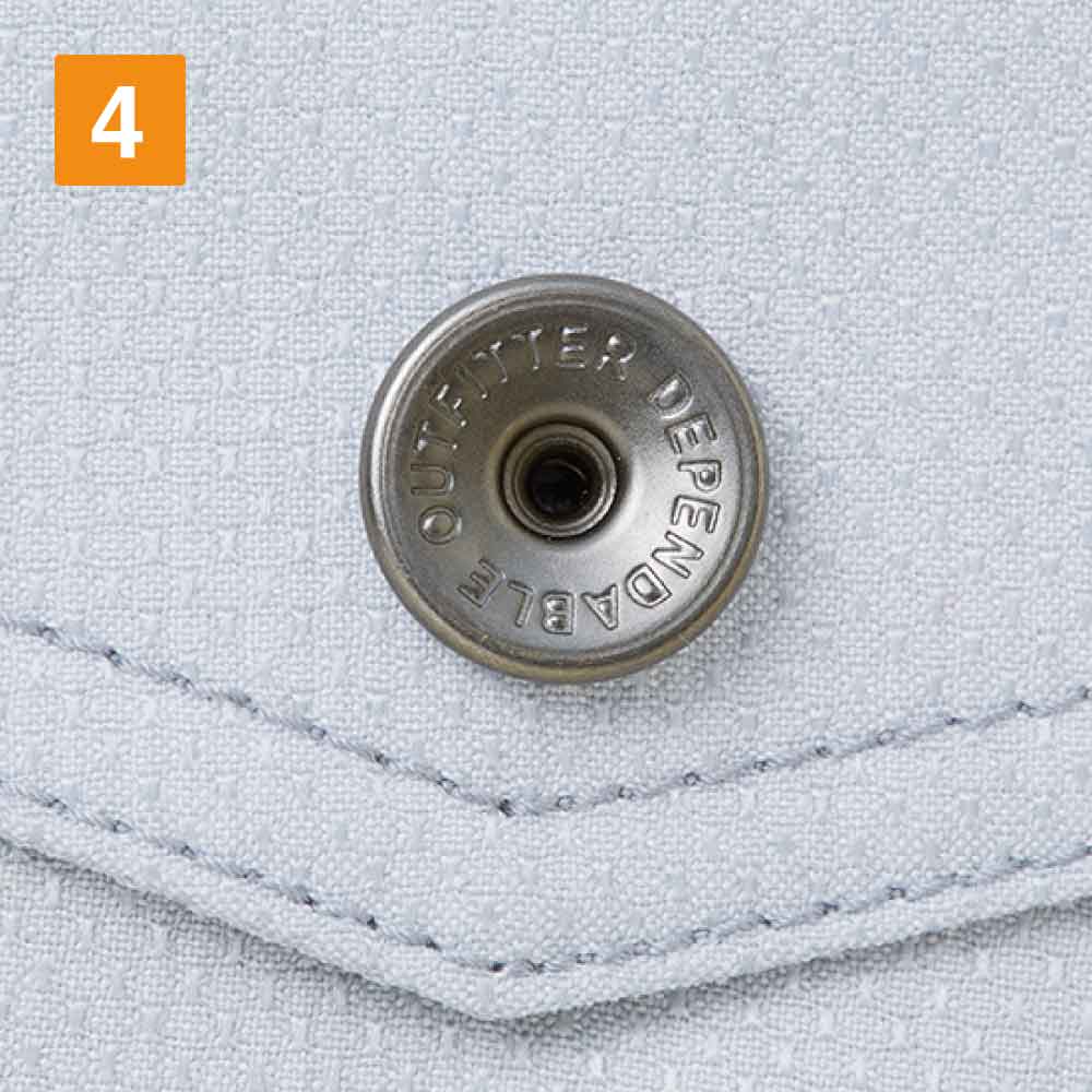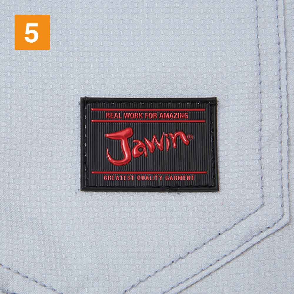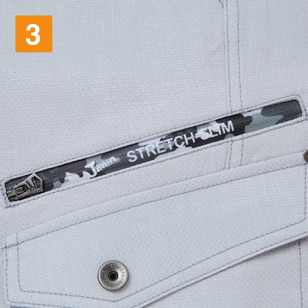 腿ポケットの上に施されたカモフラプリントのファスナーは、「Jawin」のロゴ入りでワイルドなテイストを高めています。ポケット部分のオリジナルロゴもアクセントになり、金属製のシルバーデザインボタンもクールなテイストに。カラータイプはネービー、シルバー、チャコールグレーと3色展開しており、シンプルな無地の生地でワンポイントのロゴやカモフラ柄ファスナーがアクセントになります。裾部分に紐を通して使ってもすっきりしたシルエットに。