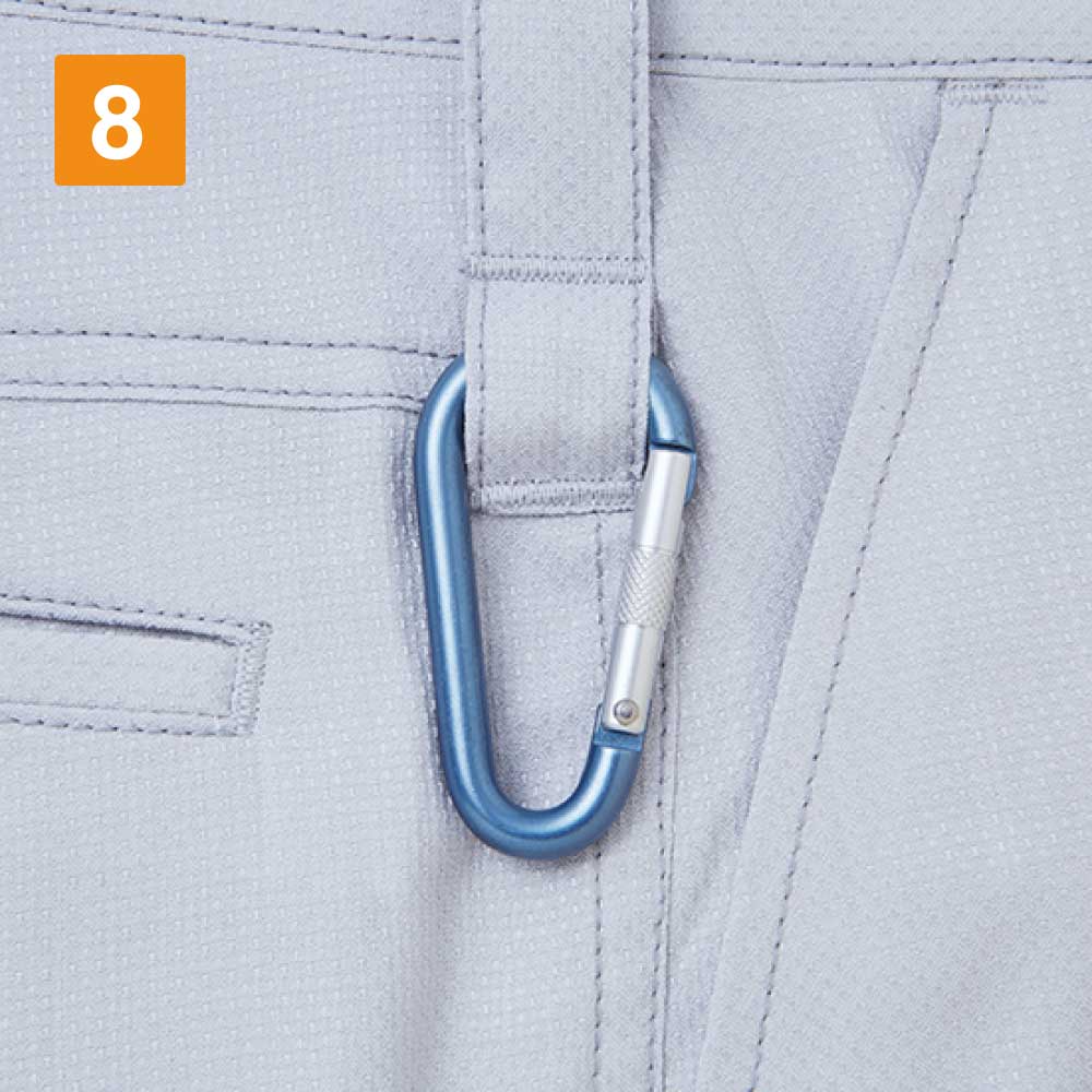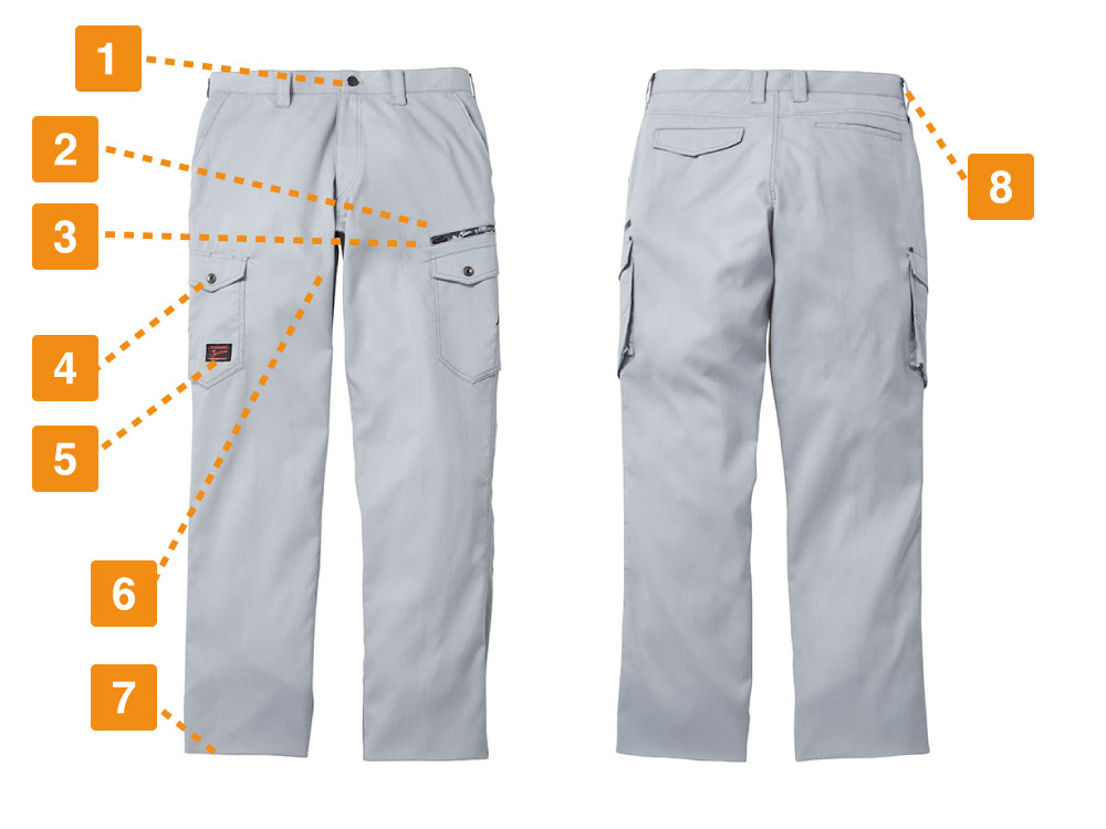 ストレッチノータックカーゴパンツは、変わり織りの光沢感のある素材で動きを邪魔しない特徴があります。速乾性が高く、汗をかいてもすぐに乾くので春夏の作業に最適なウエアです。汗のたまりやすい股部分には、消臭&抗菌テープ使用で臭い対策も。裾部分には紐通し穴があり、必要に応じて紐を入れて裾を絞ることができます。ポケットはフラップ付きとなしがあるため、用途による使いわけも可能。野帳や携帯電話が入る大きめのサイズで、必要な小物の収納に便利です。