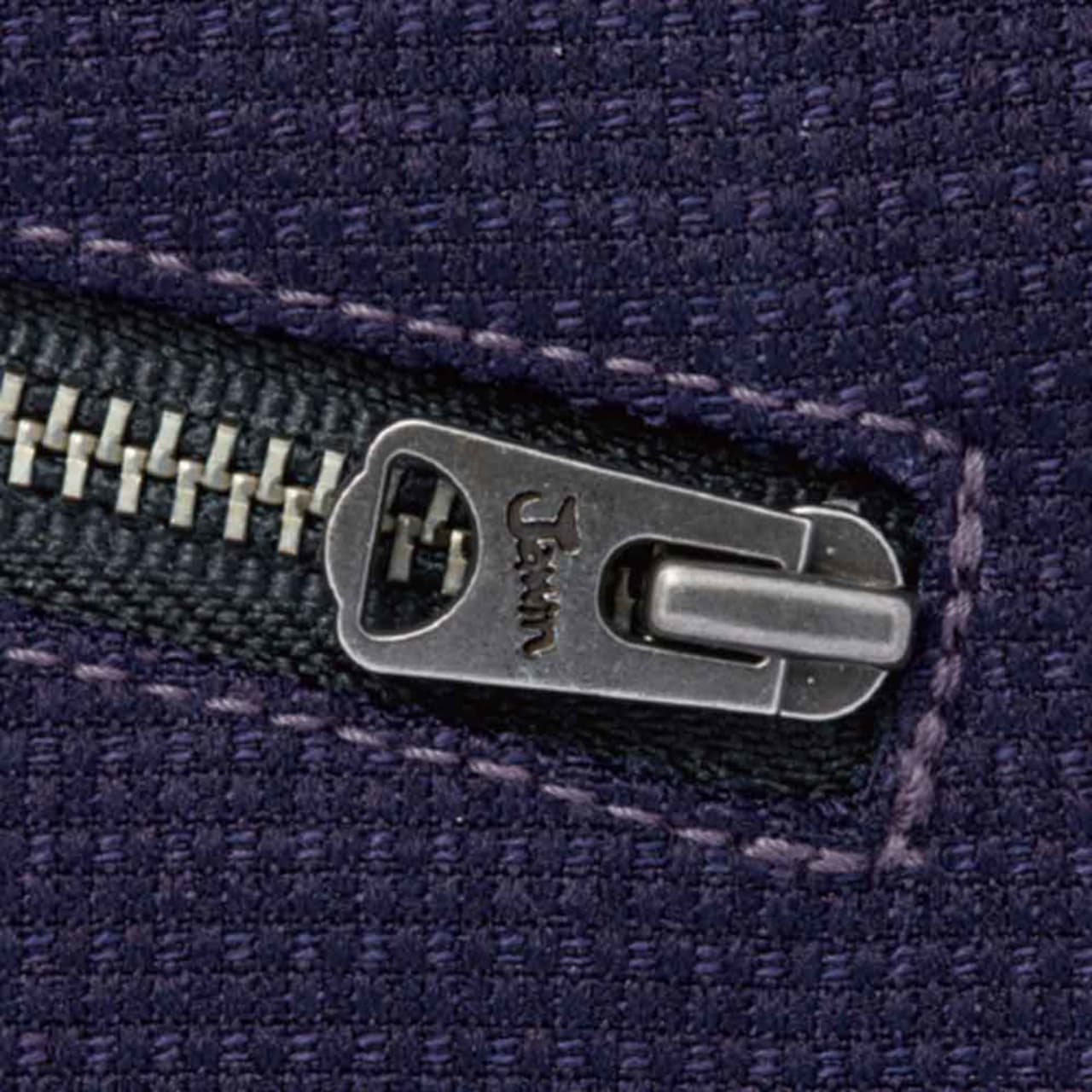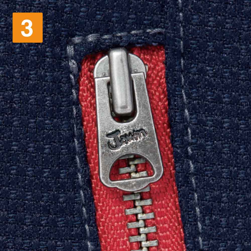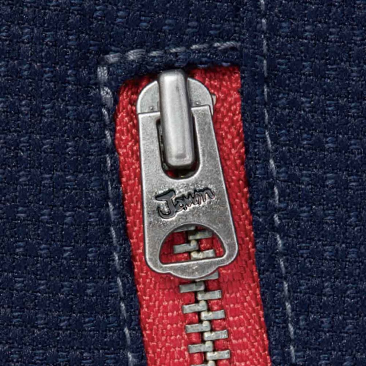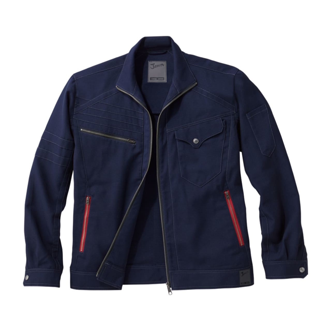 ワークウエアとして伸縮性と強度に優れたストレッチジャンパーですが、すっきりしたシルエットも備えており高いデザイン性も持っています。腰ポケットのレッドファスナーは3色どのカラーにもある「Jawin」らしいワンポイント。シンプルで落ち着きのあるカラーによく映えます。左はフラップ付きポケット、右はファスナー付きポケットとデザインが異なるところも特徴です。スマホやメモ帳は左に、細かい物は右にと使い分けができます。ファッション性の高いウエアですが、ポリエステル率の高いボディフィールオックス生地を使っているため動きやすさと速乾性にも優れています。ツヤの落ち着いたシルバー色の金属ボタンも耐久性と実用性に優れた仕様です。