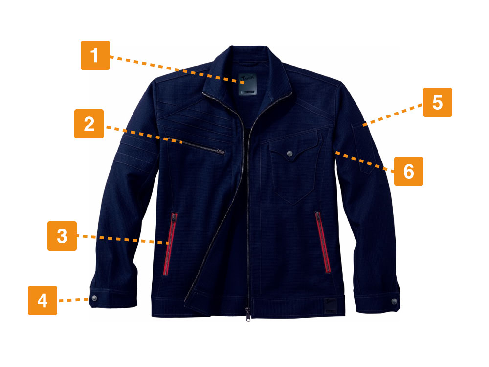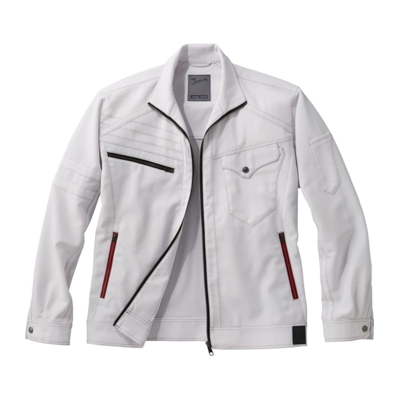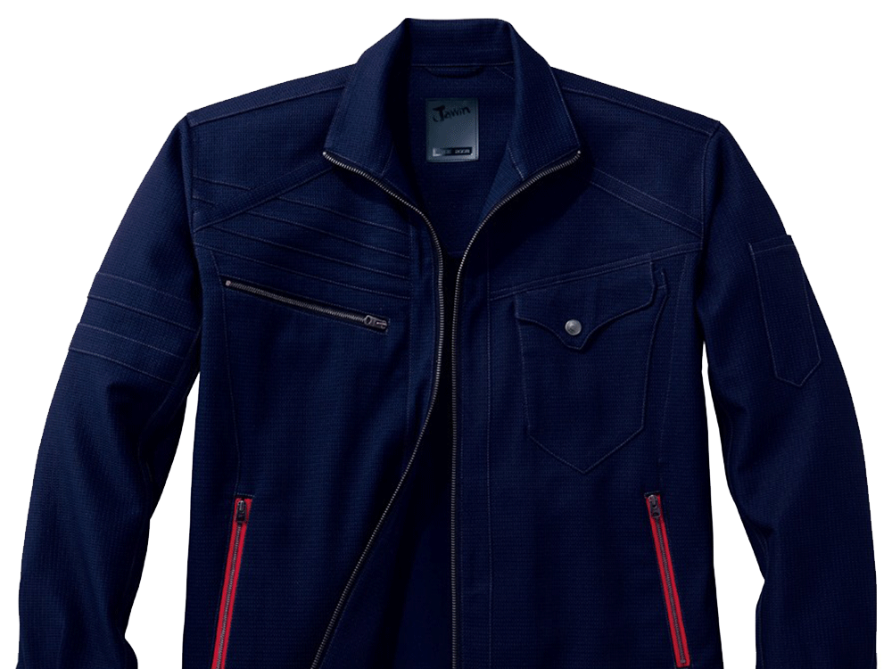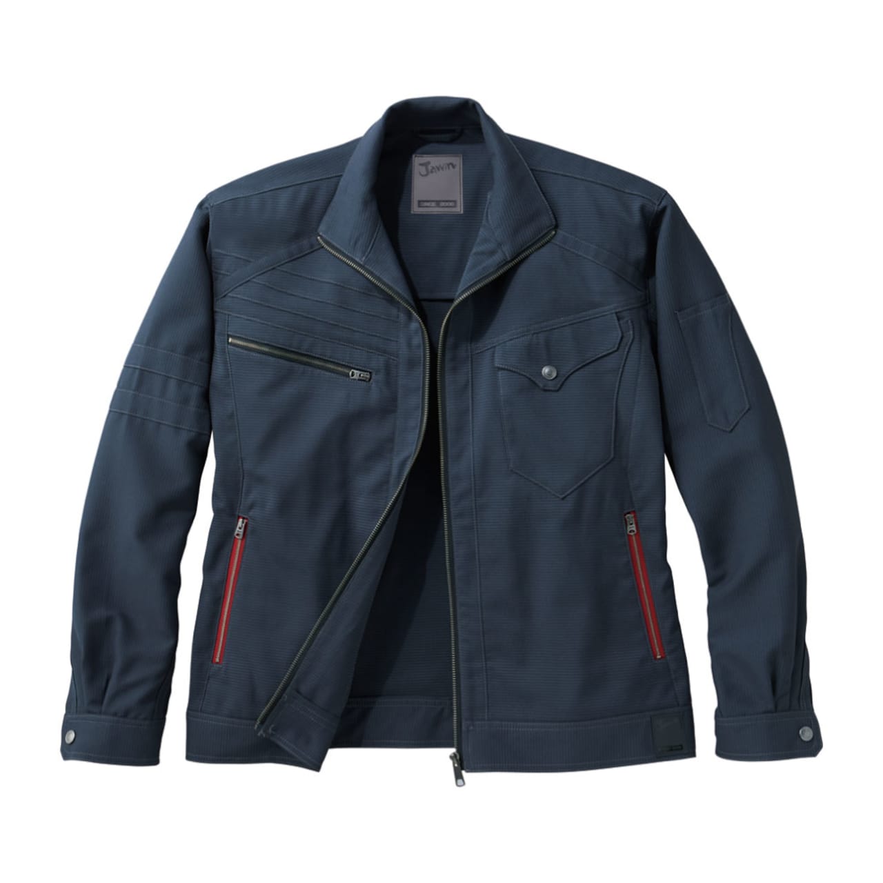 ワークウエアとして伸縮性と強度に優れたストレッチジャンパーですが、すっきりしたシルエットも備えており高いデザイン性も持っています。腰ポケットのレッドファスナーは3色どのカラーにもある「Jawin」らしいワンポイント。シンプルで落ち着きのあるカラーによく映えます。左はフラップ付きポケット、右はファスナー付きポケットとデザインが異なるところも特徴です。スマホやメモ帳は左に、細かい物は右にと使い分けができます。ファッション性の高いウエアですが、ポリエステル率の高いボディフィールオックス生地を使っているため動きやすさと速乾性にも優れています。ツヤの落ち着いたシルバー色の金属ボタンも耐久性と実用性に優れた仕様です。