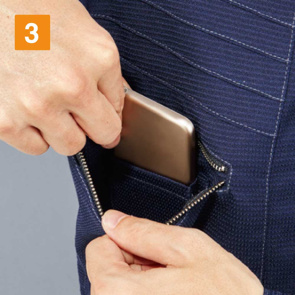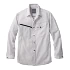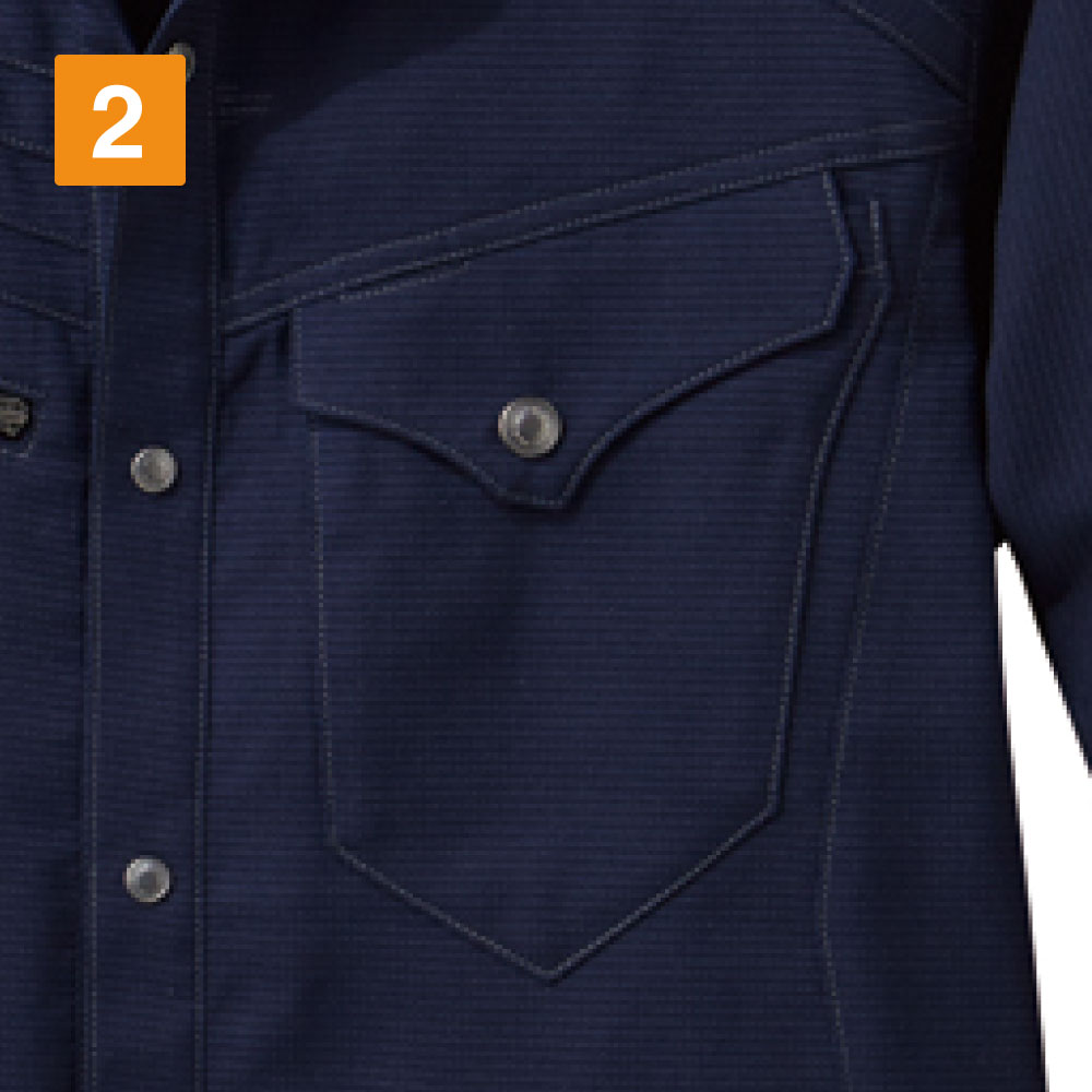変わり織りが特徴のボディフィールシリーズの素材を使った、ストレッチ長袖シャツ。気温の高い場所での作業や、アクティブワークで暑くなったときも通気性が良く、湿気がこもりません。伸縮性に優れた素材でできており、腕の上げ伸ばしもスムーズで、ハードな作業にも対応します。着用時のすっきり見える縫製で、シルエットがキレイなことも大きな特徴のひとつ。胸ポケットはファスナータイプとフラップタイプのアシンメトリーなデザインで、小物を入れて作業しても、紛失しにくく安心です。左の二の腕部分にはペン差しもあり、筆記具の持ち運びに便利。