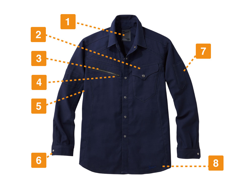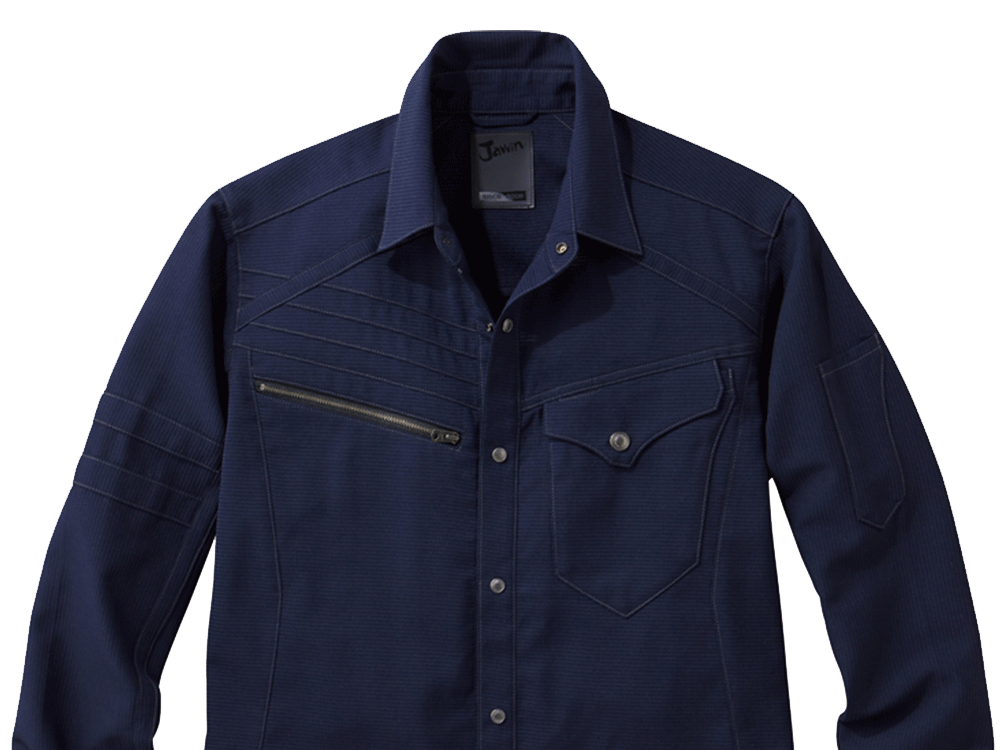 体にほどよくフィットする、すっきりとしたシルエットのストレッチ長袖シャツです。3種類のカラーはどれも落ち着いており、胸元のブラックファスナーがワンポイントに。裾部分には「Jawin」のロゴ刺繍も入っており、ブランドらしさが出ています。金属ファスナーや金属ボタンもアクセントになっています。春夏向けのアイテムらしく通気性が良い生地のため、活動的に作業をして汗をかいても心地よい着用感をキープ。伸縮性にも優れているので、体の動きに合わせて生地が伸び縮みし、ワーカーの作業を妨げません。