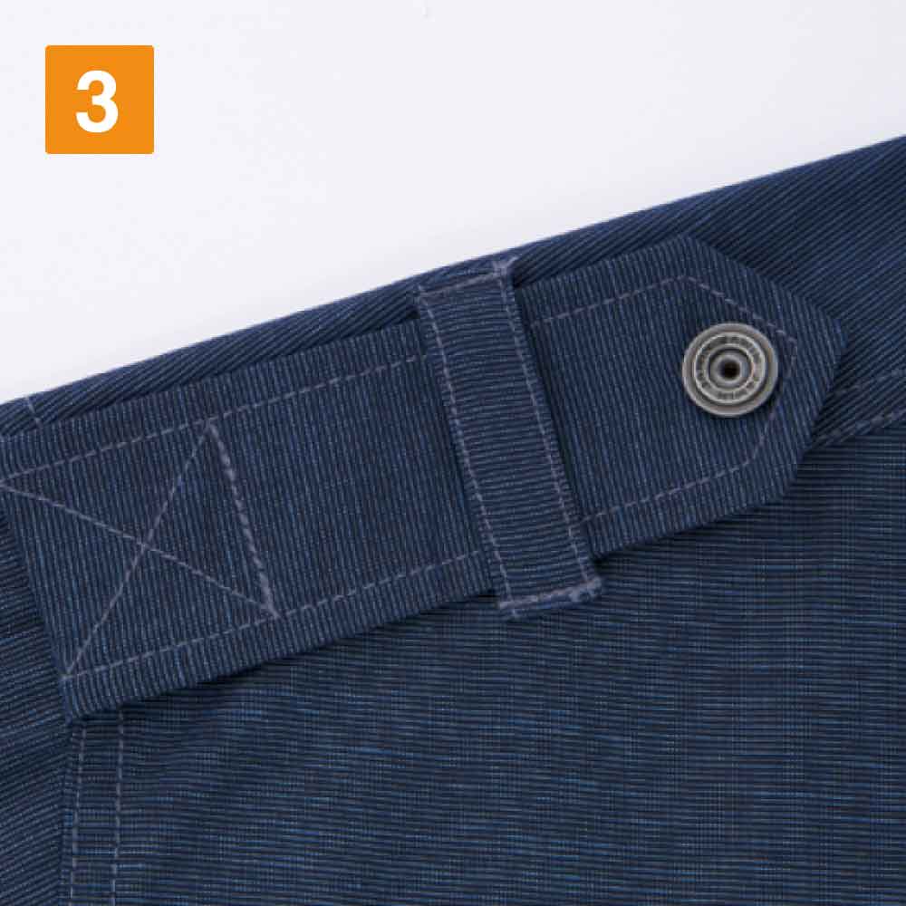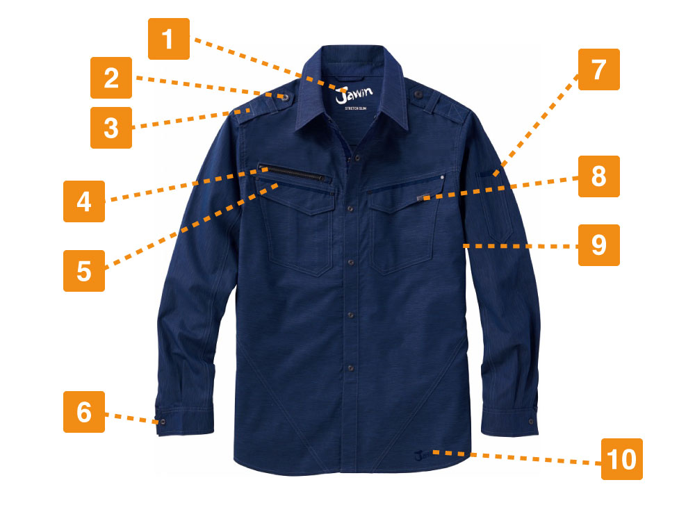 ストレッチ長袖シャツは、ストレッチ素材を採用しているため、伸縮性が高くなっています。作業を効率的に行える作業着はストレッチ性が重要になるため、伸縮性に富んだ記事はおおきな魅力的なポイントのひとつです。全体的にシンプルなデザインに見えますが、細かい部分にはこだわりが詰め込まれています。袖部分のロゴや、背当てプリントは、シンプルさの中に機能性とデザイン性が備わっていることが特徴です。また、ボタンには、デザインボタンを採用し、全体のアクセントに。ポケットは胸元に容量が大きいポケットがあります。