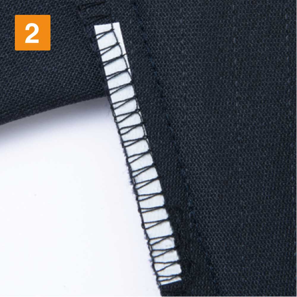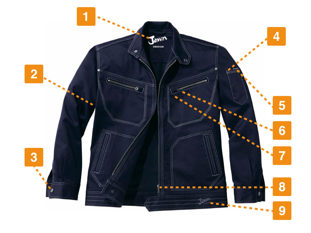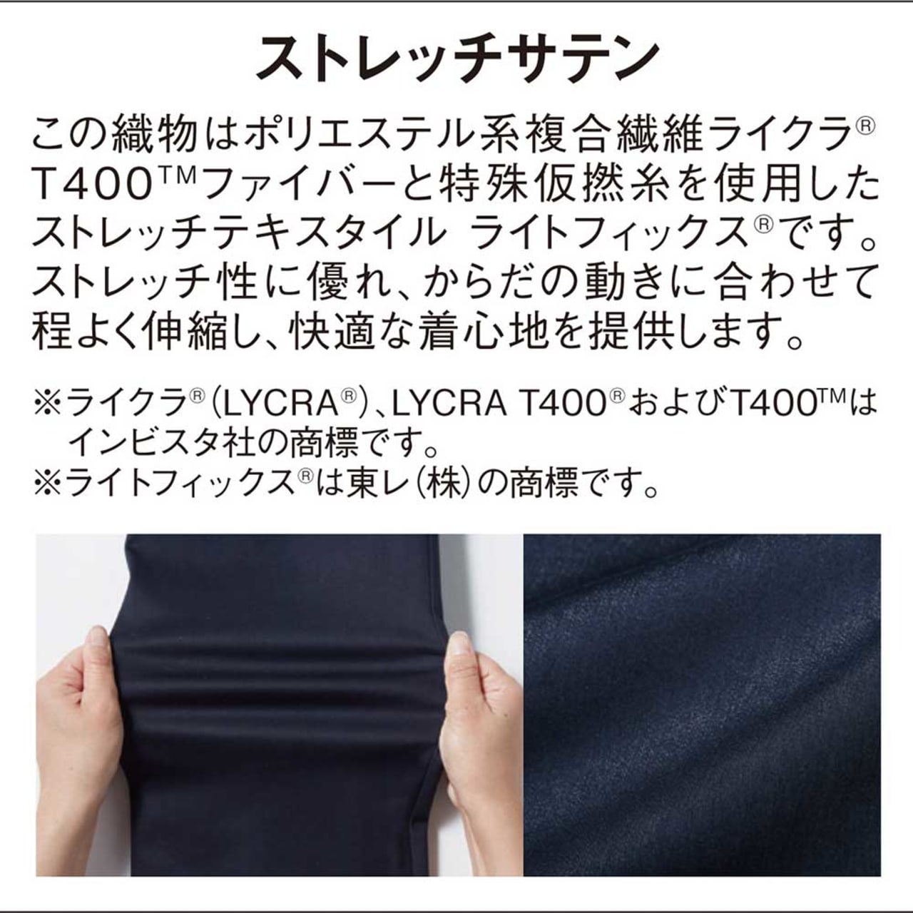 世界最大級のポリマー・繊維総合企業であるインビスタ社のポリエステル系複合繊維ライクラT400ファイバーと、合成繊維を扱う大手企業である東レの特殊仮撚糸を使用したストレッチテキスタイルライトフィックスという素材を使用したストレッチサテンは、程よい伸縮性によって、快適な着心地を実現しています。ストレッチサテンの使用により、通常のジャンパーに比べスリムなデザインが可能に。あらゆるワークシーンに対応し、ストレスなく作業ができます。