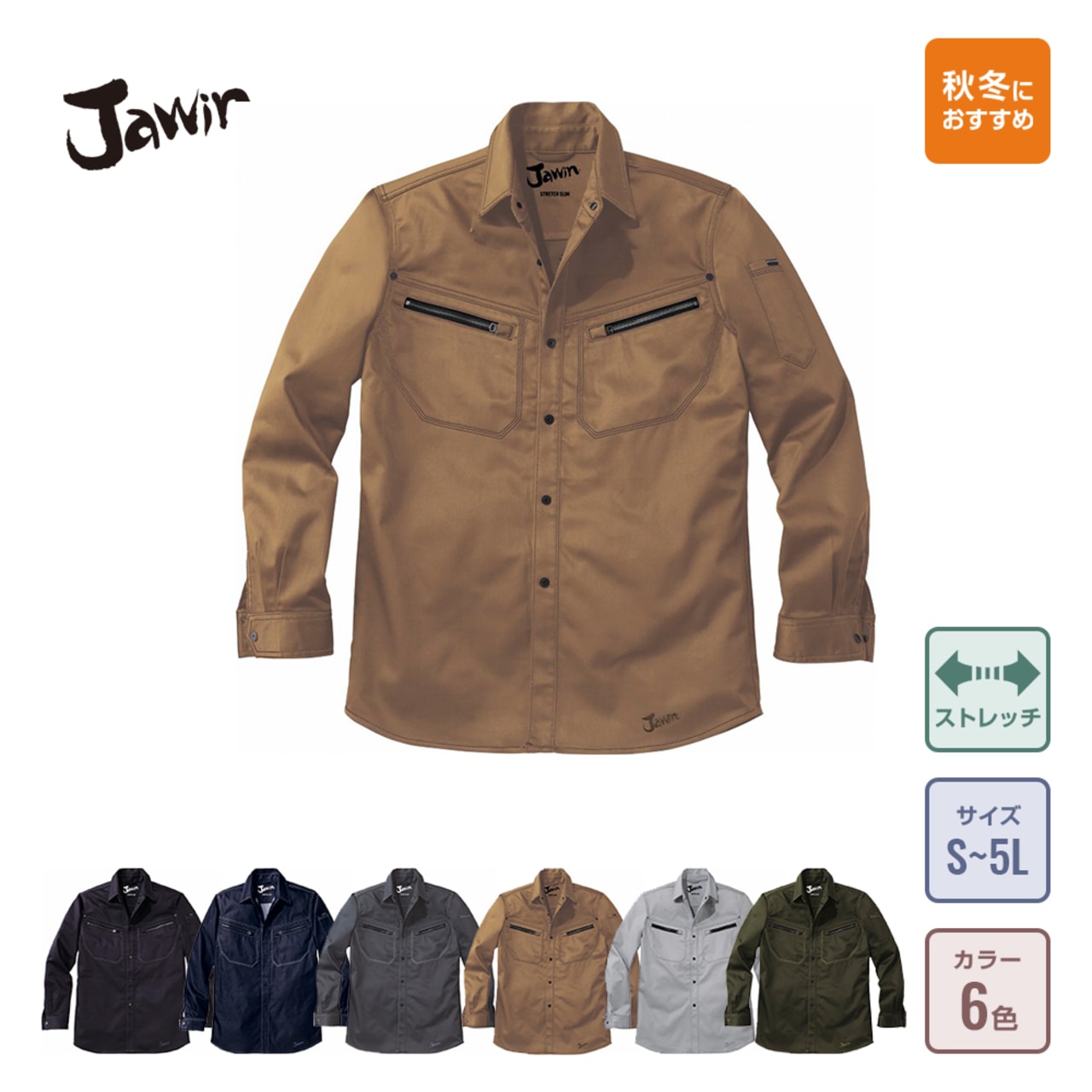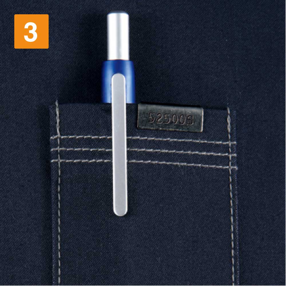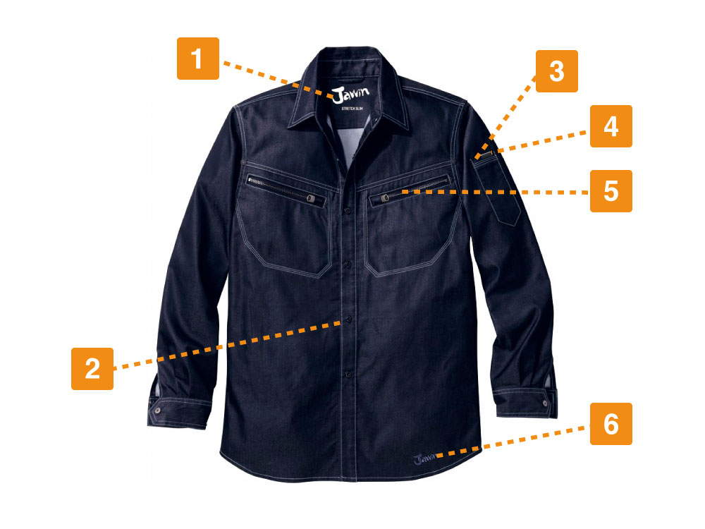 作業する際に重要視したいポイントと言えば、何よりも動きやすさではないでしょうか?ストレッチサテンと呼ばれるストレッチ性の高い生地を使用したストレッチ長袖シャツは、とても動きやすく、体の動きに合わせて程よく伸縮するため、着心地も抜群です。また、6色の豊富なカラー展開も嬉しいポイントのひとつ。一見シンプルな長袖シャツに見えるものの、ファスナー付きポケットやペン差しなど、使い勝手の良い機能も兼ね備えた高機能な長袖シャツは、作業時に最適なアイテムです。