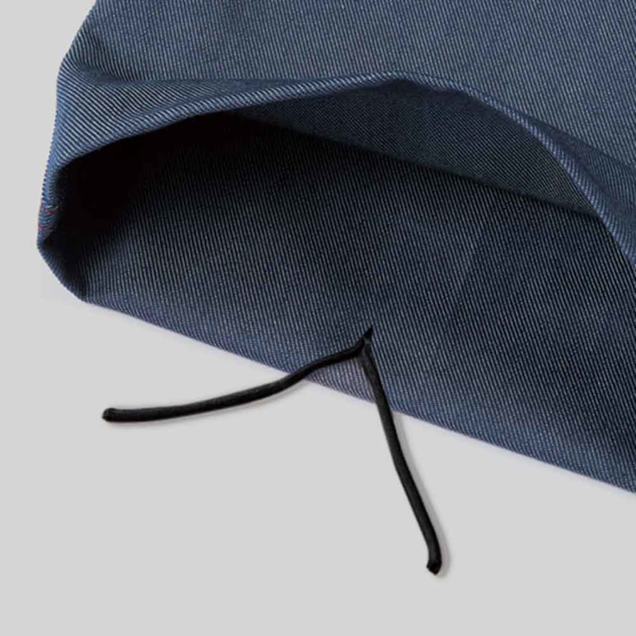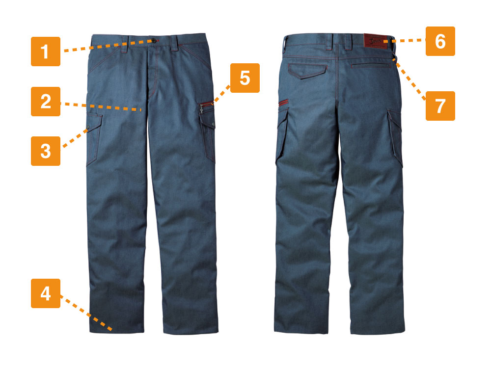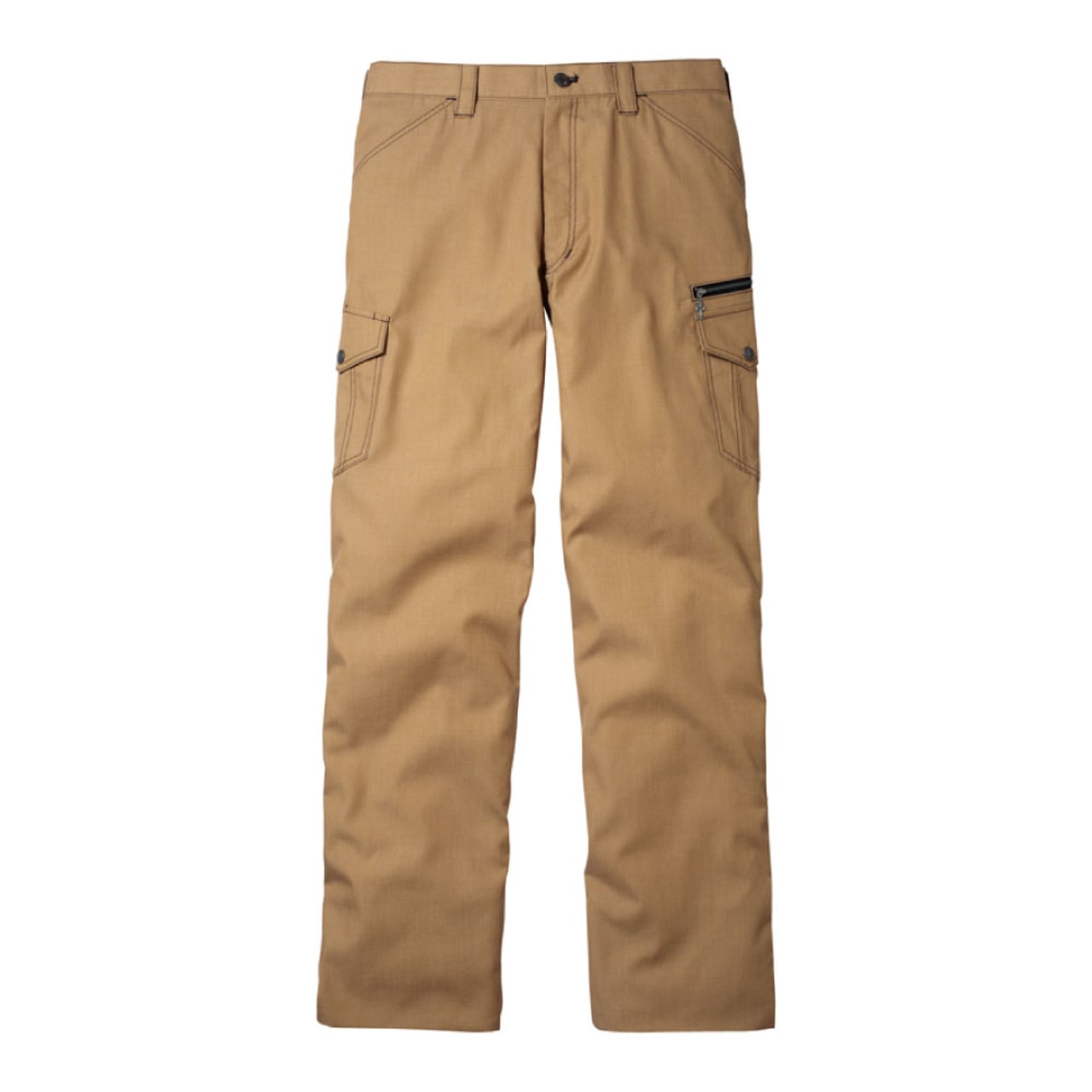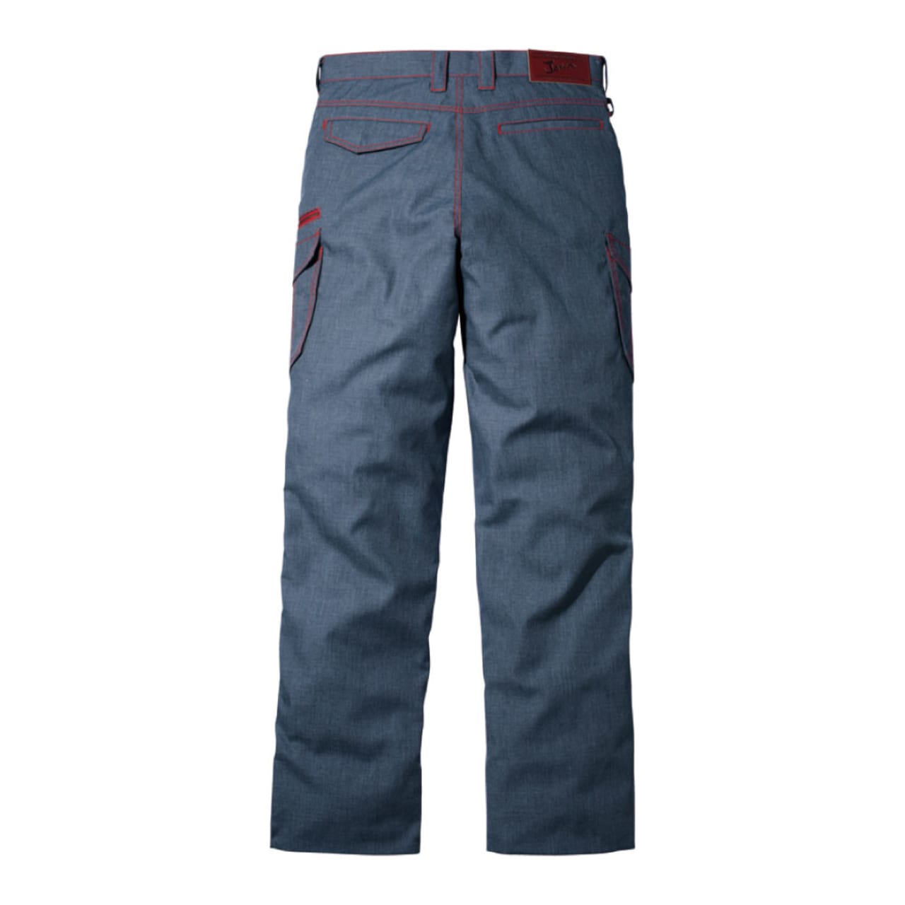 ノータックカーゴパンツは、お揃いのジャケットに合わせてデザイン性の高いパンツとなっています。デザインボタン、ロゴ入りスライダー、革ラベル、アシンメトリーデザインと意匠性が高いこともおすすめポイントです。11サイズ・4色展開になっているので、自分の体形や好みから選ぶことができます。丈詰めをすると裾紐通し穴が使えなくなるので、裾を絞ったり上げたりしたい場合には、裾紐通し穴にゴムを入れて丈を調整することをおすすめします。帯電防止素材なので静電気が溜まりにくく、静電気による着火事故などを防ぎ作業しやすいように設計されています。