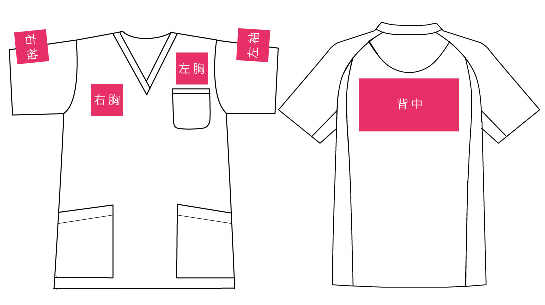 スクラブには高級感があり、耐久性のある刺繍加工がおすすめ!チーム名、施設名やロゴマークを背中に刺繍でいれる加工が人気です。