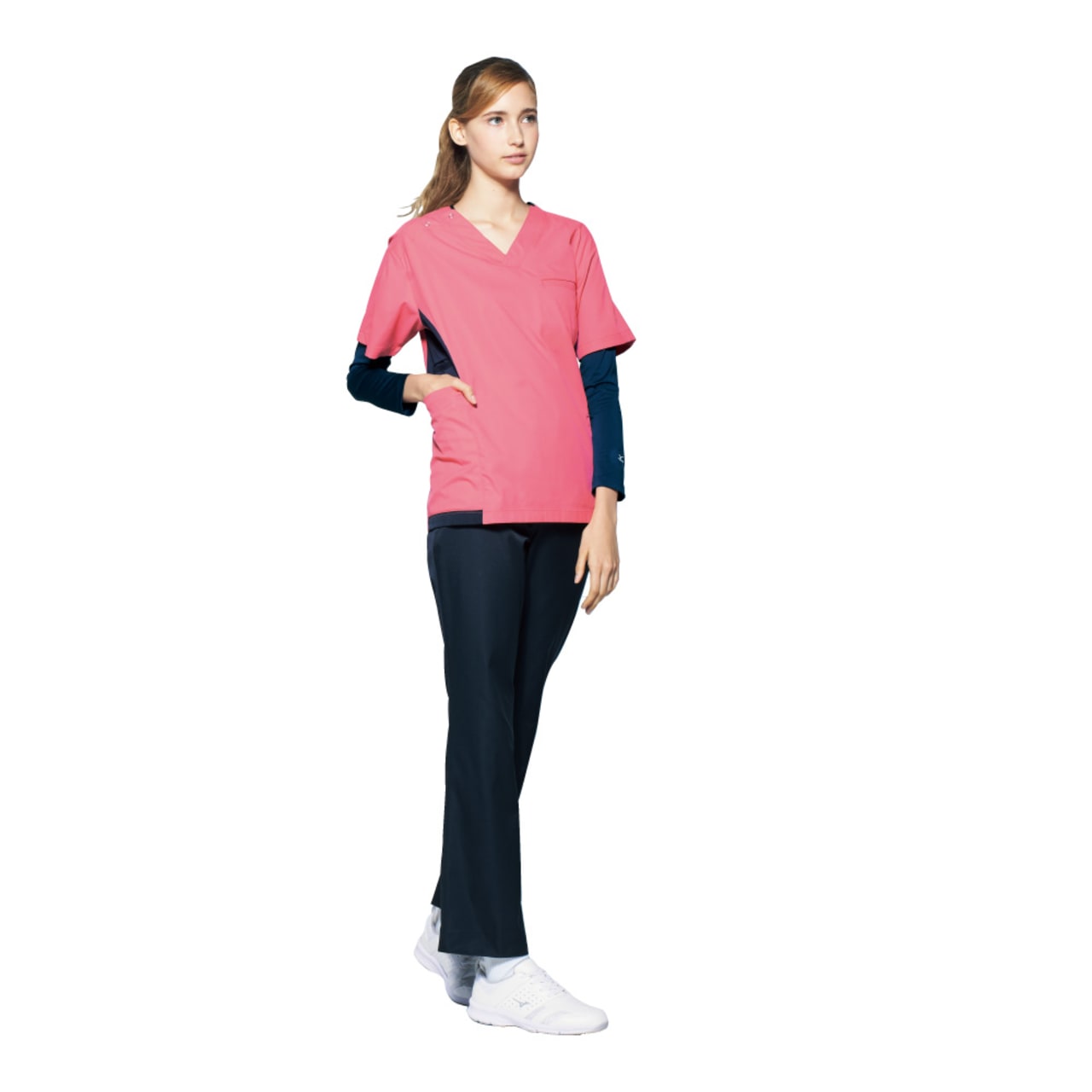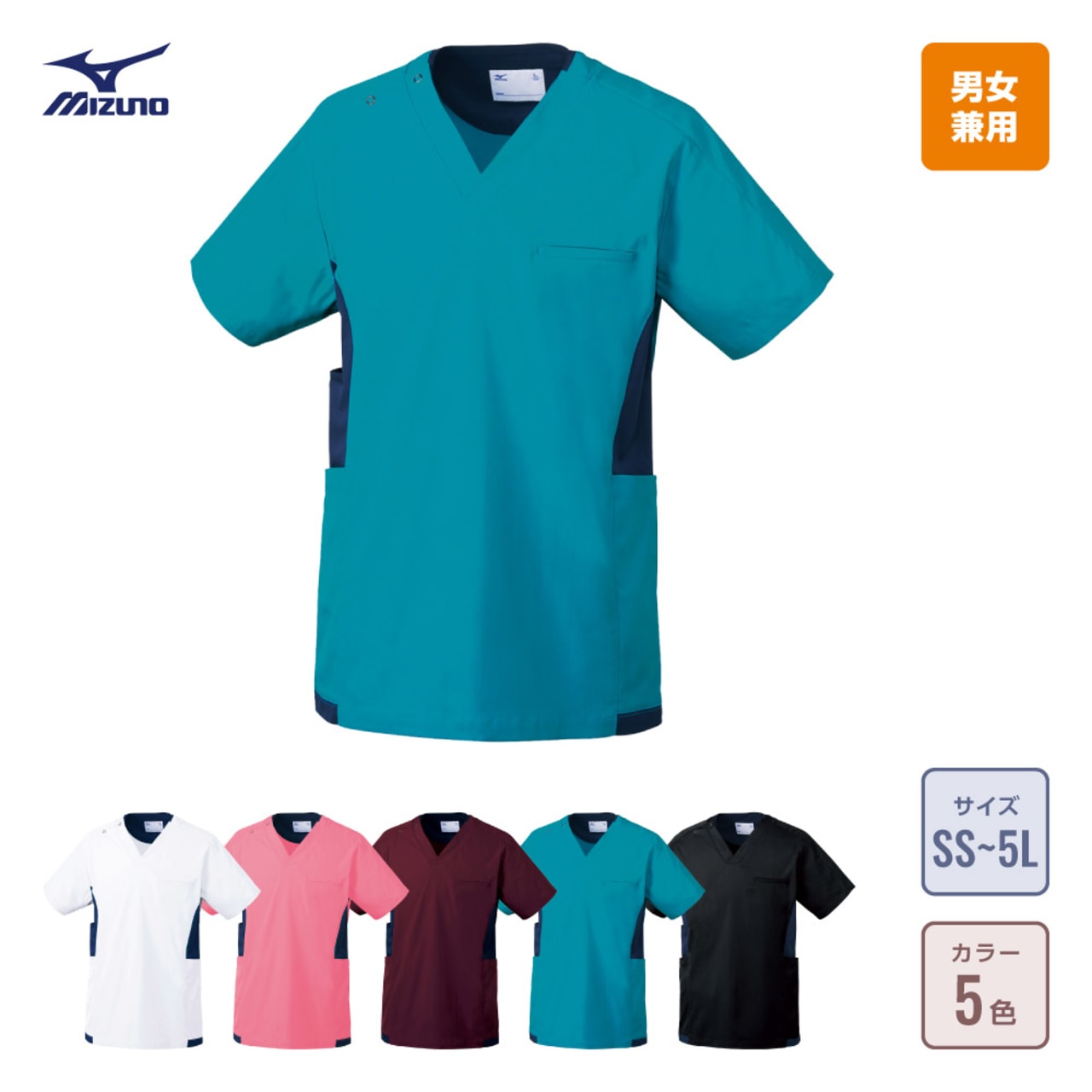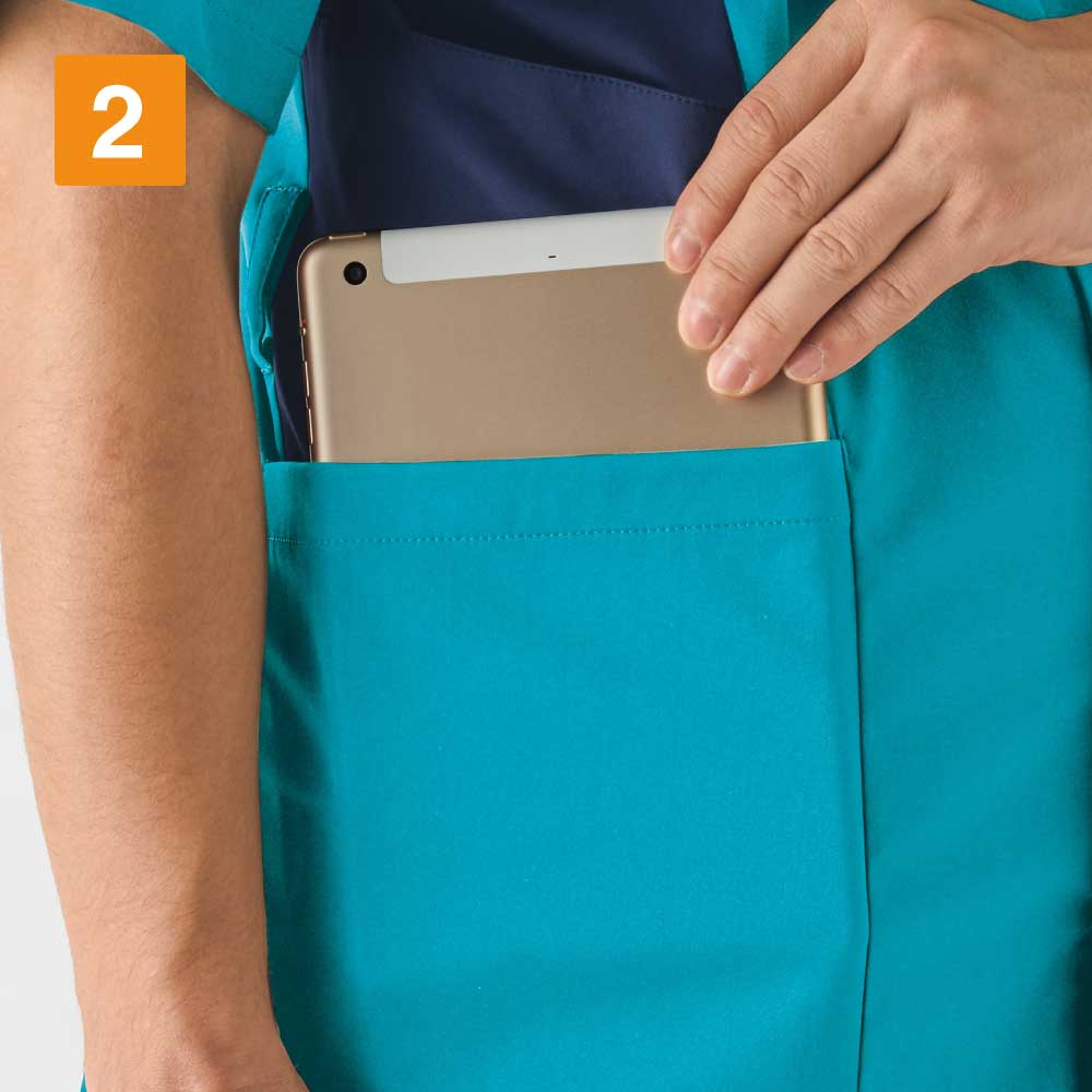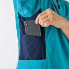 スポーツメーカーであるミズノのスクラブ。脇に切替しが入っておりスポーツメーカーのスクラブらしくスポーティーな印象を与えてくれます。刺繍を入れる場合は背中やソデに入れるのがおすすめです。