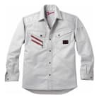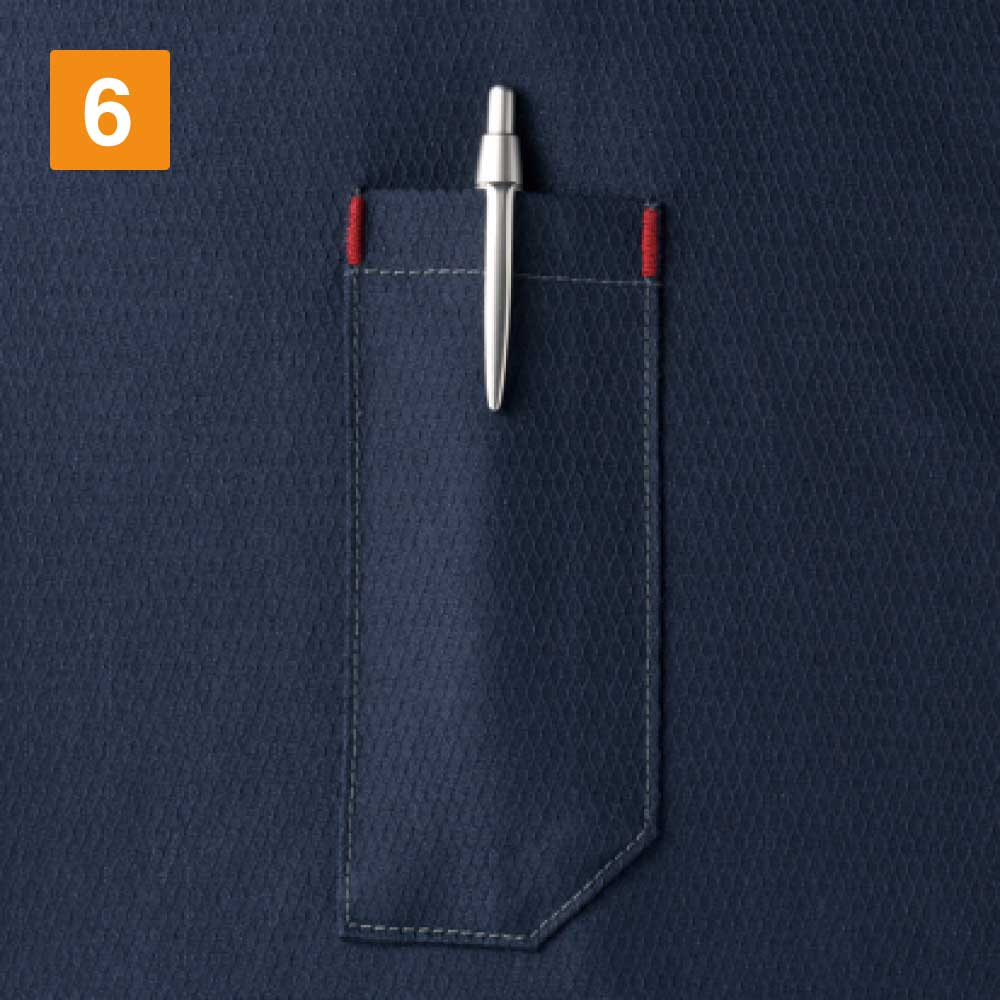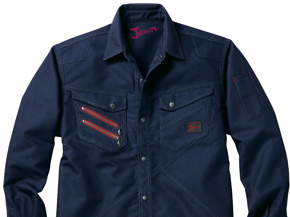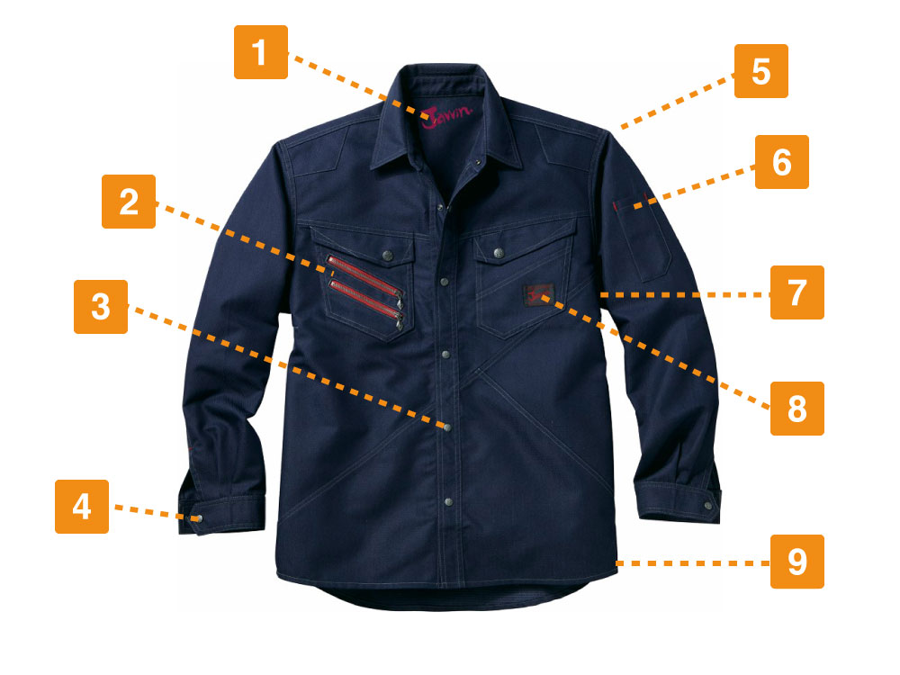 長袖シャツには、ジャンパーと同じ意匠登録済みのアコーディオニットを採用しています。全体的なデザインは、シンメトリーデザインやツインファスナーを取り入れているためハード感のあるデザインとなっています。背中の肩部分にあるアコーディオニットによって、より高い伸縮性を実現しているのも作業効率を高めるポイントの1つです。機能性が優れている長袖シャツですが、細かい部分のデザイン性にもこだわっています。右胸ポケットのファスナーにはロゴ入りスライダーがついていますし、左胸ポケットにはワンポイントがついています。そのため、機能性とデザイン性の両方を求めている人に着用していただきたい長袖シャツだと言えます。