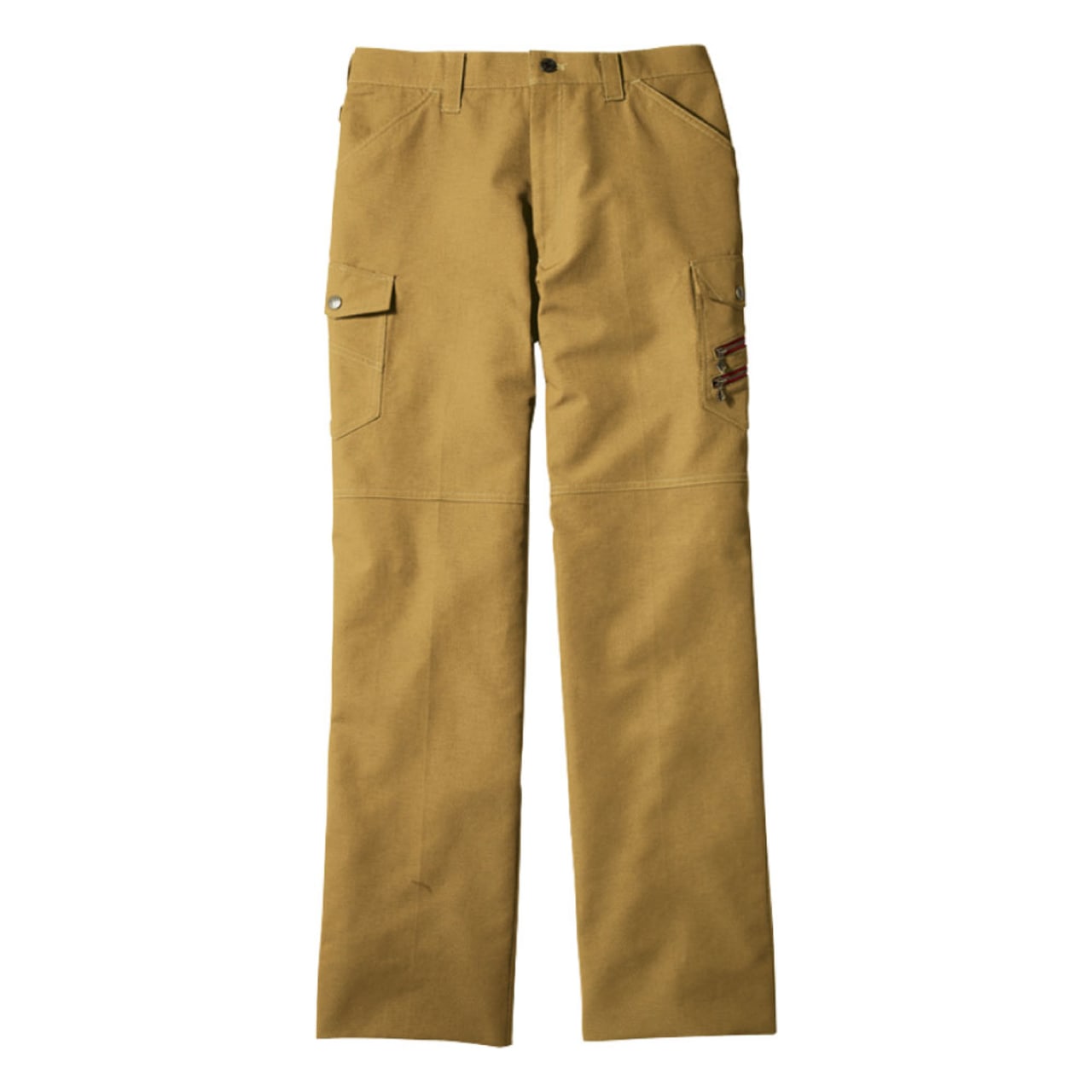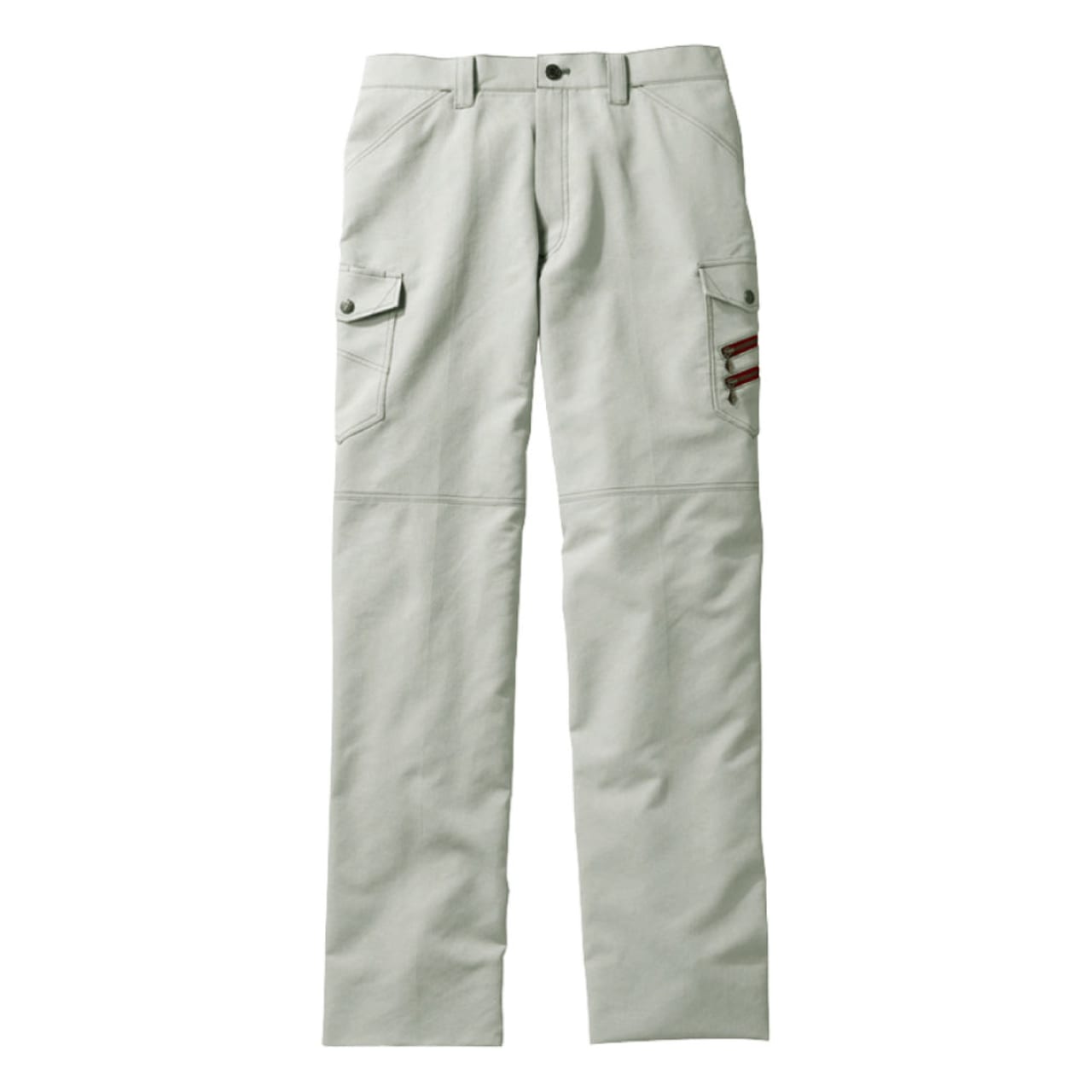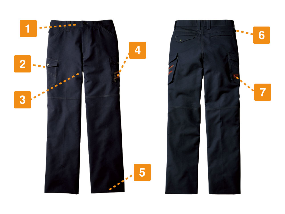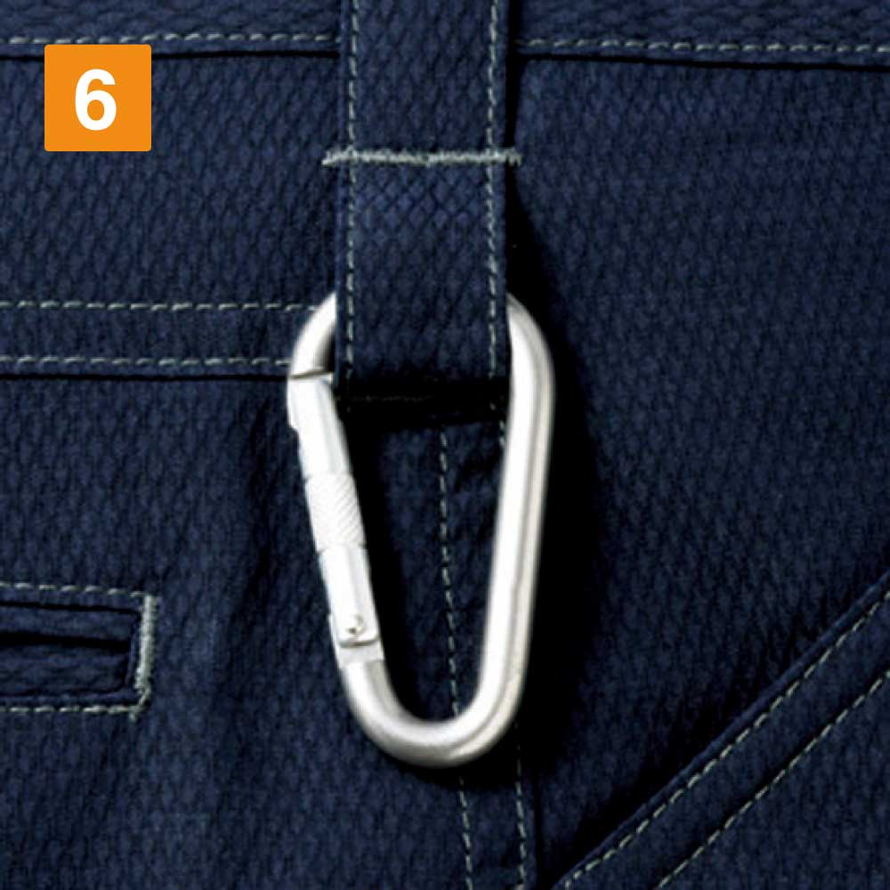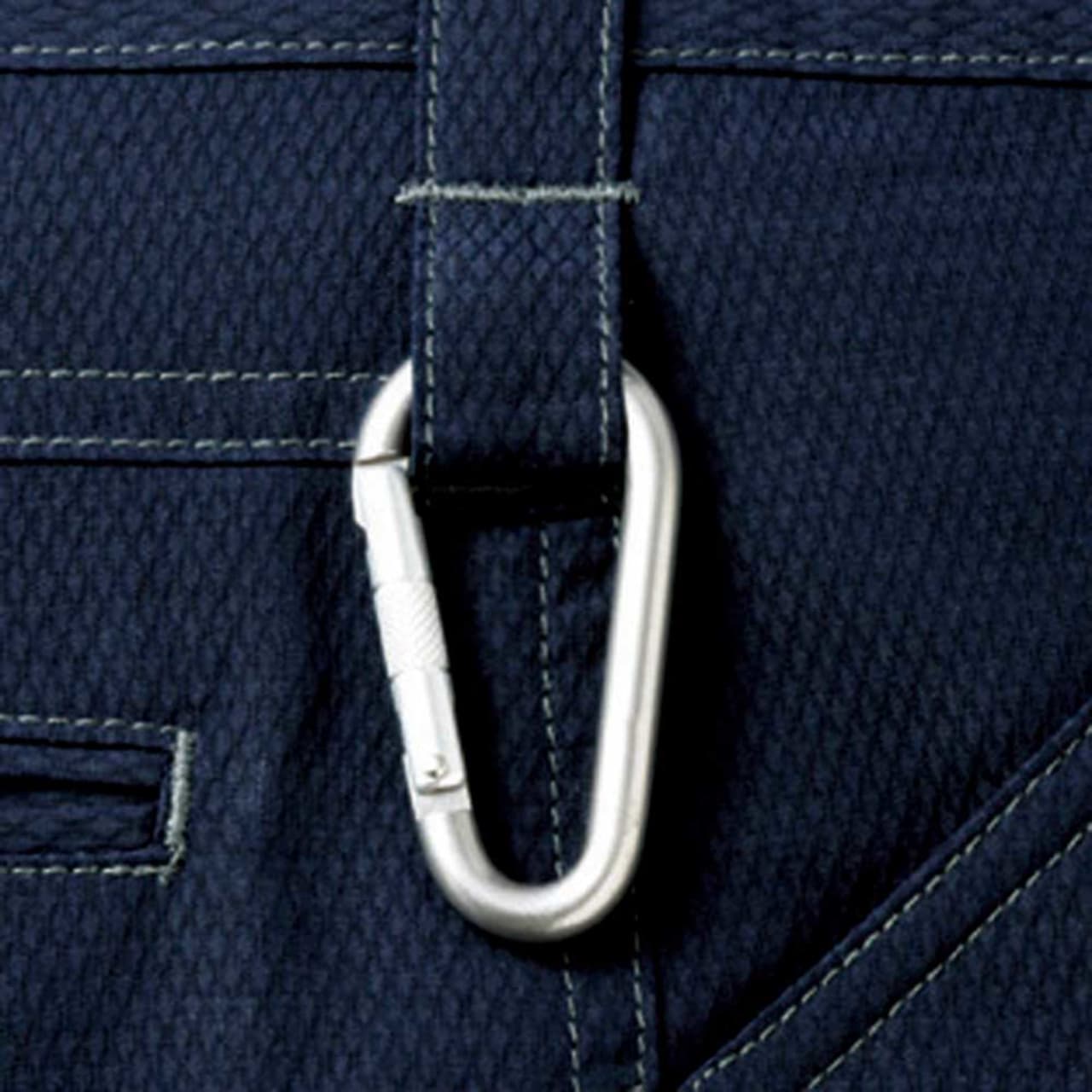 ノータックカーゴパンツに使用しているデニム生地は伸縮性に優れたストレッチ素材なため、デザイン性はもちろん、機能性にも優れています。適度な伸縮性は膝の曲げ伸ばしを邪魔しないので、ストレスのない作業が可能です。サイドのポケットは5つあり、右脇のカーゴポケット上部にはファスナータイプのポケットを採用しているので安心して利用できます。右サイドに配置したカラビナループは使い勝手も良く、荷物の多い現場など、あらゆる作業に対応可能です。