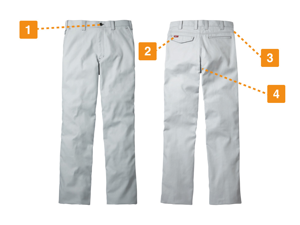 着る人を選ばないシンプルなノータックパンツは作業の邪魔になりにくいスタイリッシュなデザインのため、体型や年代などを選ばず、誰でも着用いただけます。タックを取っていないので、作業パンツとして主張しすぎず、別シリーズのシャツやジャンパーと合わせても違和感がありません。バックポケットには「Jawin」の赤いワンポイントが付いており、デザインのアクセントにもなっています。同シリーズ共通の4色展開となっているので、他のアイテムと同色で合わせて着用するだけでなく、あえてカラーを変えた組み合わせも可能です。