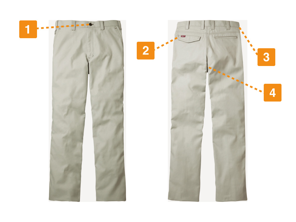 ノータックパンツはシンプルなデザインでありながら、生地から細かな仕様までこだわったワーキングウェアです。生地にはCVCドビーと呼ばれる、綿とポリエステルの混紡素材を使用しています。綿を70%使用しており、さらにドビー織によって独特な風合いと柔らかい手触りのパンツに仕上がっています。肉厚な生地なので生地も丈夫で、長い期間履き続けることが可能です。加えて春夏仕様なので、作業着ながら軽い着心地となっています。