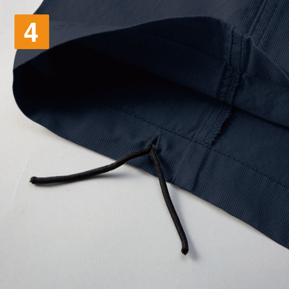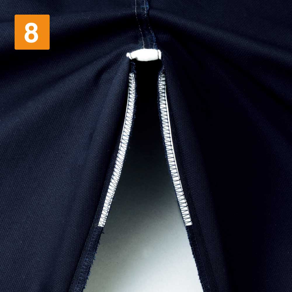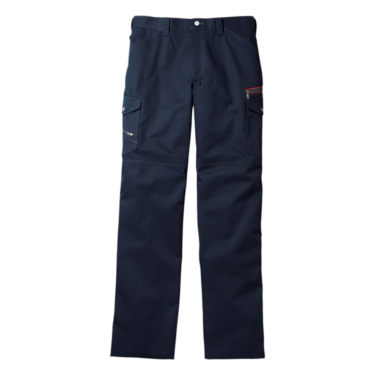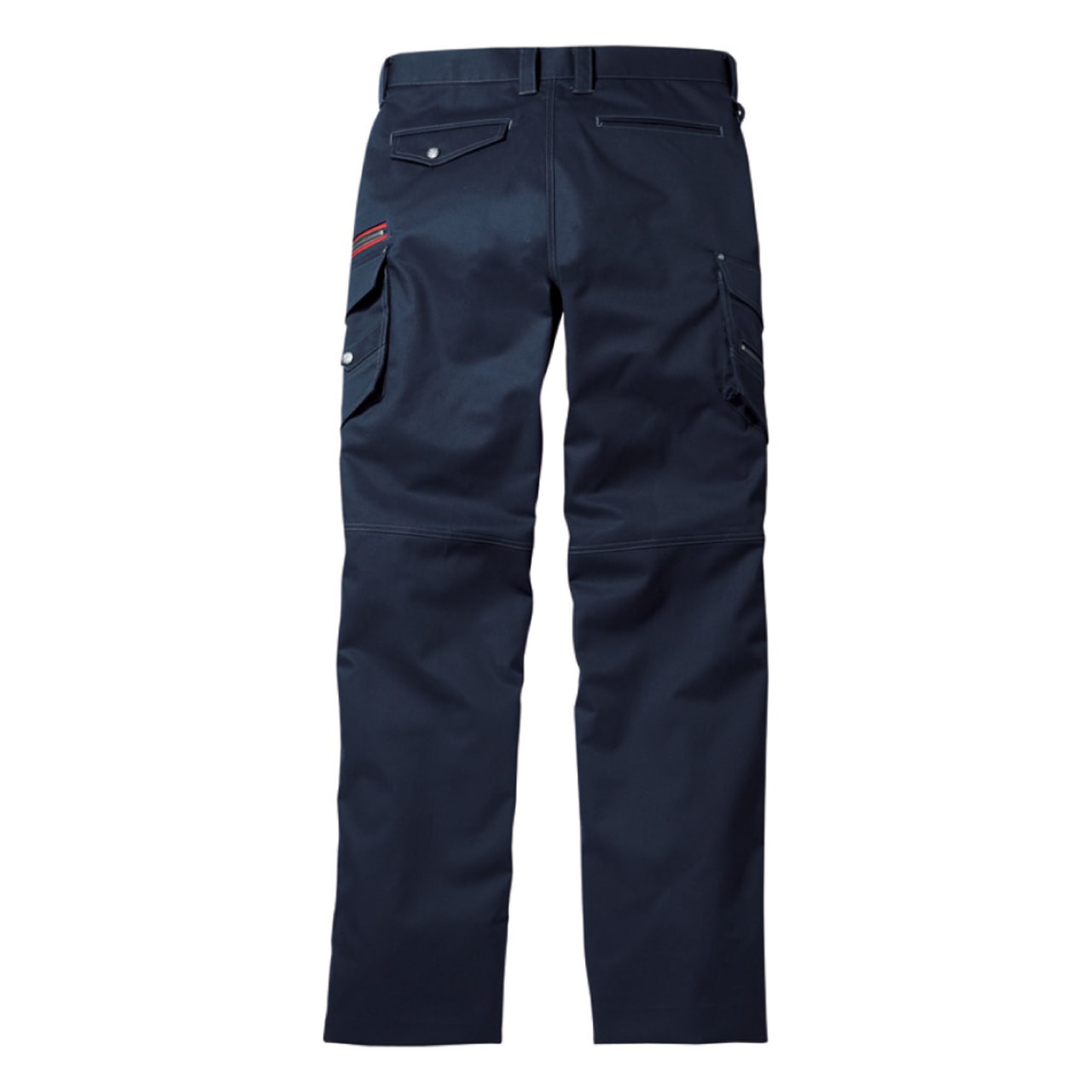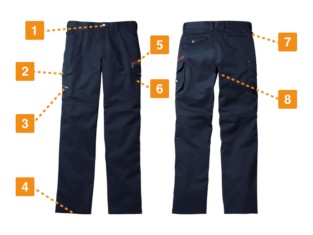 ノータックカーゴパンツは様々なアクセントパーツが光るパンツです。デザインボタンにデザインファスナー、アクセントカラーなど、ワークウェアにさらなるデザインを求める方にも最適な一着となっています。また、使用する機会の多いタックボタンは、使いやすい大きめのサイズを採用。裾には紐を通す穴があるので、簡単に長さが調節できます。現場に合わせて調節しやすいので、働く環境や業種を選ばずに着ることができます。