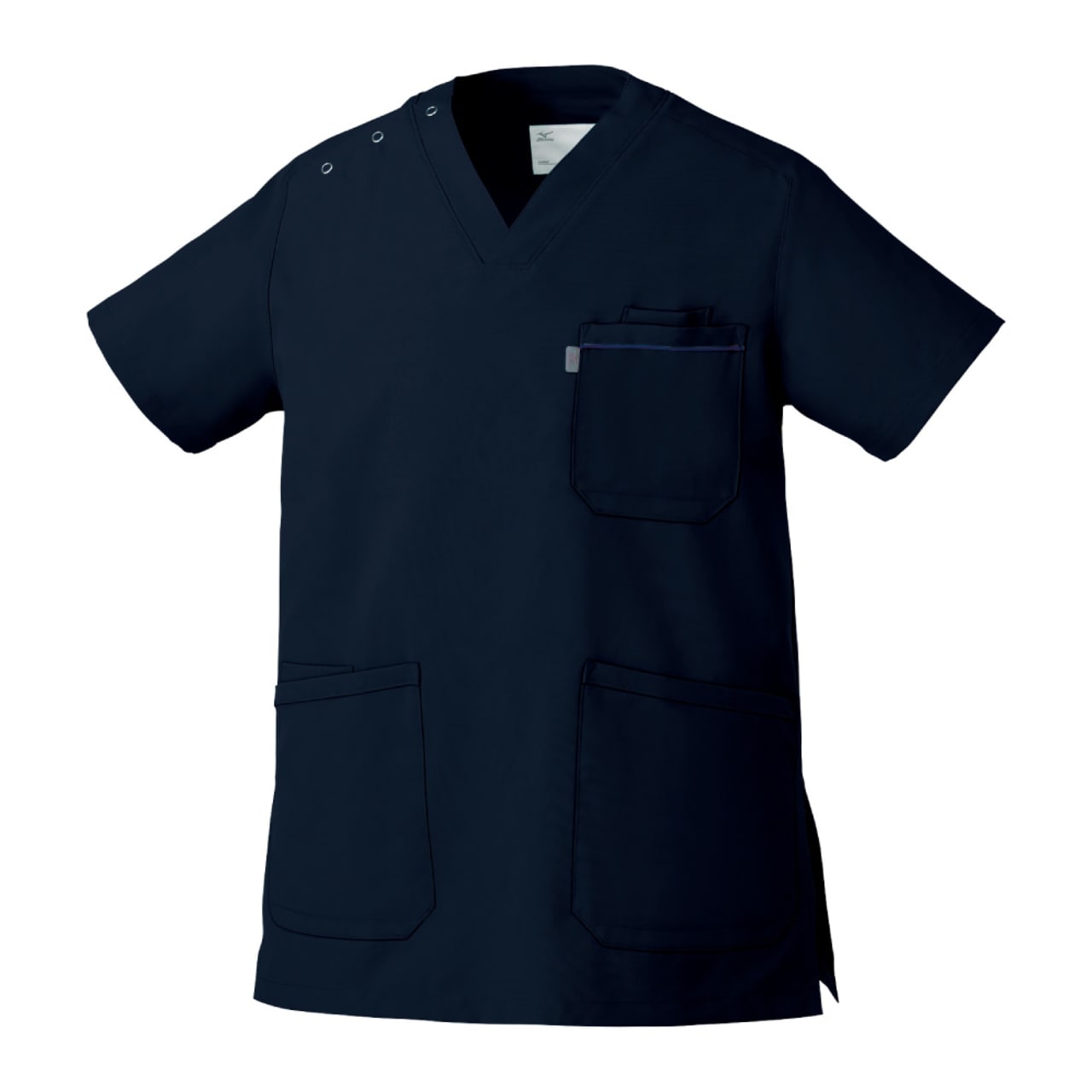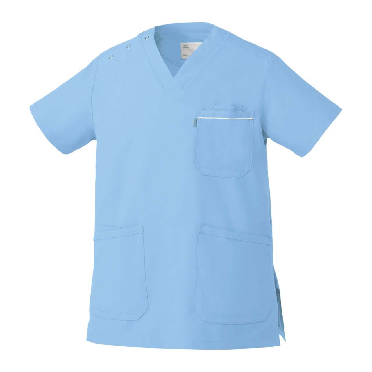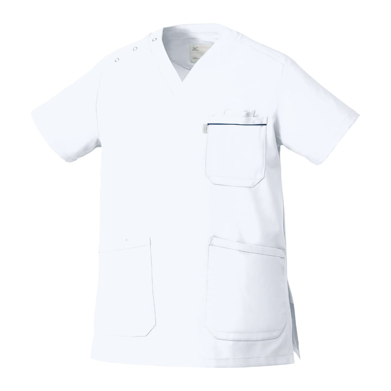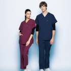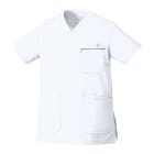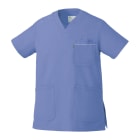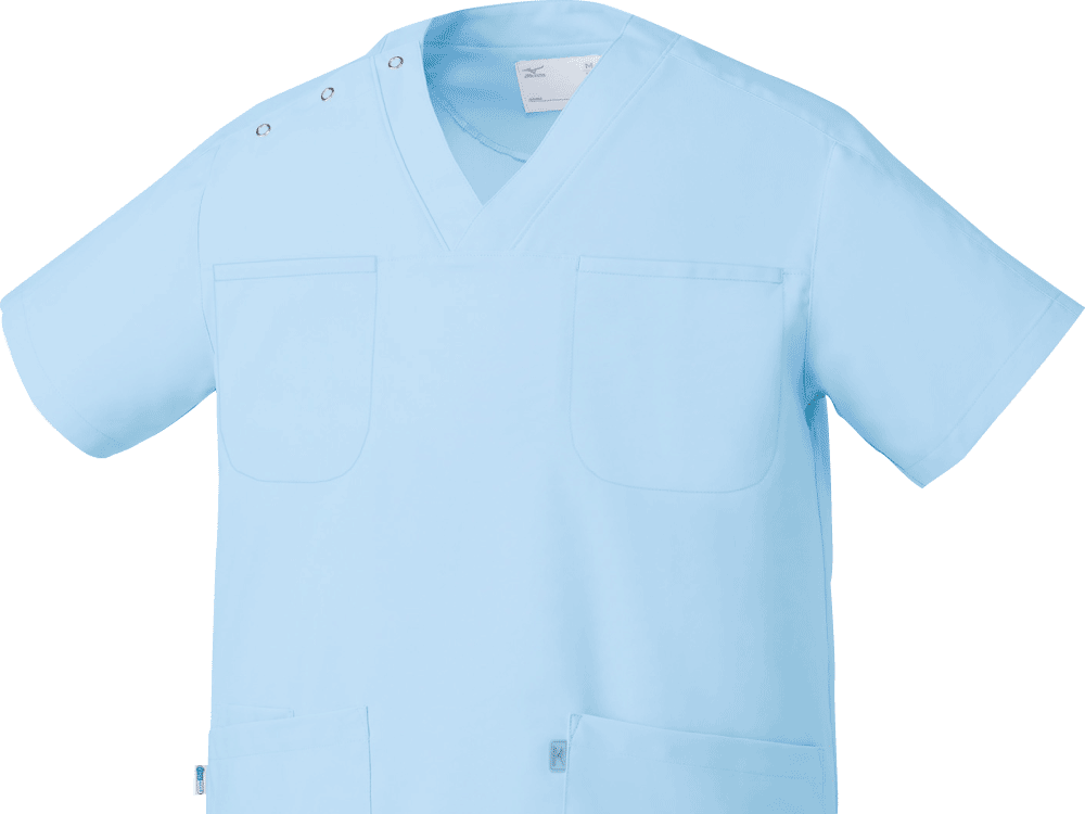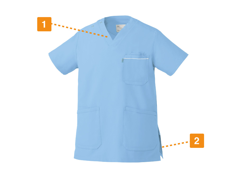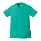 胸元・腰回りが見えない「エチケット機能」が特徴の「ミズノ」の男女兼用スクラブです。胸ポケットに物を入れていても、かがんだ時に胸元が見えないだけでなく、さらに長めの着丈で、かがんでも腰回りやインナーが見えない設計になっているので、アクティブワークの方にはおすすめです。また、SEK(赤)認証の制菌加工が施されているので、繊維上の細菌の増殖を抑制、清潔感をキープ。透け防止機能のほか工業洗濯対応と、大変優れたウエアです。