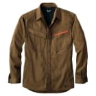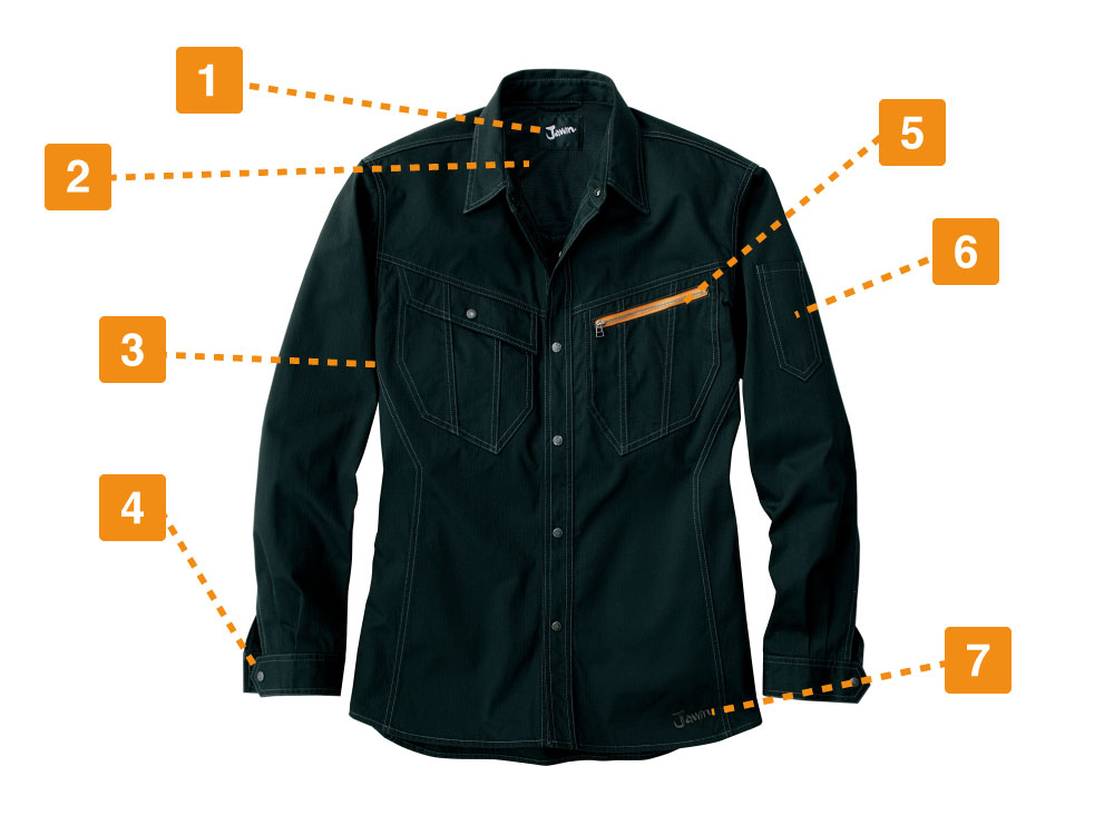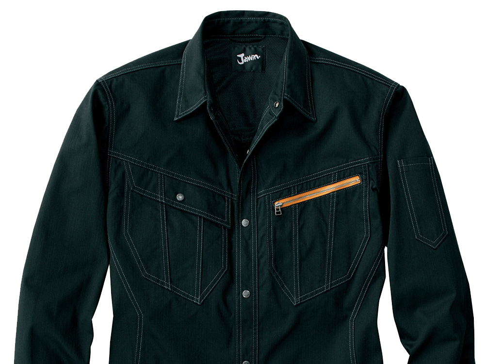 51900シリーズの長袖シャツは、存在感があるエッジの効いたシャープなデザインが特徴のラインです。生地には適度なボリューム感がある綿100%のランダムコードを使用しています。不規則な織り柄が特徴で、着こむほどに味が出るスタイリッシュさがあり、同シリーズのノータックカーゴパンツとのコーディネートが可能です。綿100%なので通気性・吸水性が良く、快適に作業できます。また、肌触りがソフトで、長時間着ていても不快に感じにくく、火の粉や熱にも強いです。洗濯にも強く丈夫で、長く着続けることで味わい深さも増していくでしょう。