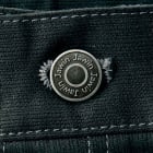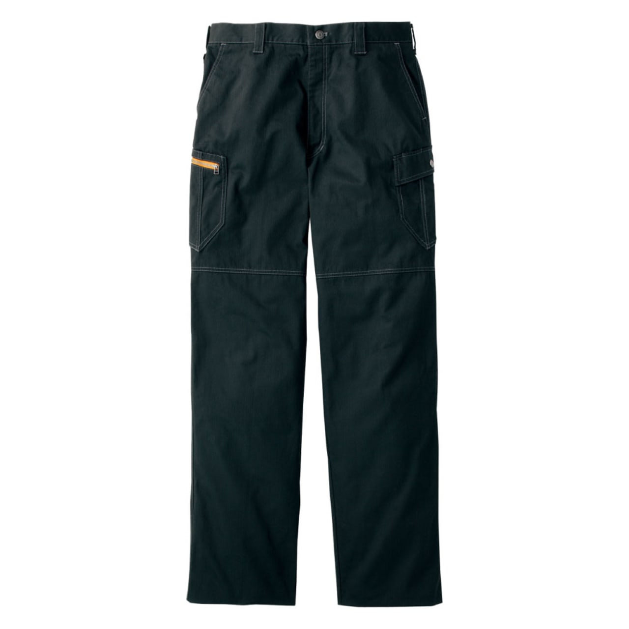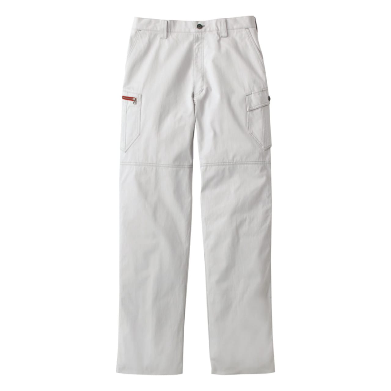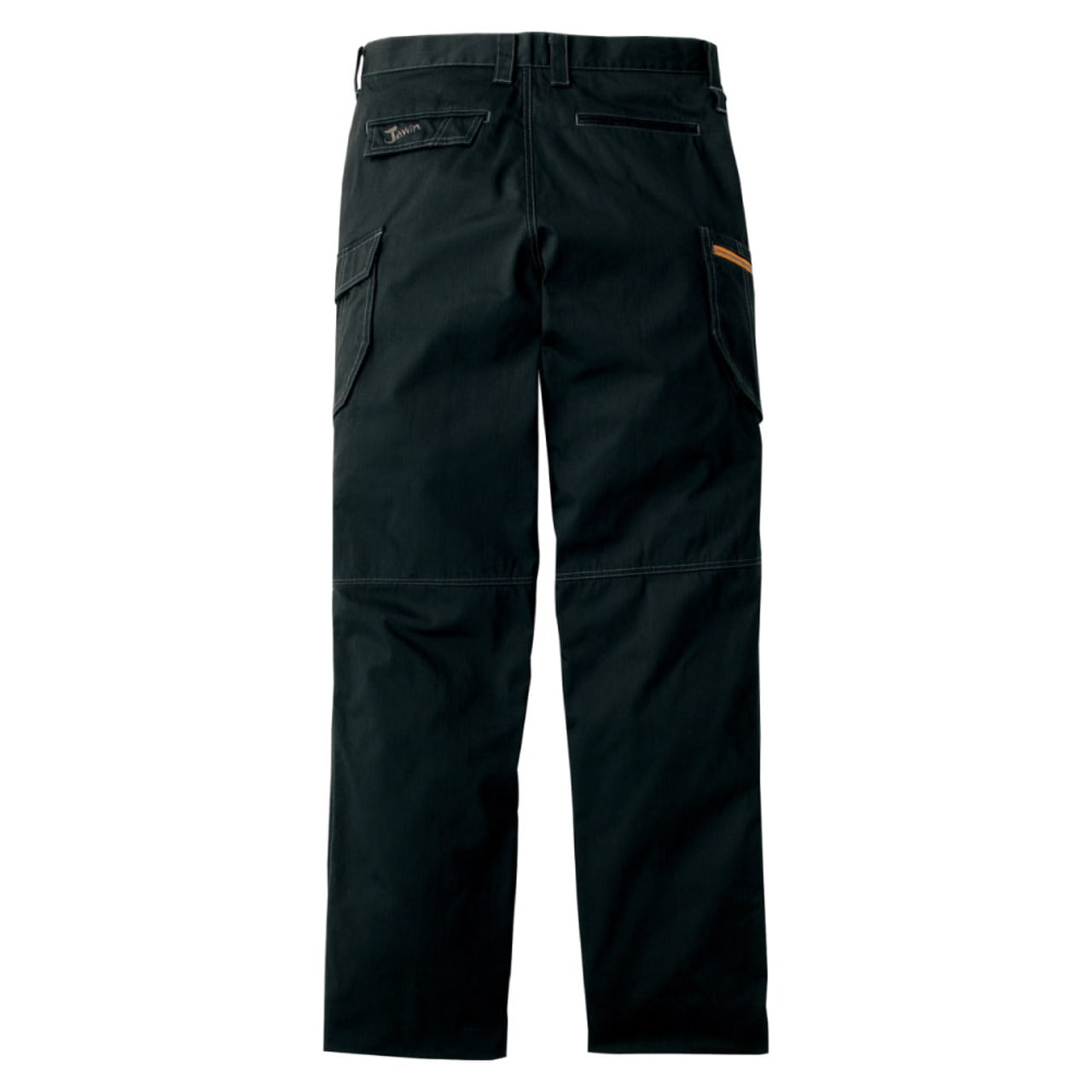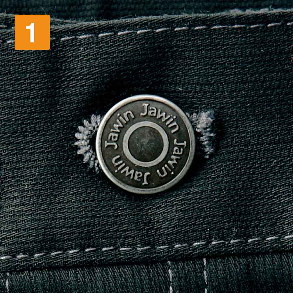 自重堂のノータックカーゴパンツは、キリっとしたシャープなデザインが印象的です。存在感があり、エッジが効いたスタイリッシュな作業着ズボンで、年代を問わずに着用できます。生地に適度なボリューム感があり、洗濯にも強いので長く着てこそ味わい深くなる一着と言えます。ノータックなので無駄なブカブカ感がなく、すっきりと履きこなせて、全体としてスッキリとしたカッコよさがあります。ディテールにもこだわっていて、フロントのタックボタンやサイドのデザインボタンもオシャレです。左バックポケット部分にはロゴ刺繍が施されています。