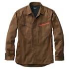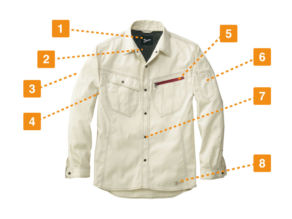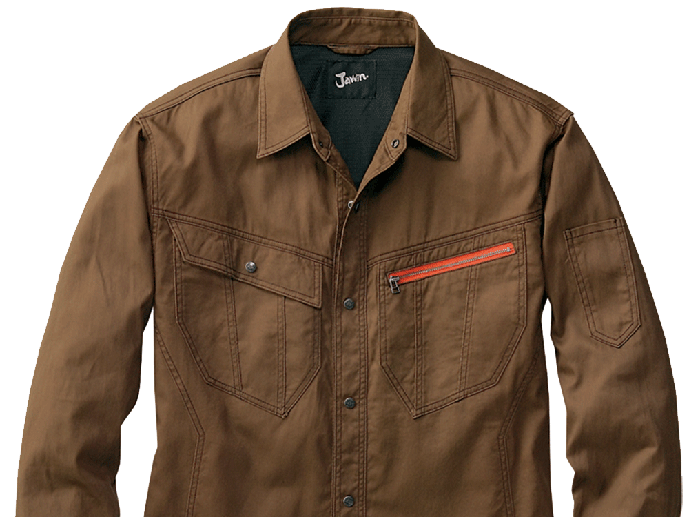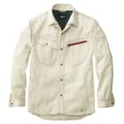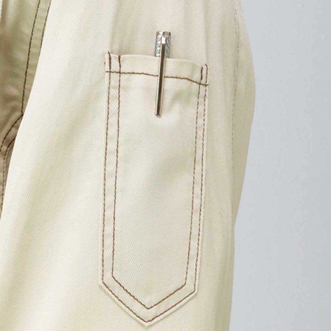 春夏対応の長袖シャツは、素材にシャークスキンと呼ばれる織り方の生地を導入しています。シャークスキンはスーツにも採用されている織り方であり、近くで見た時の印象と、遠くから見た時の印象が違ってきます。ワークウエアというとあまりスマートな印象を持たないというのがこれまでの常識でしたが、シャークスキンを採用することで、カジュアルテイストなのに、大人の洗練されたデザインを表現できるようになりました。カラー展開はアイボリー、スチールグレー、キャメルの3色。落ち着いたカラーリングで、さまざまな風合いを楽しめます。