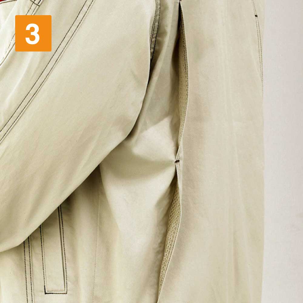 長袖シャツには綿以外にも背当てや背中部分にメッシュ素材を採用しています。メッシュ素材の大きな特徴は、大きな網目織りによって生まれる通気性の良さです。春夏というと、どうしても汗の量が気になってきますが、メッシュ素材を用いたベンチレーションを取り入れることで、通気性が格段に向上。例えたくさん汗をかいたとしても、素早く乾かせるようになっています。また、長袖シャツには消臭&抗菌テープが両脇や両肩に取り付けているため、これまで気になっていたにおいも抑える効果が期待できます。