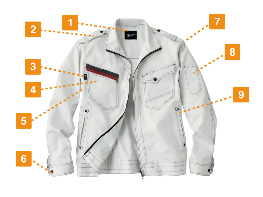 スタイリッシュなミリタリー風デザインと、抜群の機能性を誇る自重堂の長袖ジャンパー。メッシュ仕様の背中ベンチレーションのおかげで、抜群の通気性を誇ります。使い勝手のいい3色のカラー展開と、豊富なサイズで着る人を選びません。また、ポケットなどの収納も充実しており、二重ポケットやペン差しなど、仕事に役立つ機能が満載で、利便性に優れています。軽さとタフさを兼ね備えた素材CVCブロークンドビーを生地に使用しており、ハードな現場でも爽やかに着られる長袖ジャンパーです。